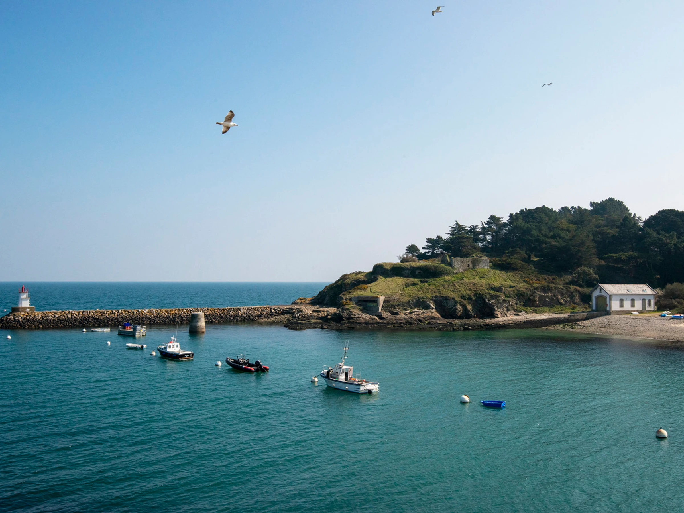 Dans la célèbre demeure de l'Hôtel Du Phare, ce studio offre une vue exceptionnelle sur la mer et la presqu'île de Quiberon, sur le port de Sauzon et son phare.