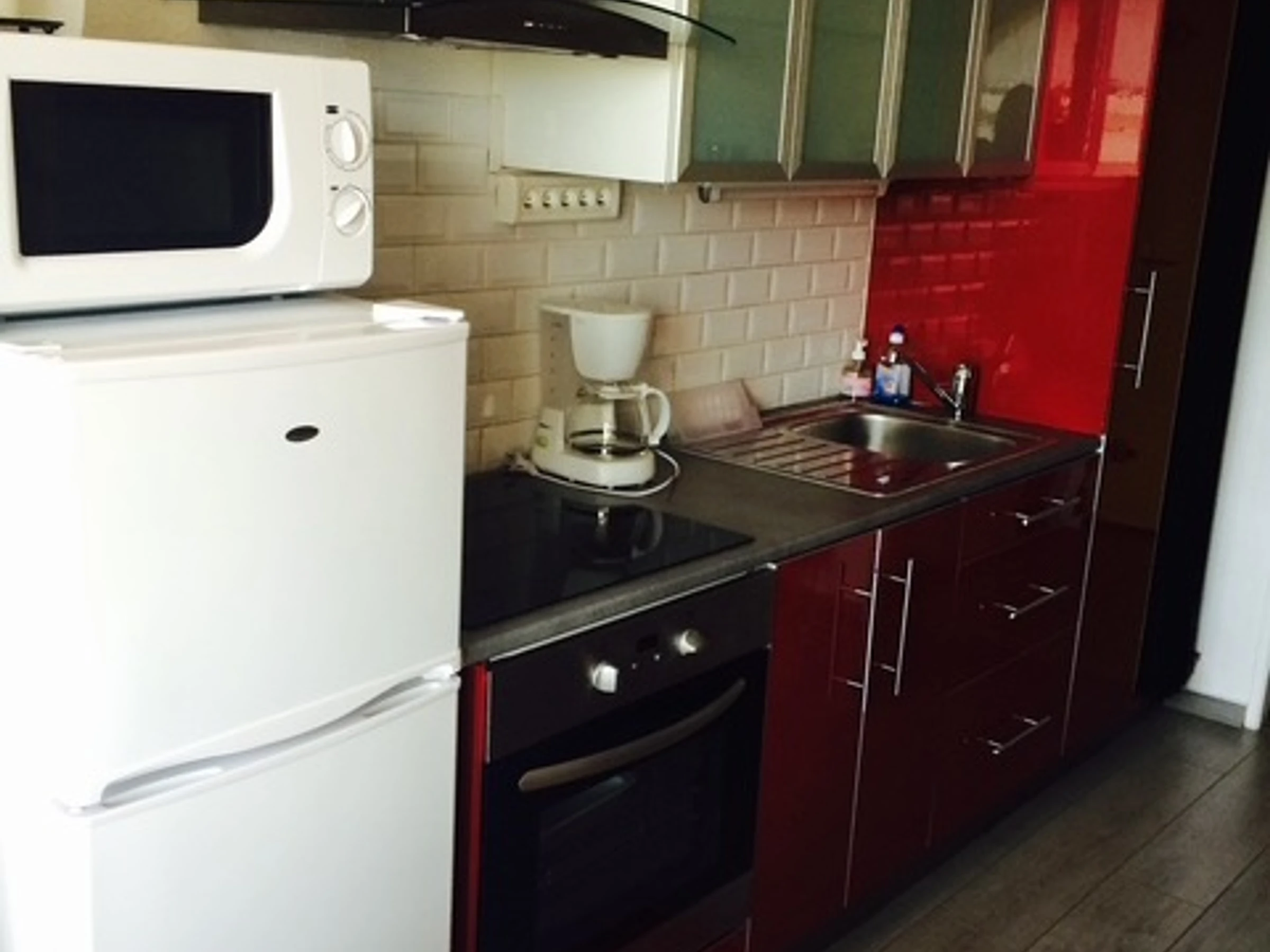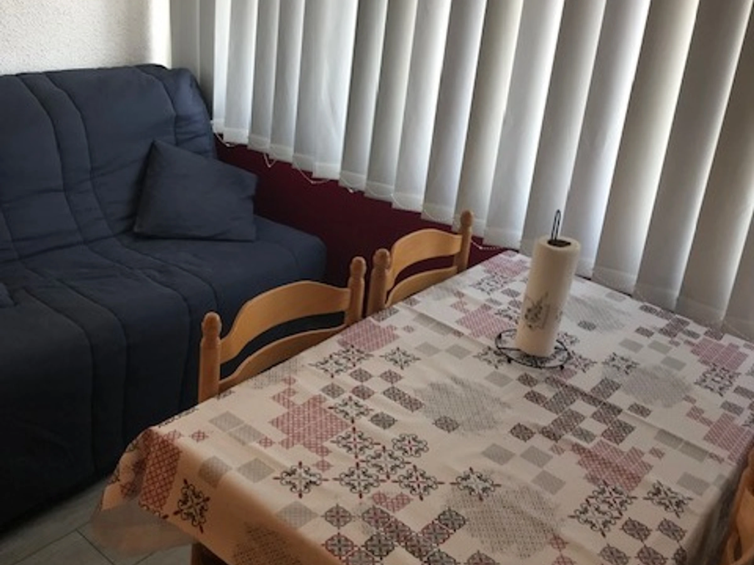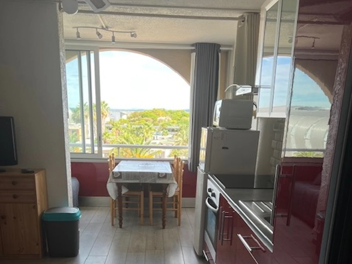 Vacation Rental in Sète: 15 m2 studio + 5 m² glazed loggia on the 3rd floor (with elevator) of a residence 500m from the sea and the beach and close to shops. The living room consists of 2 single beds plus a mezzanine bed, a television and storage, table and chairs. In the bathroom, you will find a shower, a sink and the toilet. The kitchenette is equipped with 2 induction hobs, fridge-freezer, microwave, oven, washing machine.