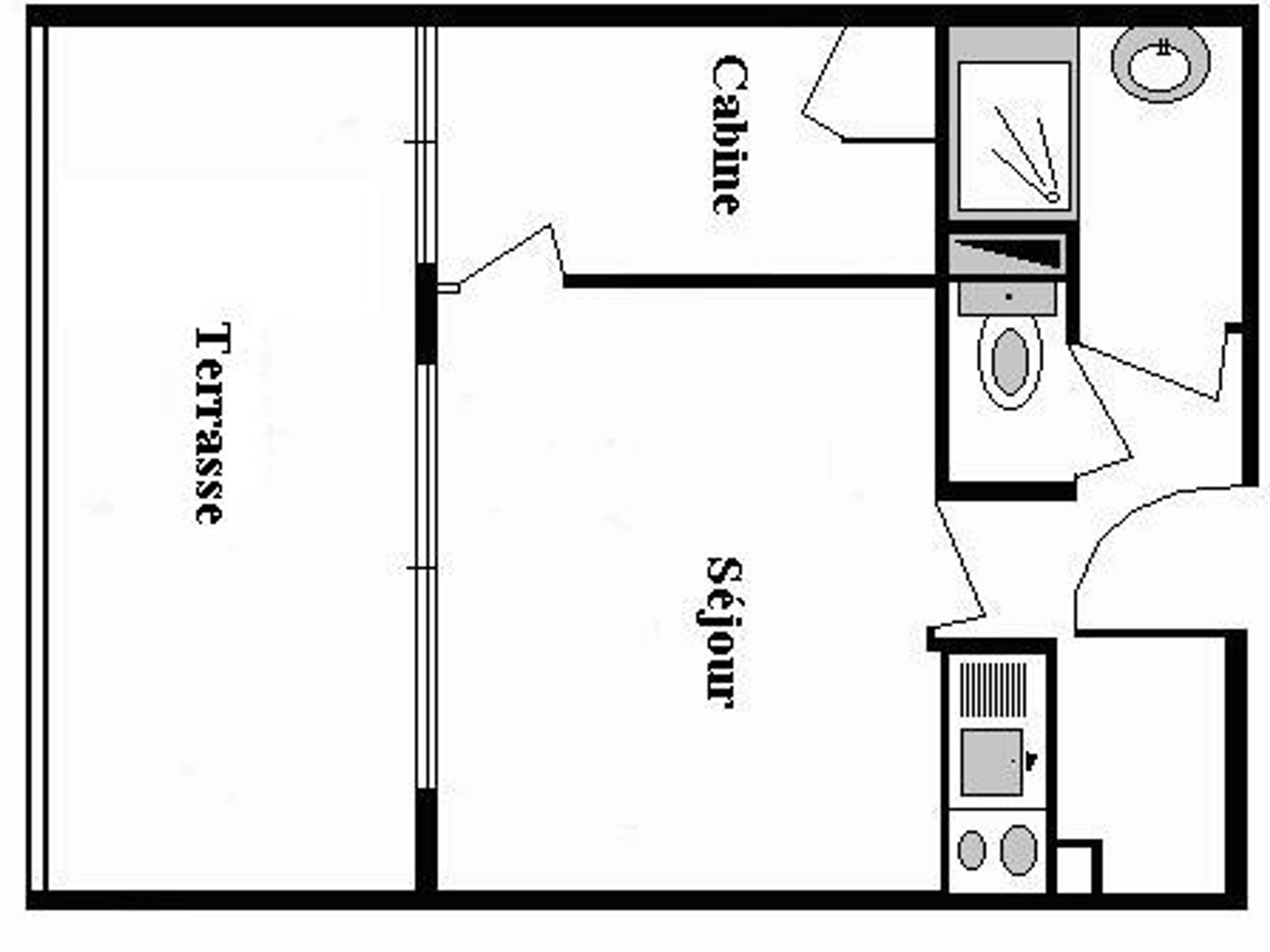 Rooms : the living room (1 double bed, 1 storage unit, TV), the kitchenette (2 hotplates, 1 fridge, 1 microwave oven) ; the cabin (bunk beds) ; the bathroom (1 shower, 1 washbasin) ; the toilets ; 1 terrace .