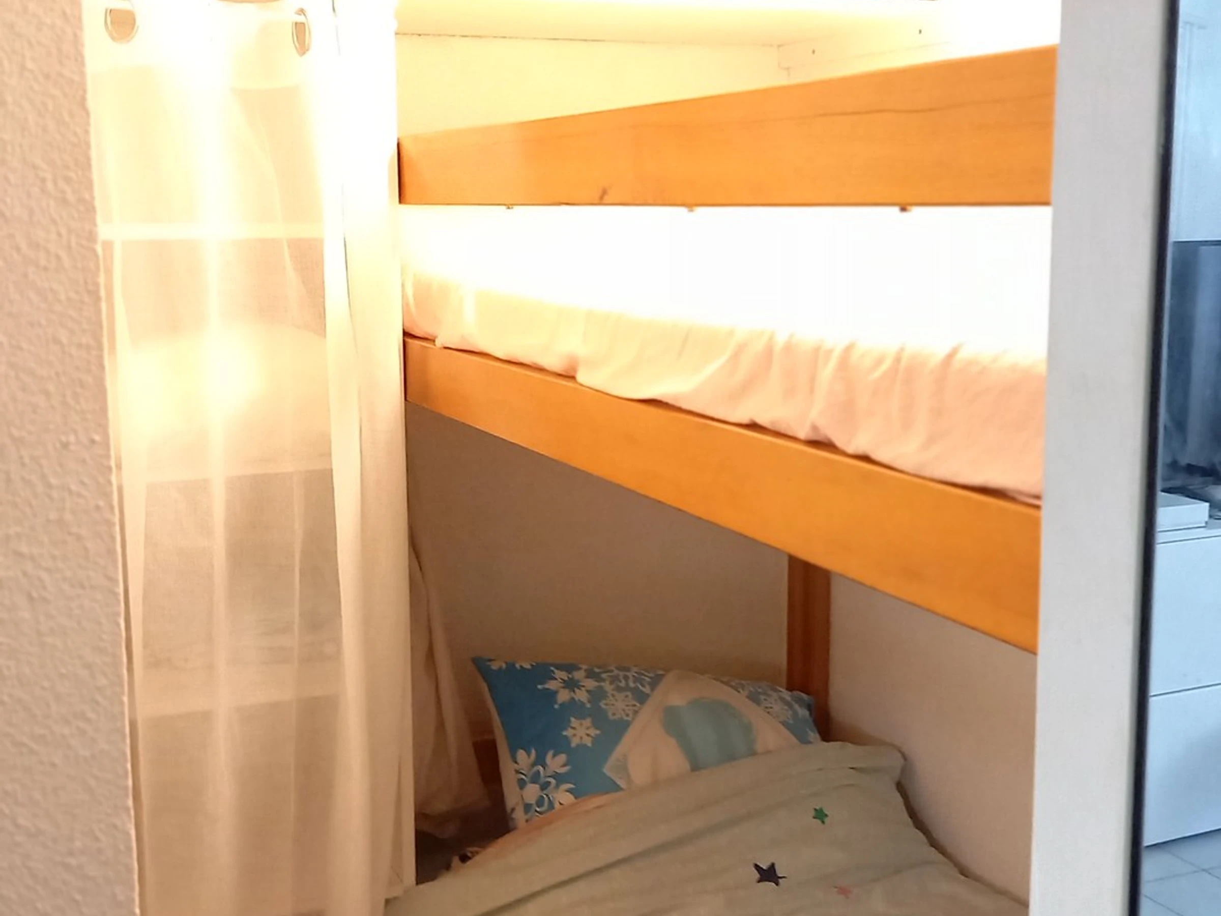 - equipped kitchenette (ceramic hob, fridge/freezer, microwave, washing machine) - bedroom with a double bed (120cm) + cabin area with two single bunk beds (90cm) - shower room with toilet