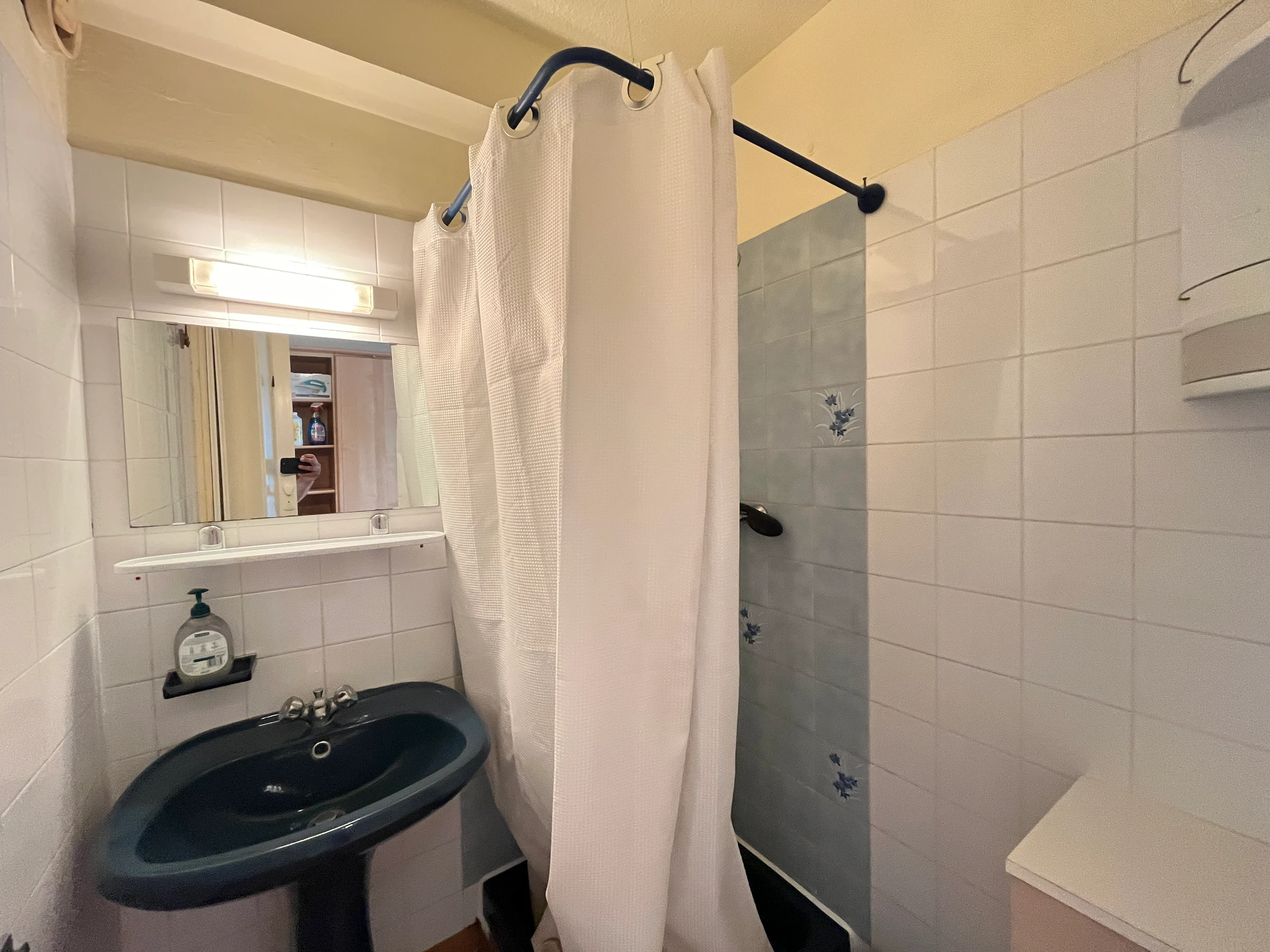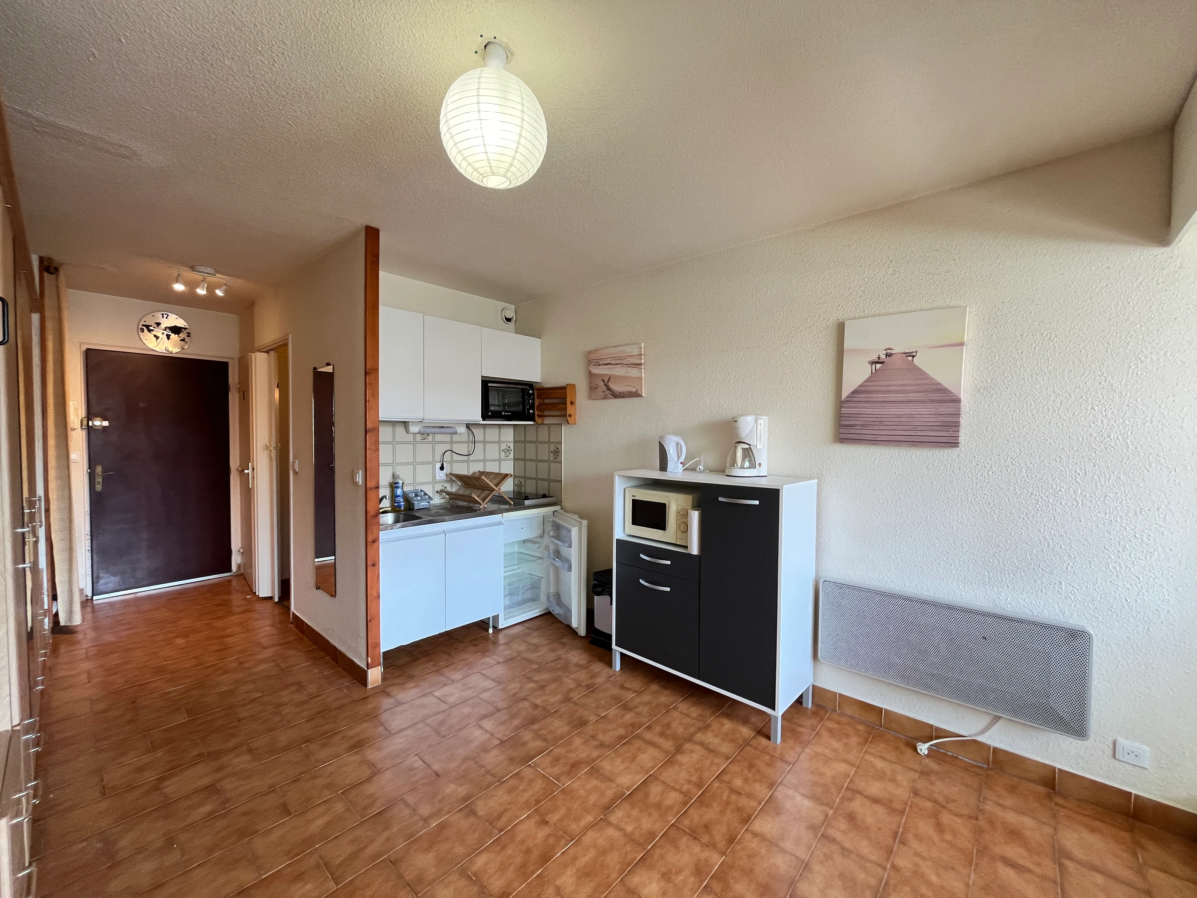 Holiday rental in Sète: Pleasant 19m² studio apartment with a glass-enclosed loggia overlooking the Canal des Quilles. Located on the first floor, it faces south. The beaches are 600m away and shops are nearby. The apartment includes a living area with a kitchenette (two-burner cooktop, refrigerator, microwave), a fold-down bed for two people, and a glass-enclosed loggia with a table, chairs, and a TV. The bathroom has a shower and sink. The toilet is separate. The apartment includes a parking space, number 31. Pets are not allowed. Late arrival is possible for €50 (please contact us for details). OPTIONAL services, subject to availability: bed linen rental (€15 per bed), towel rental (€12 per person), end-of-stay cleaning (excluding kitchen) €60, mini Wi-Fi box (€39/week). NOT INCLUDED: toilet paper, cleaning products, toiletries.