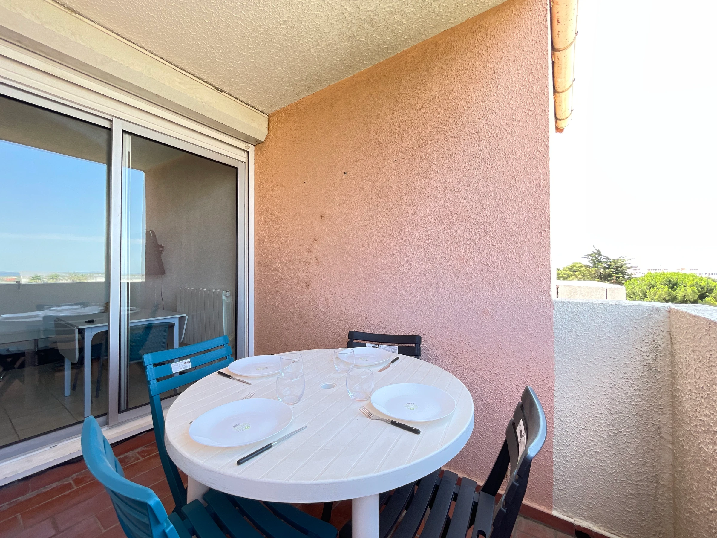 Holiday rental in Sète: Studio cabin of 23m² + terrace and open view in a pleasant residence near the beach. An air-conditioned main room with sofa bed giving a 120cm bed, table and chairs, television, storage space. A kitchen area with fridge/freezer, induction hob, microwave, washing machine. A cabin area with 2 bunk beds. Bathroom with sink and shower. Separate WC. A private and secure parking space at number 439.