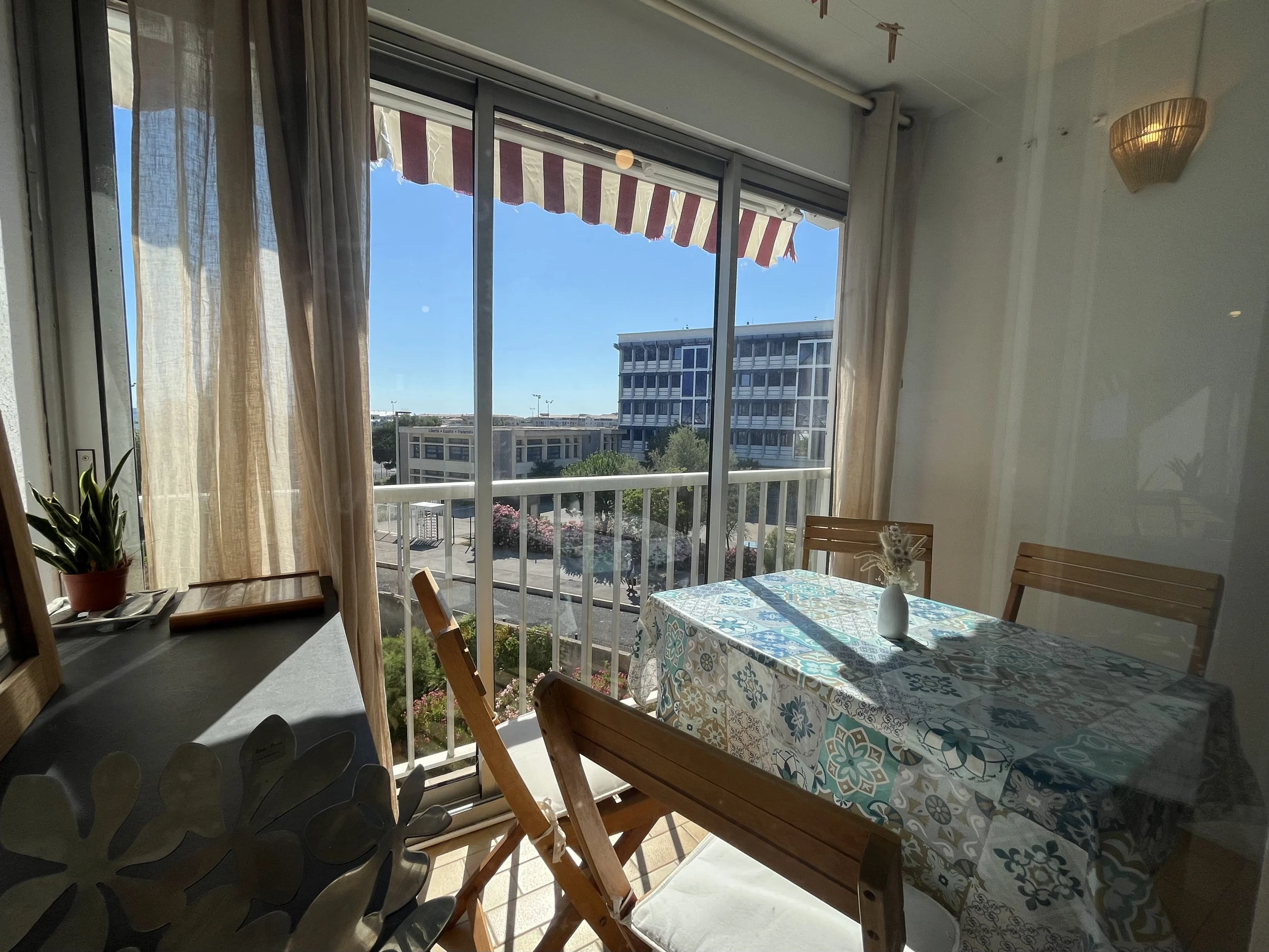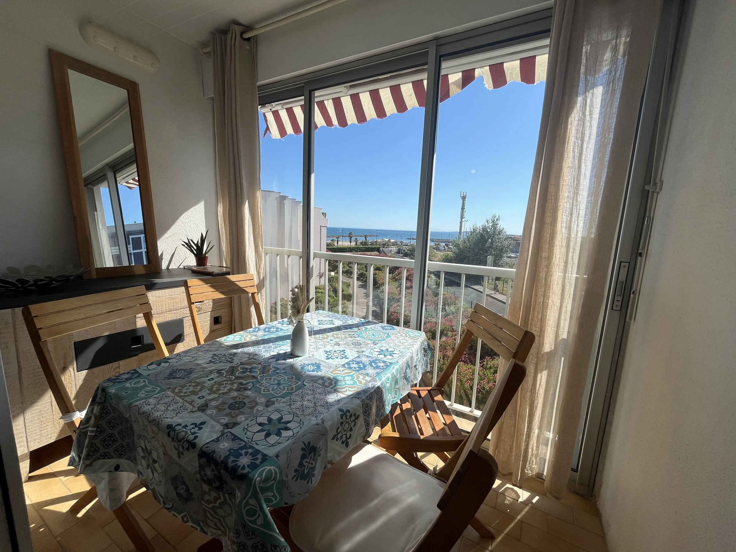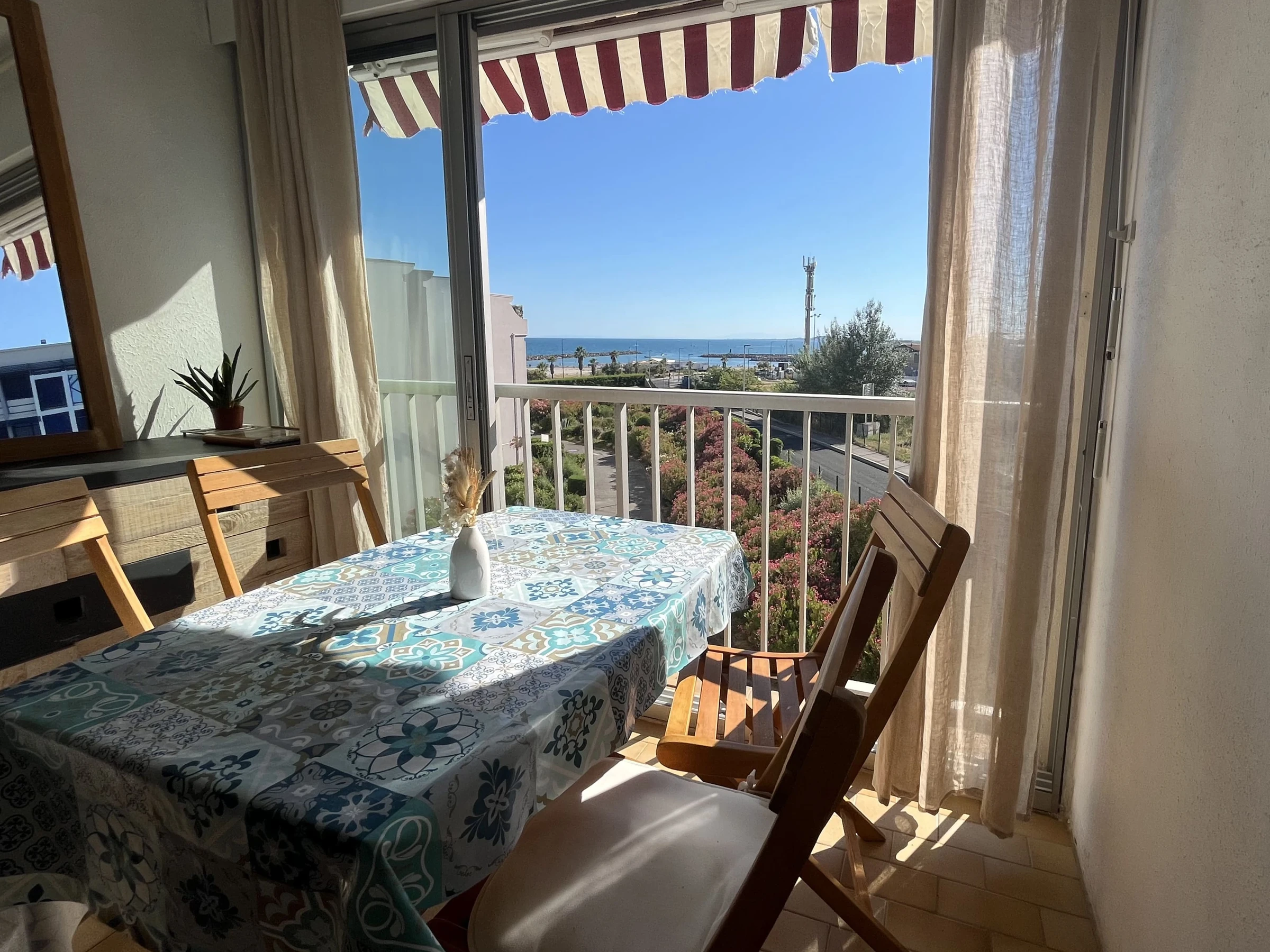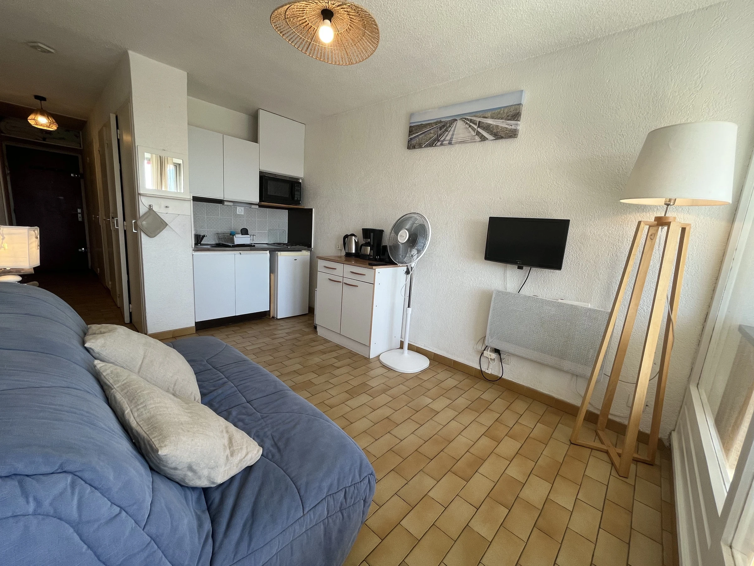 Holiday rentals in Sète: Very bright cabin studio of 21 m2, located in a residence facing the beach. From its loggia, you will have a view of the vegetation and the sea in the background. It is on the 3rd and last floor (with elevator). The beach is 30m away, and shops 400m away. The living room is made up of a convertible sofa, storage unit and television, an equipped kitchenette (2 electric hotplates, a fridge, a microwave, a washing machine.)