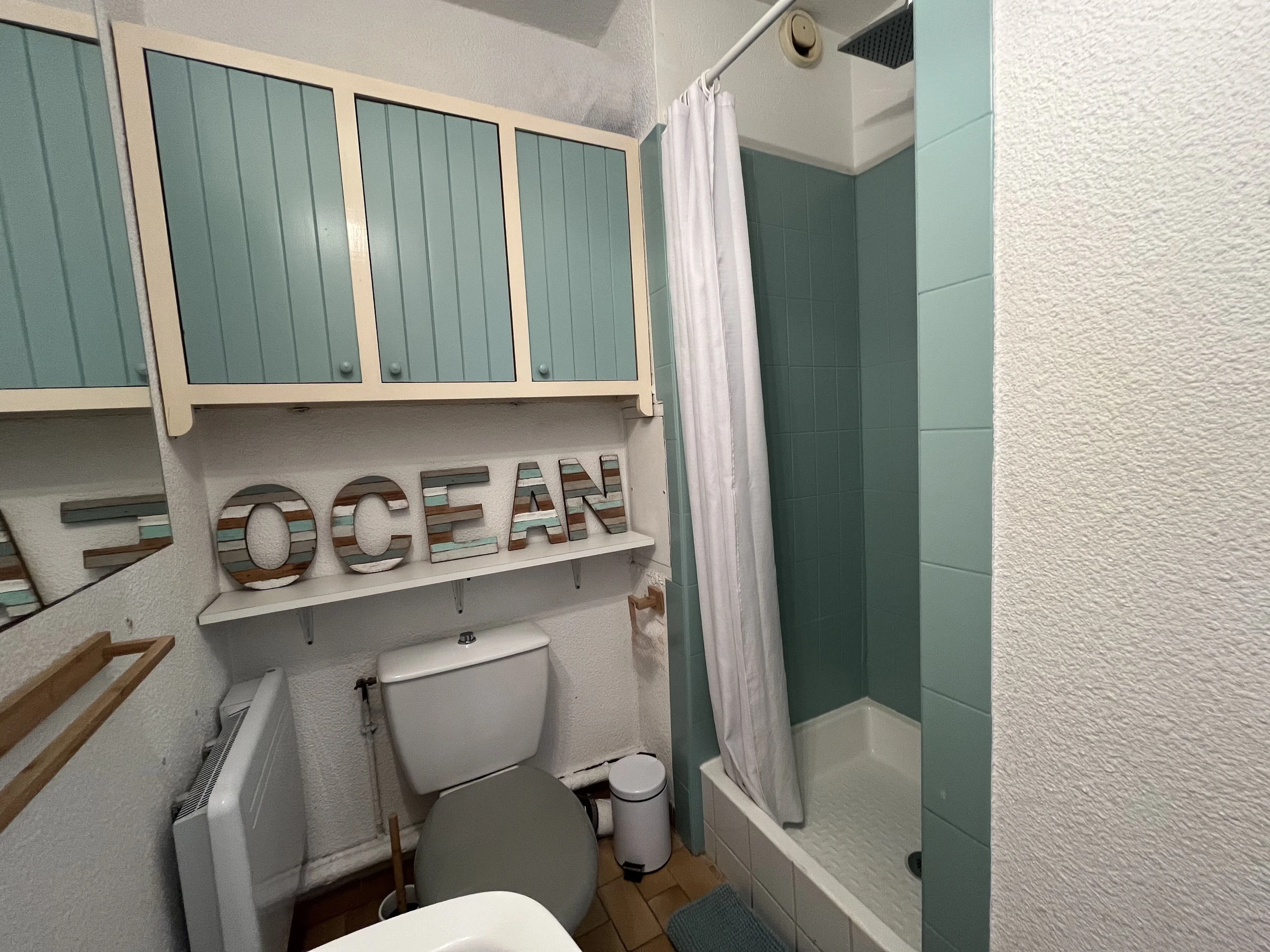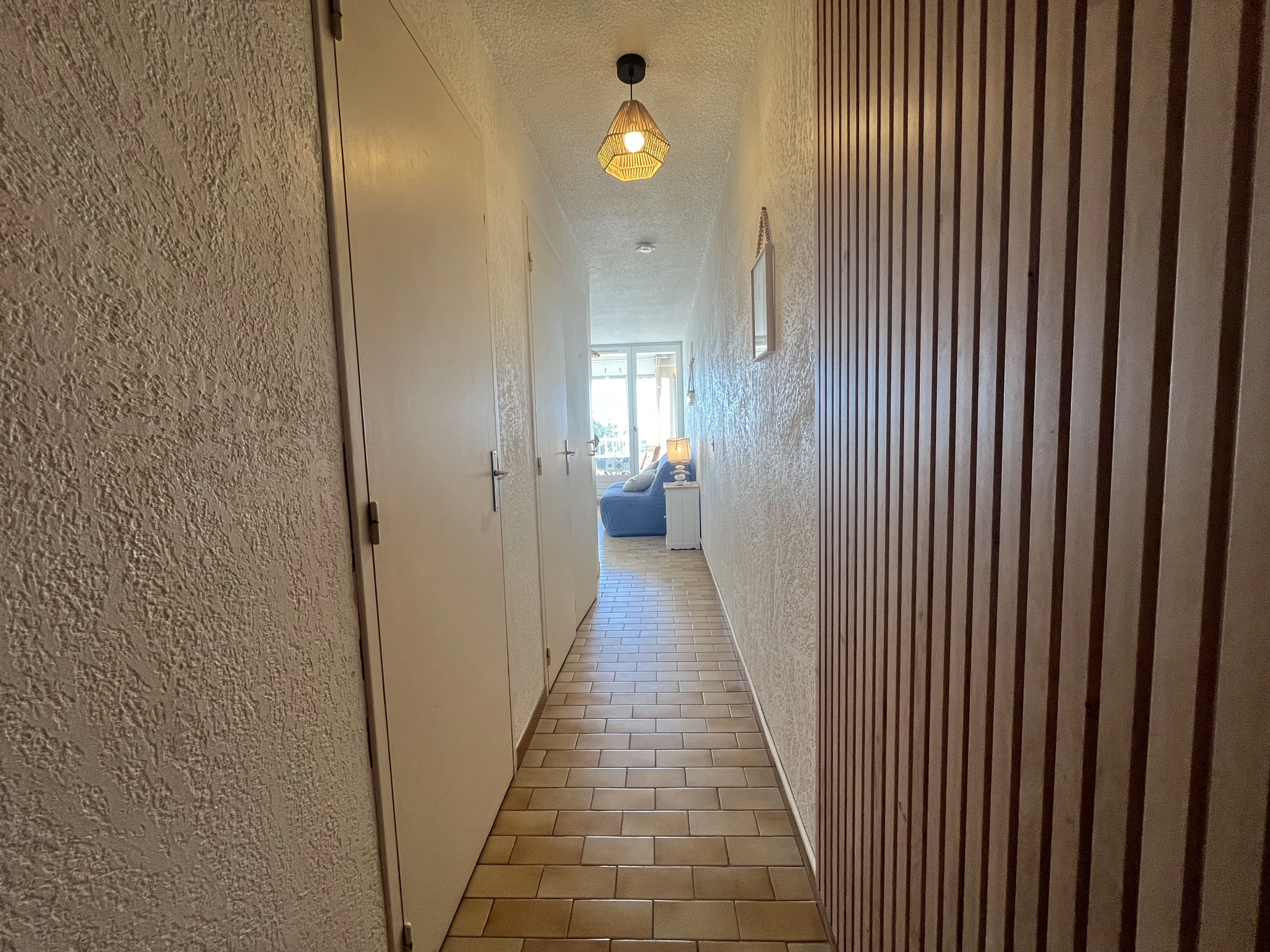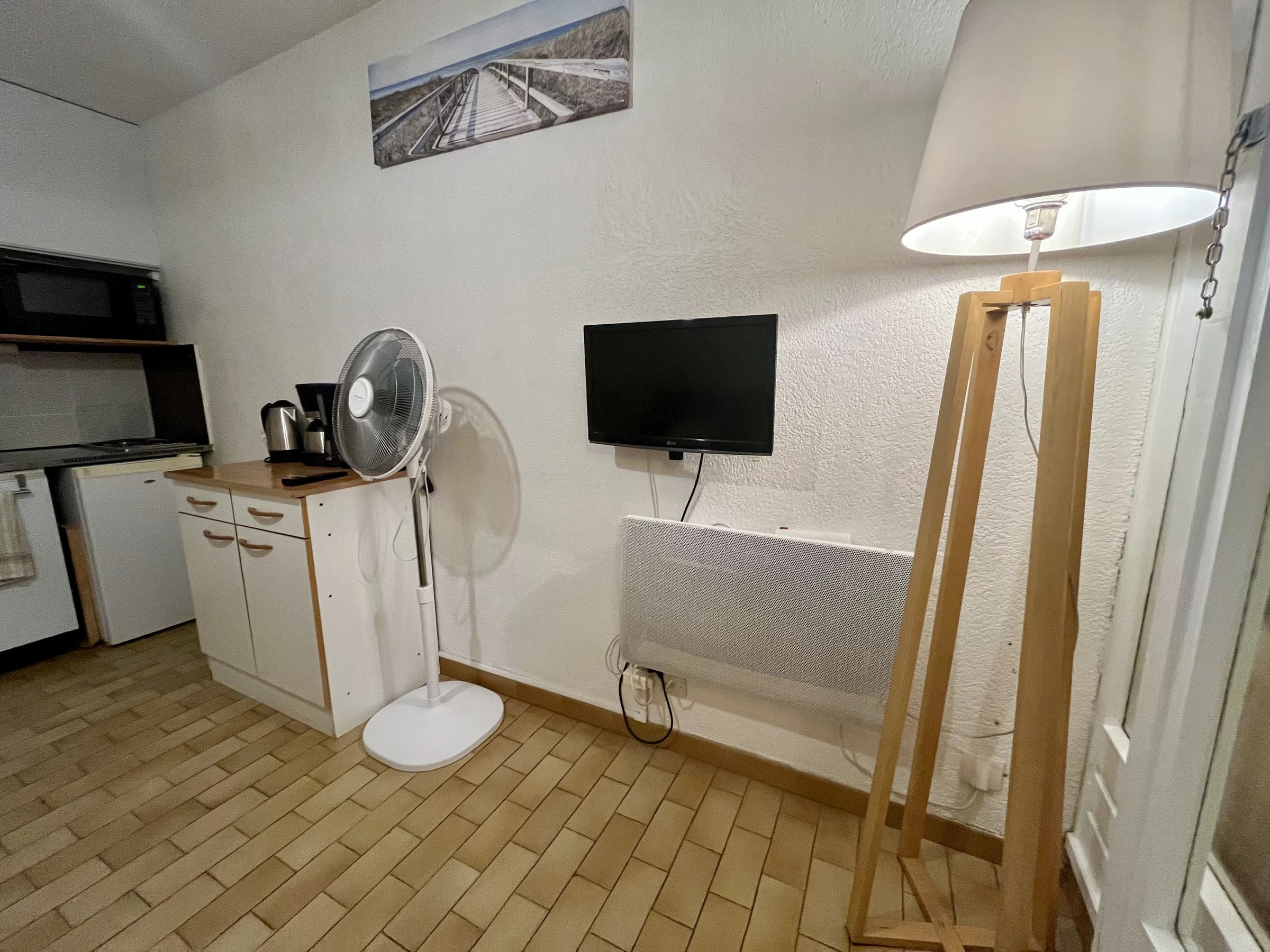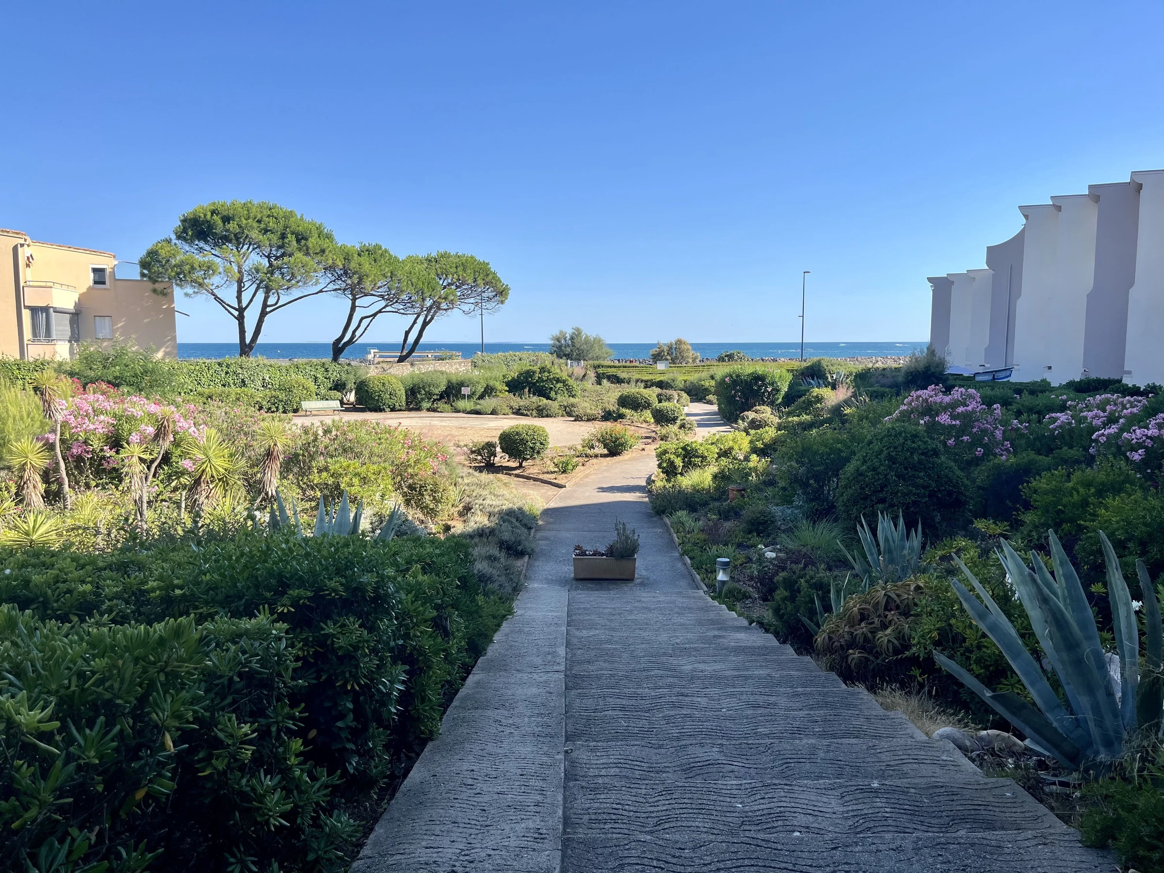 Holiday rentals in Sète: Very bright cabin studio of 21 m2, located in a residence facing the beach. From its loggia, you will have a view of the vegetation and the sea in the background. It is on the 3rd and last floor (with elevator). The beach is 30m away, and shops 400m away. The living room is made up of a convertible sofa, storage unit and television, an equipped kitchenette (2 electric hotplates, a fridge, a microwave, a washing machine.)
