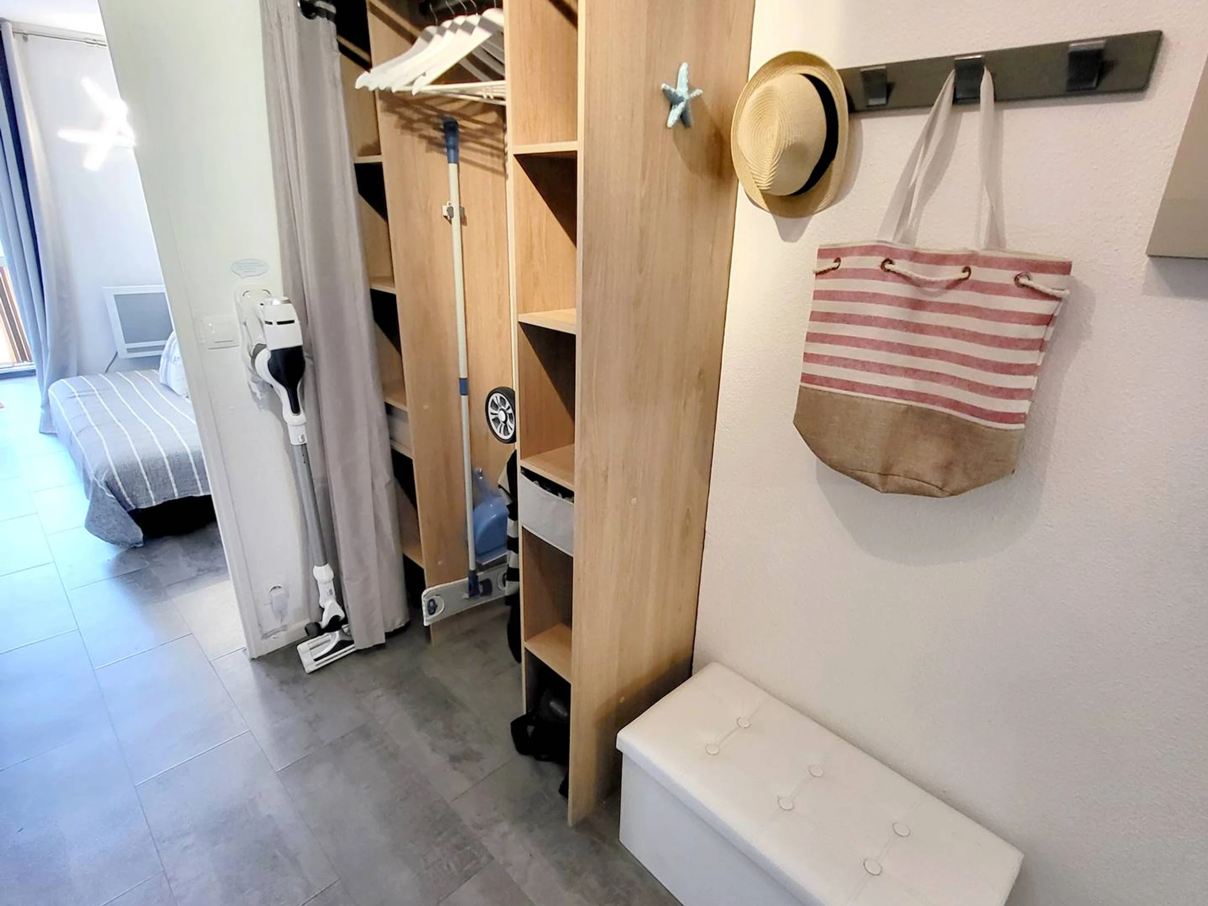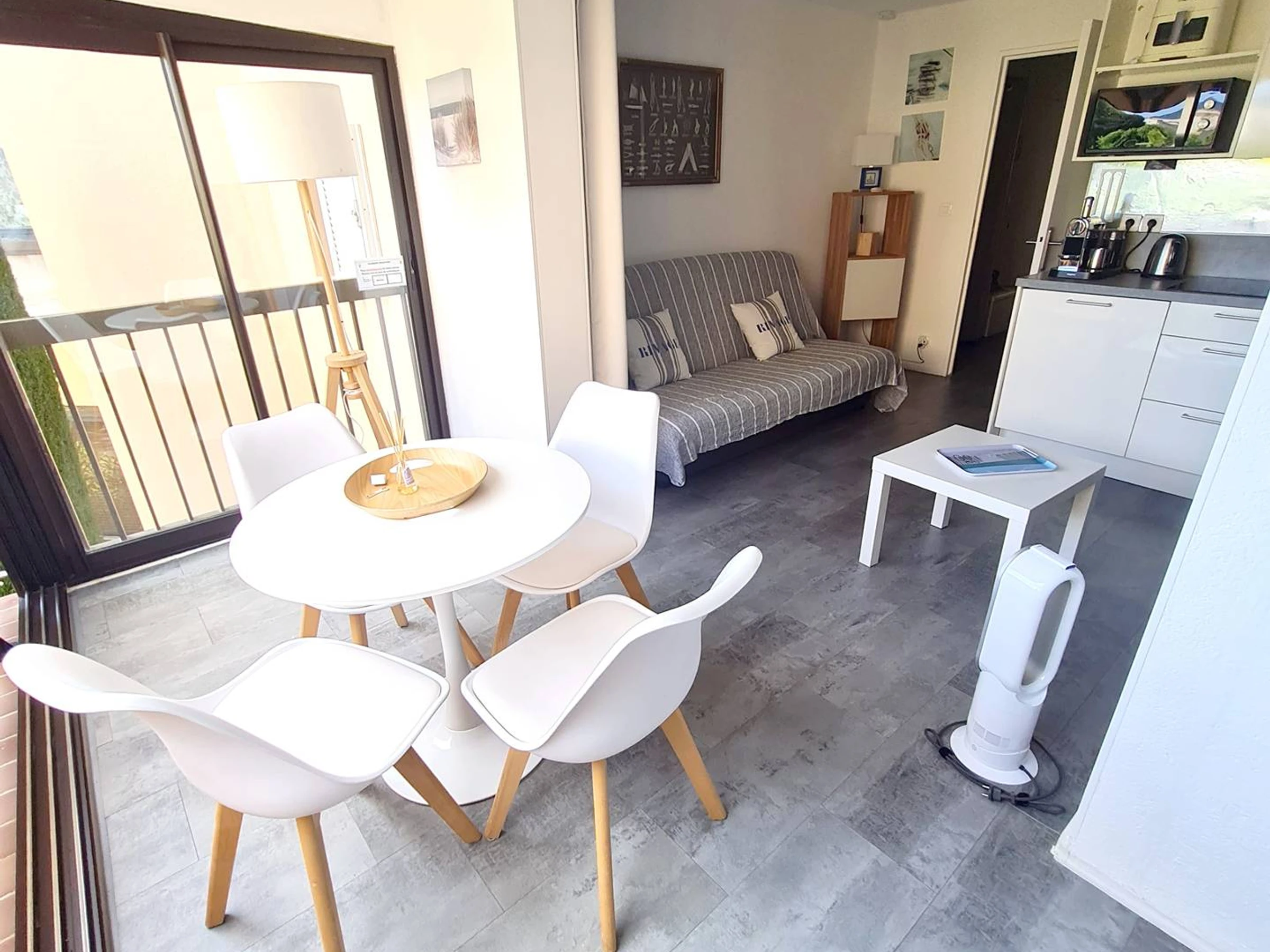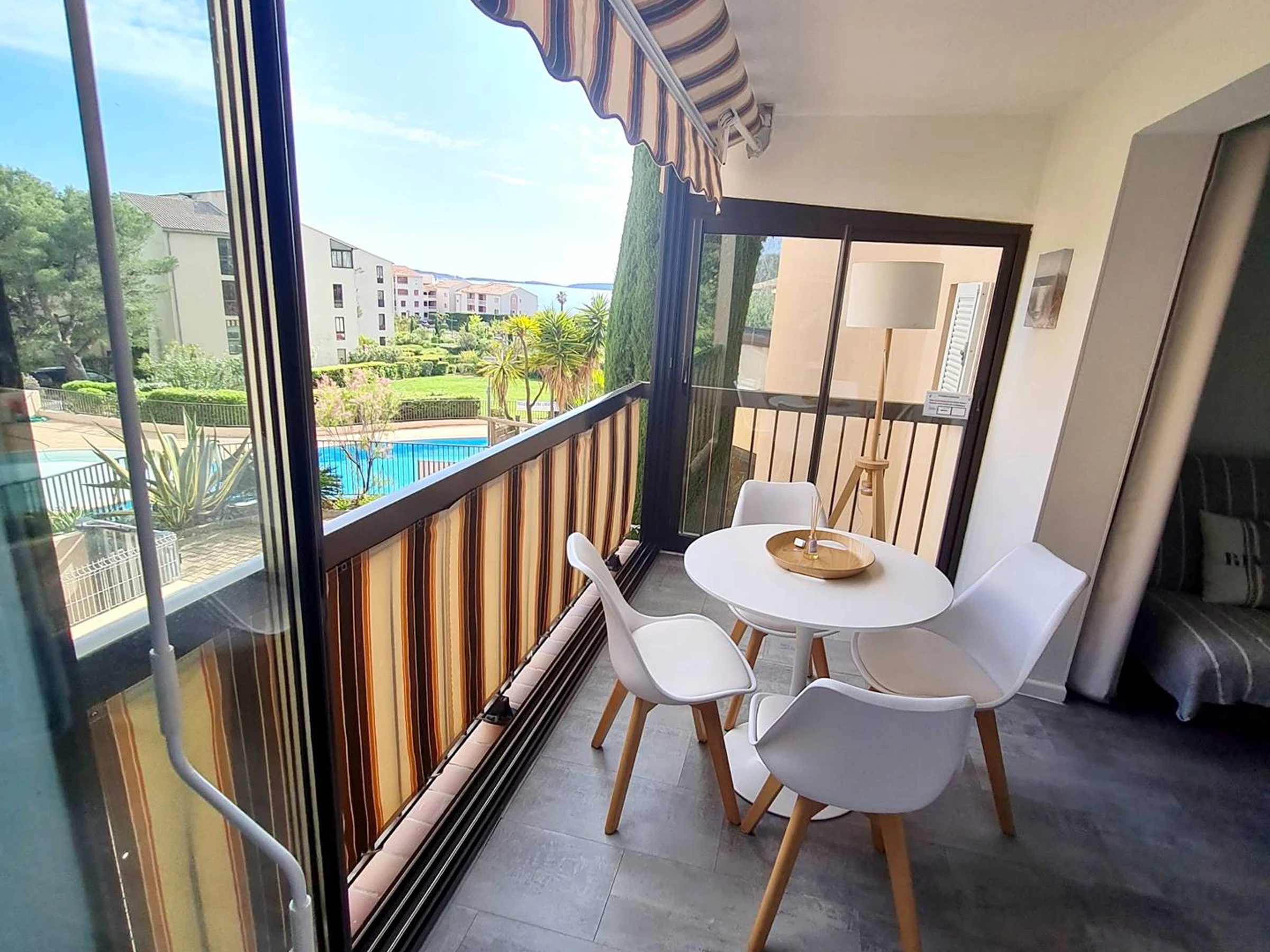 Loggia (8 m²) closed by sliding bay windows with awning, blackout curtain, garden table and chairs, 2 recliners, 1 oscillating tower fan and 2 pool loungers - Small side sea and pool view - Entrance with shoe rack and wardrobe/shelves - Equipped kitchen area (3-burner induction hob - Airfryer - refrigerator/freezer - dishwasher - microwave - Magimix capsule coffee maker - kettle - toaster - cordless wall-mounted vacuum cleaner) - Main room with 1 double sofa bed (140 cm), TV, soundbar, 1 Dyson fan (hot/cold) and 1 high chair - 1 bedroom with 1 double bed (140 cm) and TV - Bathroom with shower, single sink, hairdryer, washing machine and integrated toilet.