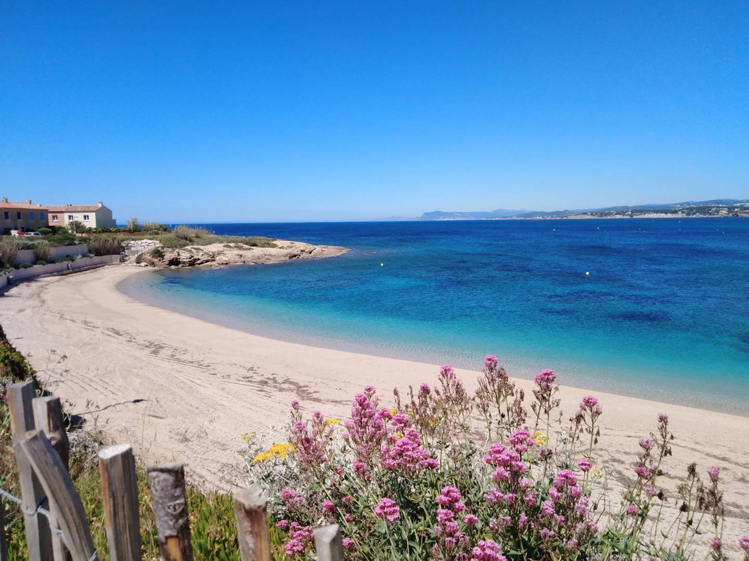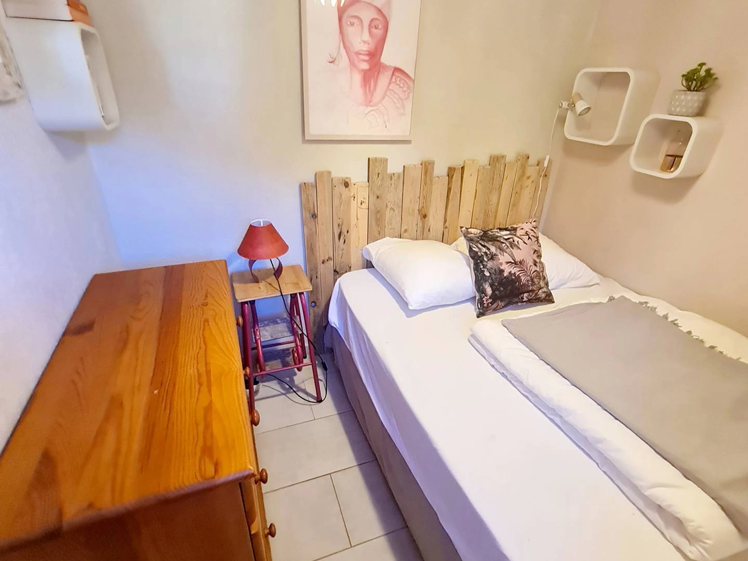 Open, north-facing terrace (9 m²) offering two small sea views with an exterior awning, electric roller shutter, garden table, 4 chairs, and 2 deckchairs. The kitchen opens onto the living room (refrigerator/freezer, 3-burner hob, dishwasher, washing machine, oven, microwave, Senseo coffee maker, kettle, toaster, and iron). The main room has a double sofa bed (new 140 x 18 cm comfort mattress), a TV, a ceiling fan, a relaxation area with a sofa, a dining area, an awning, and blackout curtains. The bedroom has a double bed (new 140 cm mattress), a chest of drawers, and an electric roller shutter. The bathroom has a walk-in shower, shower seat, hairdryer, heated towel rail, and an integrated toilet.