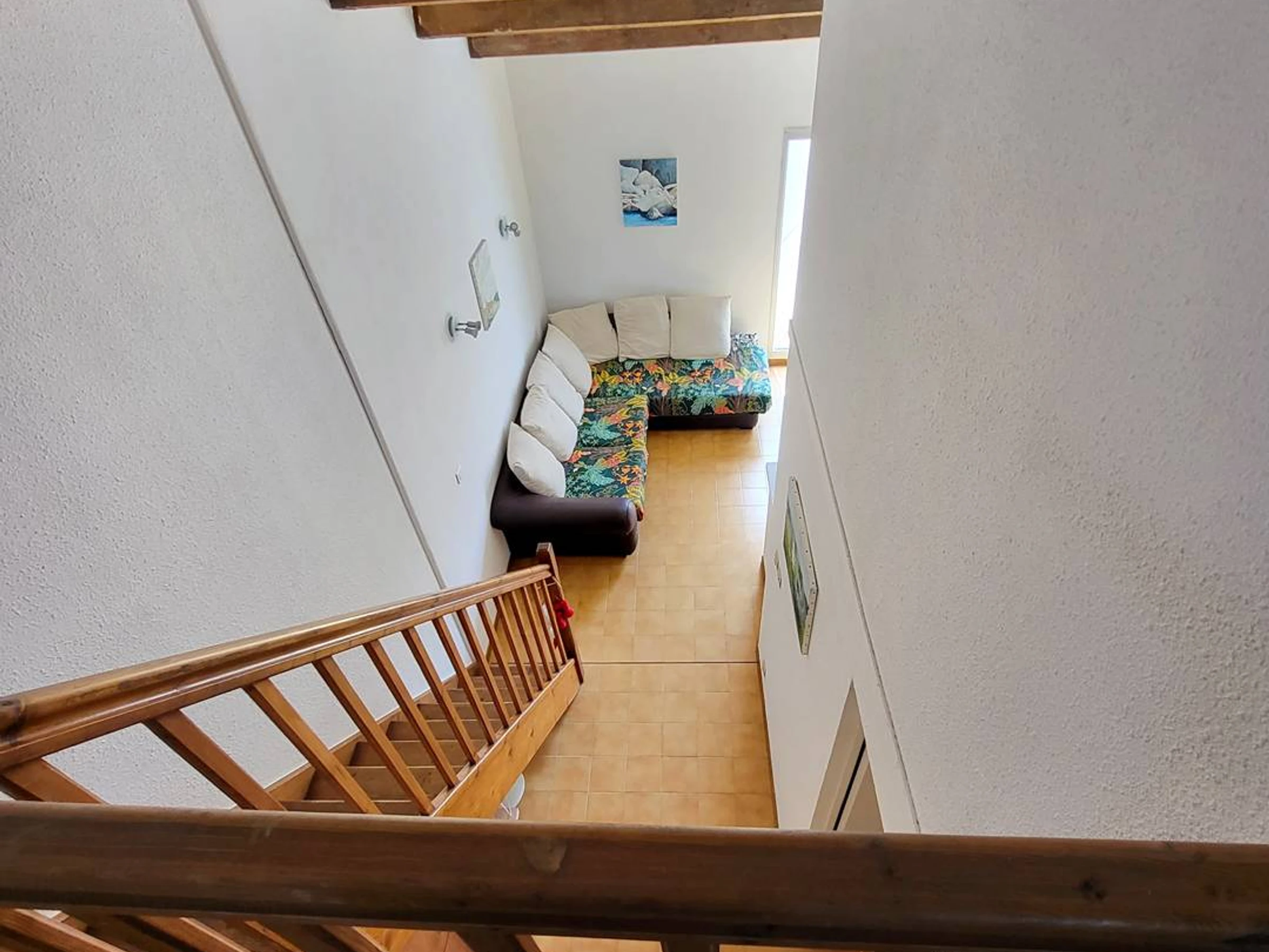 Upstairs: 1 large mezzanine bedroom under the eaves with 1 double bed (160 x 200 cm), 1 extra single bed (90 cm), 2 windows with shutters, blackout curtains, and a large wardrobe.