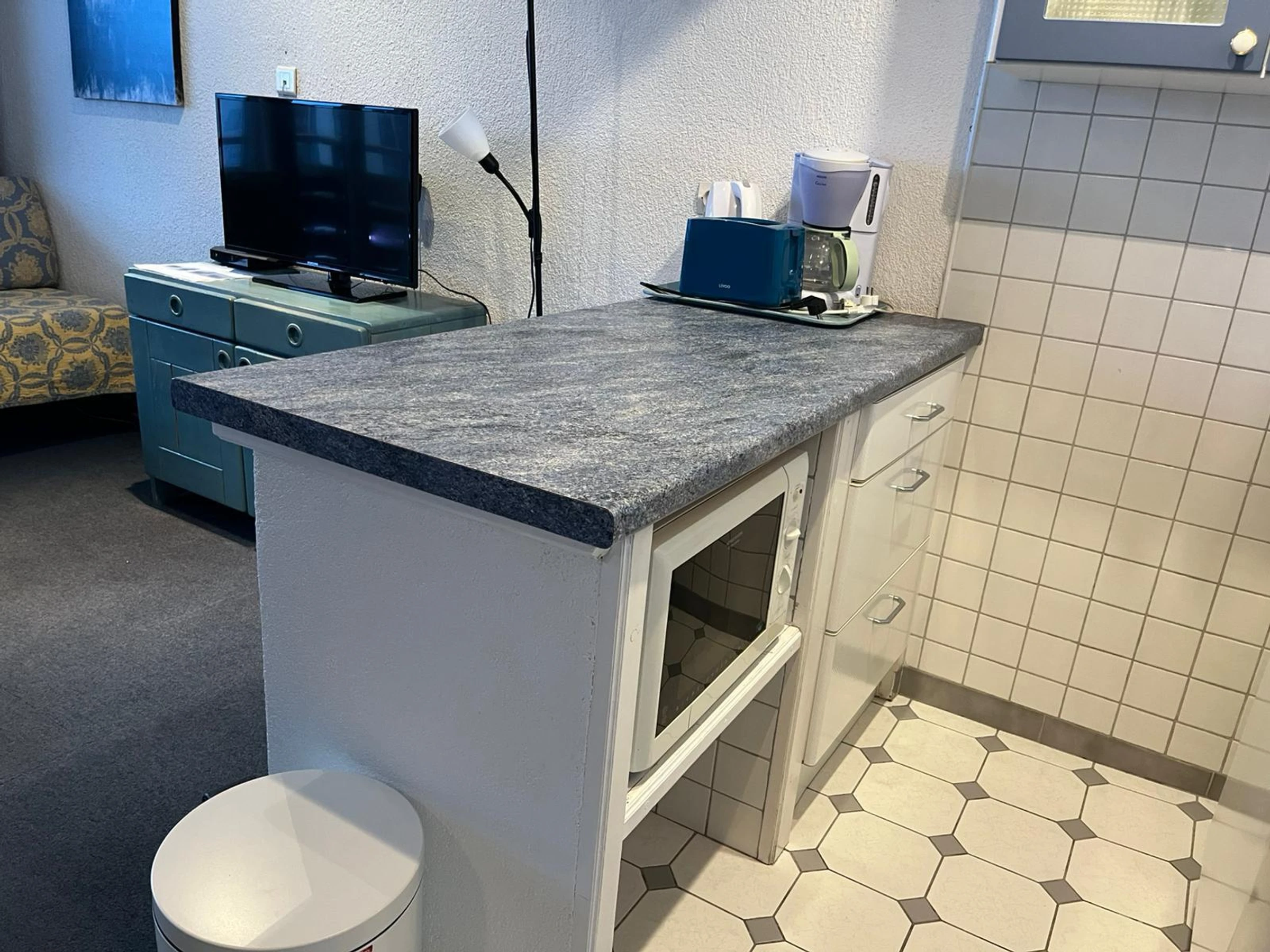Kitchen: Electric stovetop, microwave, filter coffee maker, refrigerator, and dishwasher.