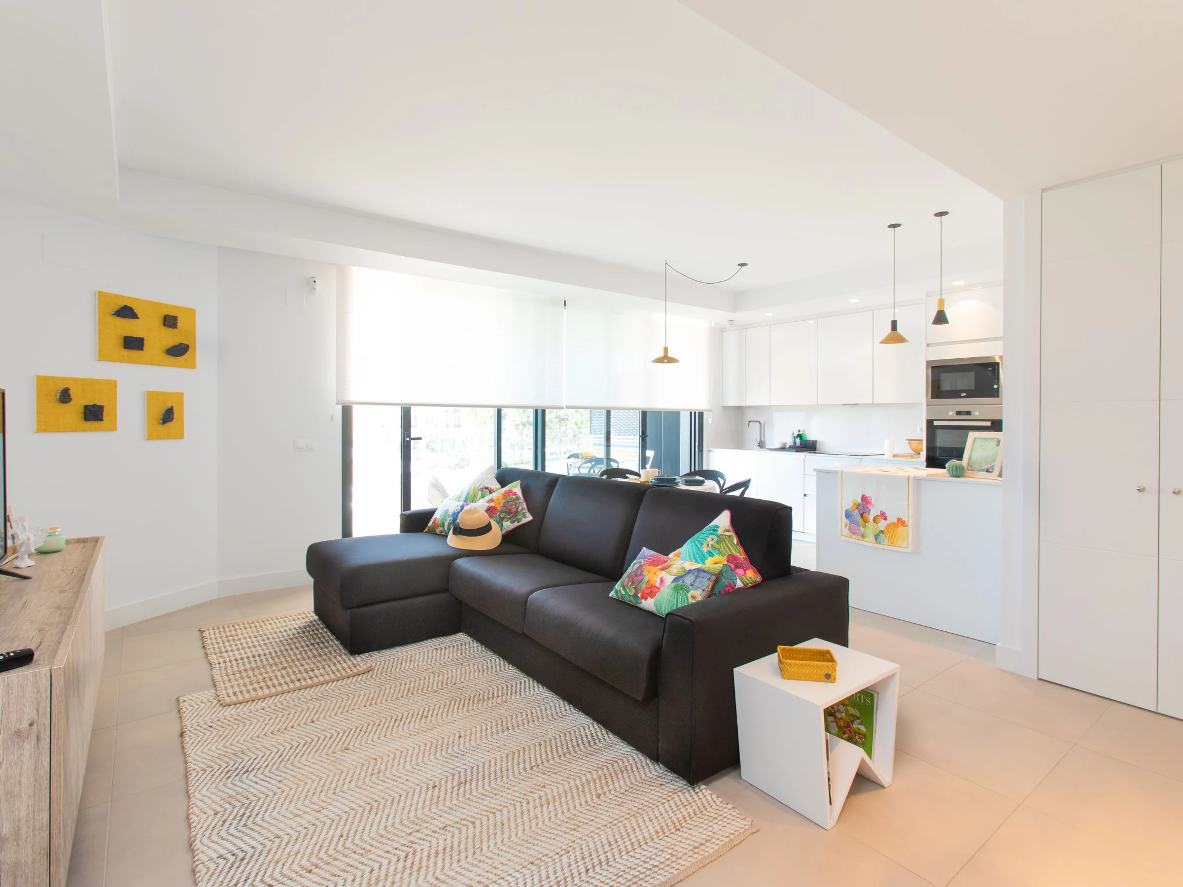 "Sealine", 3-room apartment 85 m2 on 1st floor, south facing position. Bright, comfortable and modern furnishings: living/dining room with TV, international TV channels, electric heating, air conditioning and electric shutters. Exit to the terrace. 1 room with 1 french bed (160 cm, length 190 cm), shower/WC and double hand-basin (private) air conditioning and forced-air heating. 1 room with 1 french bed (160 cm, length 190 cm), air conditioning and forced-air heating. Open kitchen (oven, dishwasher, 3 induction hot plates, toaster, kettle, microwave, freezer, electric coffee machine) with dining table, air conditioning and forced-air heating. Exit to the terrace. Shower/WC. Electric heating, forced-air heating. Large terrace. Terrace furniture, deck chairs. Very beautiful view of the sea. Facilities: washing machine, iron, children's high chair, baby cot for up to 3 year olds, hair dryer. Internet (WiFi, free). Please note: suitable for families. Smoke alarm, fire extinguisher. [hidden]