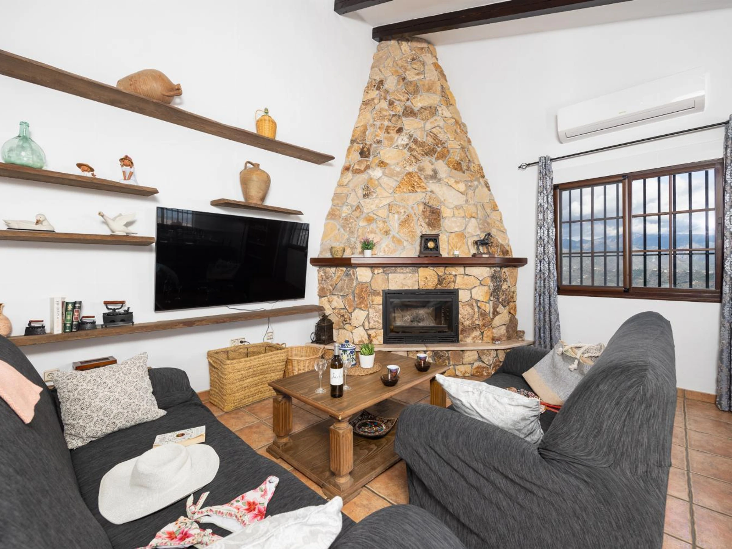 The living room is air-conditioned and has a ornamental fireplace,