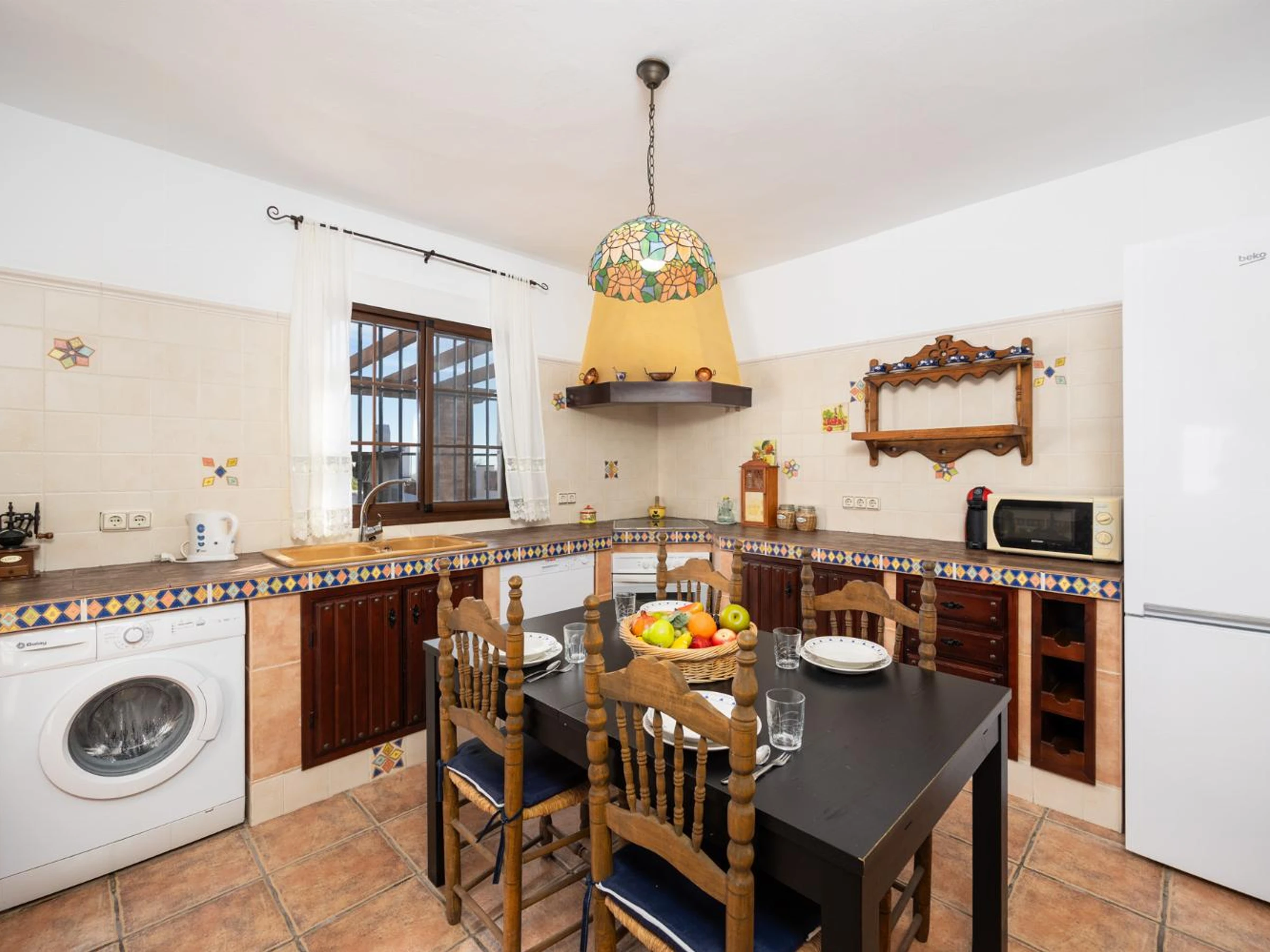 The kitchen features a coffee maker, washing machine, dishwasher,