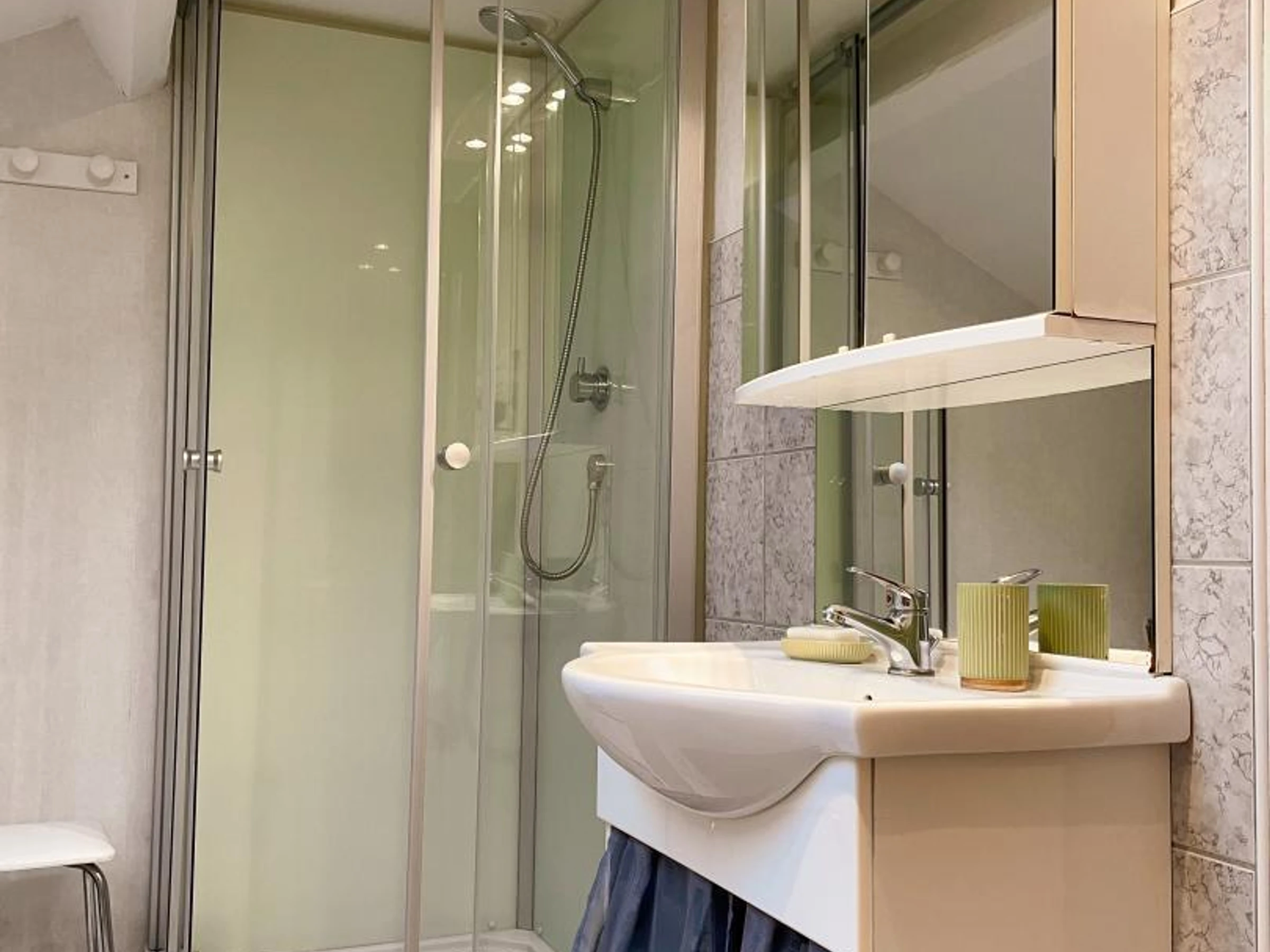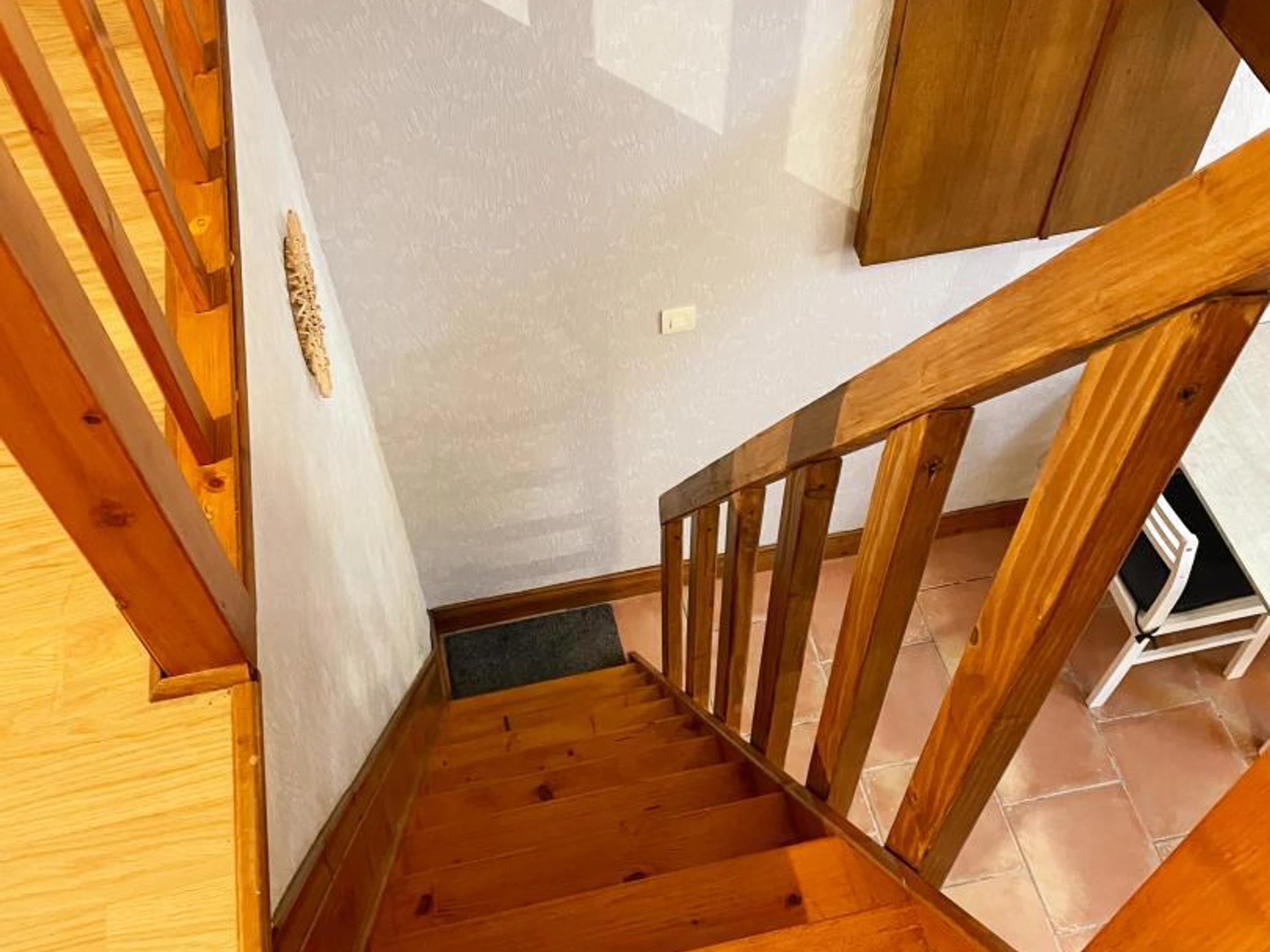 Ground floor: living room with lounge area, dining table, and fully equipped kitchen. One bedroom with a double bed (140x190cm). One bathroom (shower, sink) with toilet.