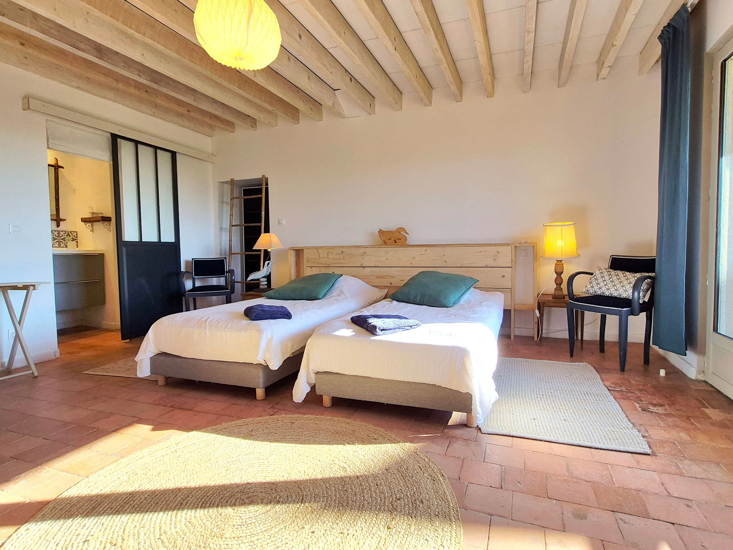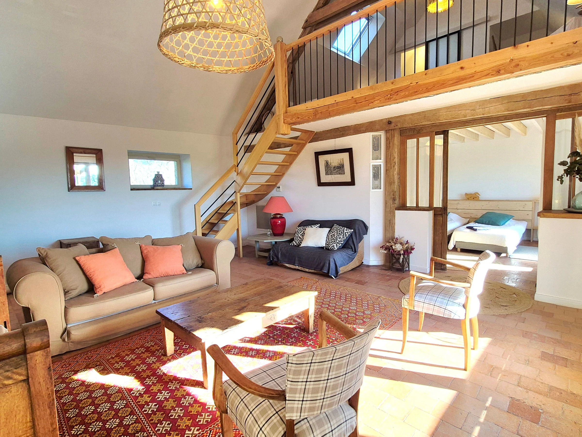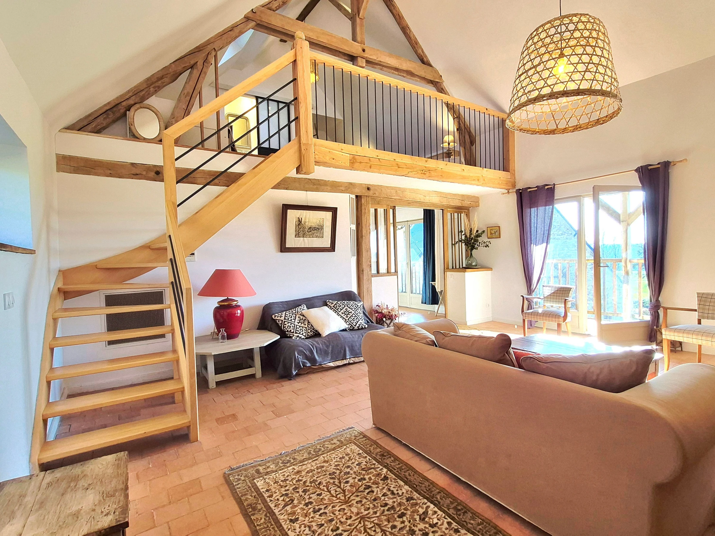 The living room is comfortable and welcoming, and the four bedrooms upstairs are spacious: 1 bedroom, "La grange," with two single beds (90 cm) and a bathroom with toilet; 2 bedrooms, "L'étang" and "Le chêne," each with a queen-size bed (160 cm), and a shower room with separate toilet; the "Cathedral" bedroom is a large family room that can accommodate four people, with a separate living room and outdoor balcony. There are two bedrooms (one with a king-size bed on the mezzanine and one with two single beds (90 cm)) and two shower rooms with toilets.