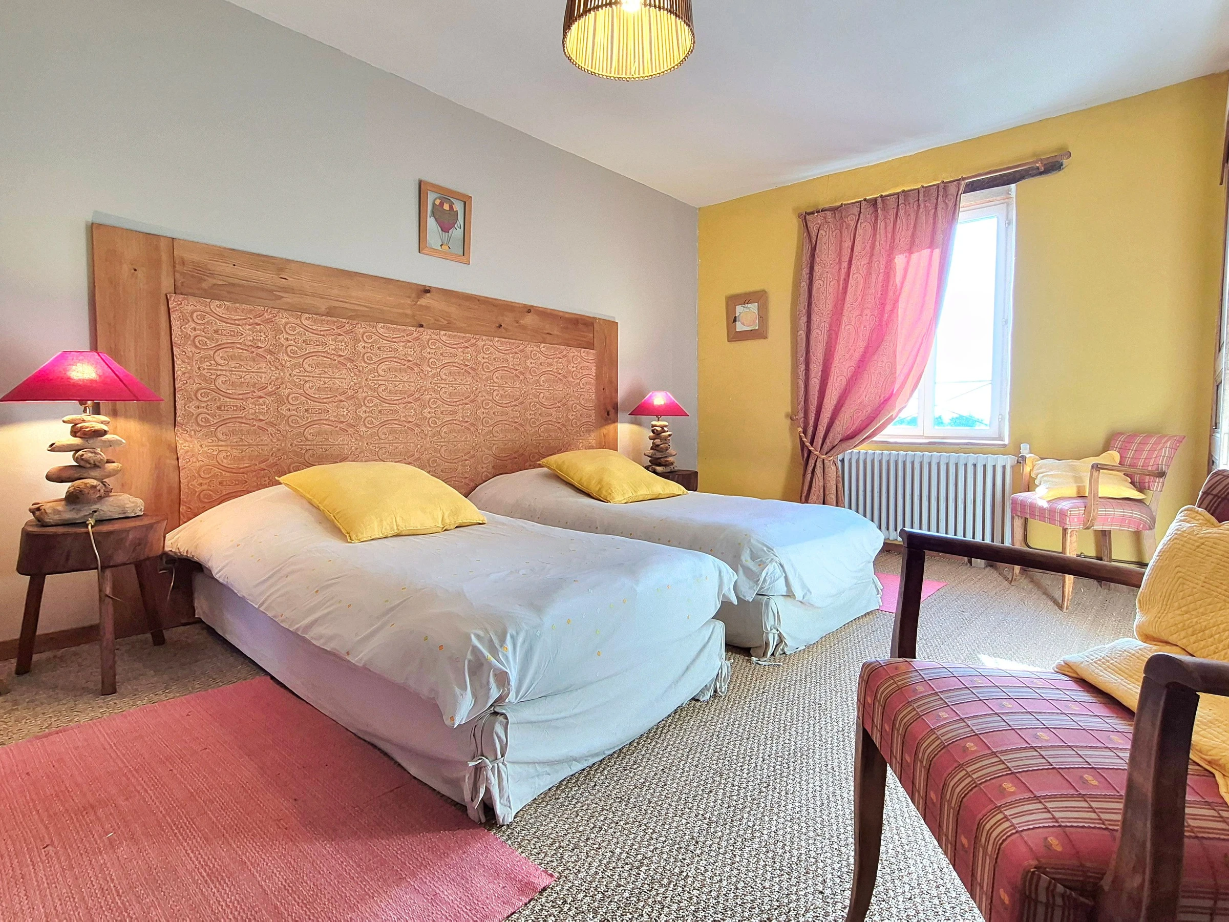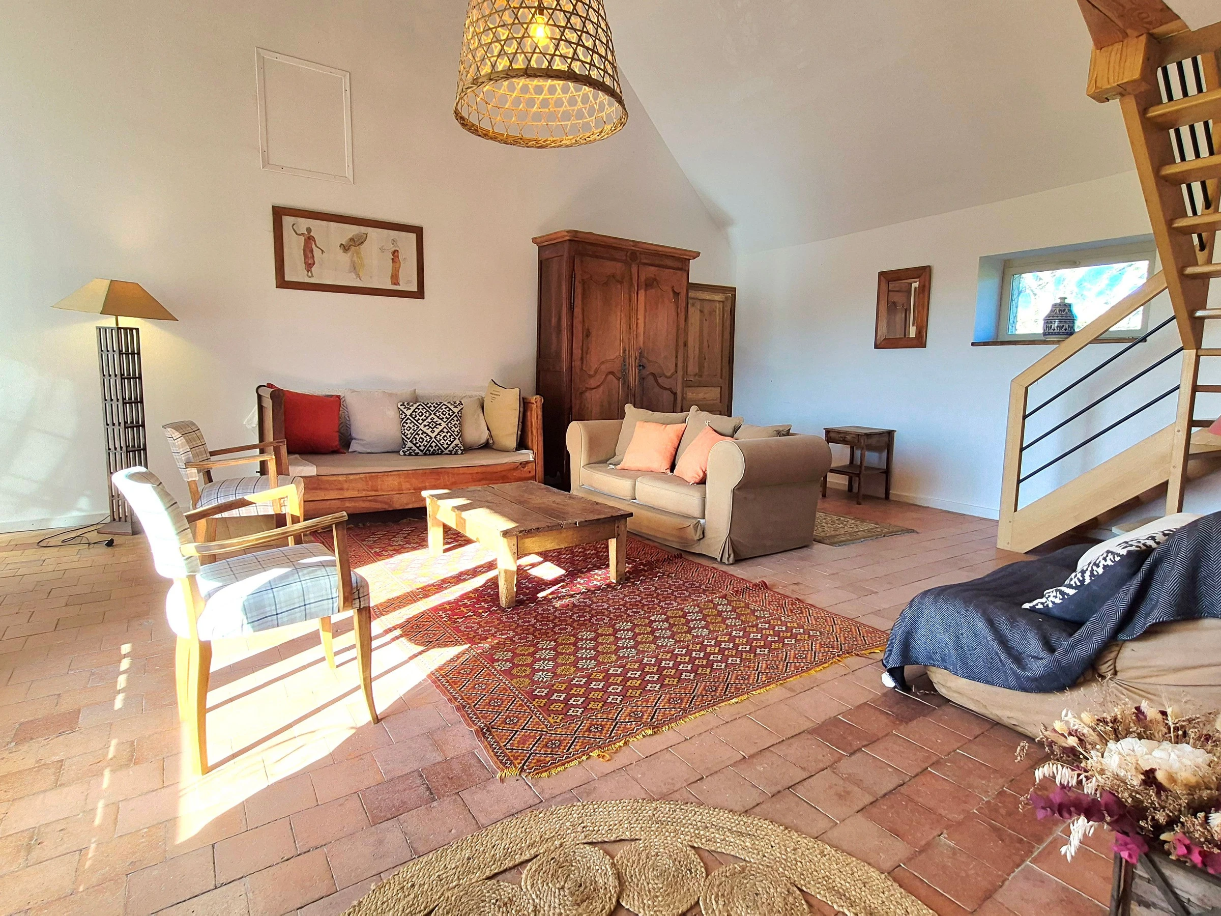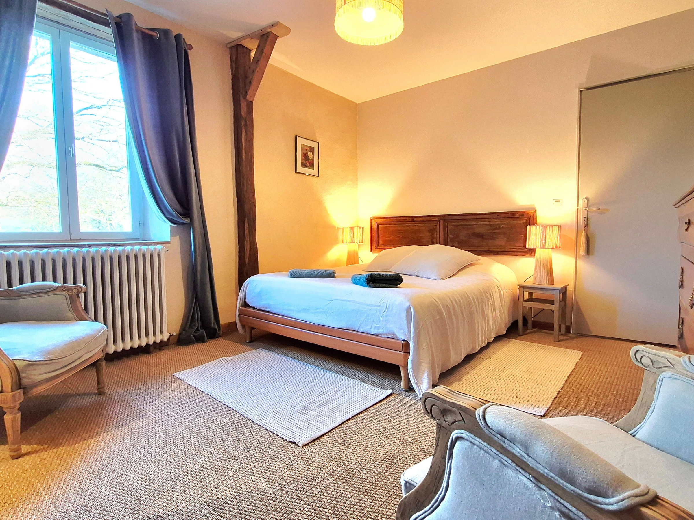The living room is comfortable and welcoming, and the four bedrooms upstairs are spacious: 1 bedroom, "La grange," with two single beds (90 cm) and a bathroom with toilet; 2 bedrooms, "L'étang" and "Le chêne," each with a queen-size bed (160 cm), and a shower room with separate toilet; the "Cathedral" bedroom is a large family room that can accommodate four people, with a separate living room and outdoor balcony. There are two bedrooms (one with a king-size bed on the mezzanine and one with two single beds (90 cm)) and two shower rooms with toilets.