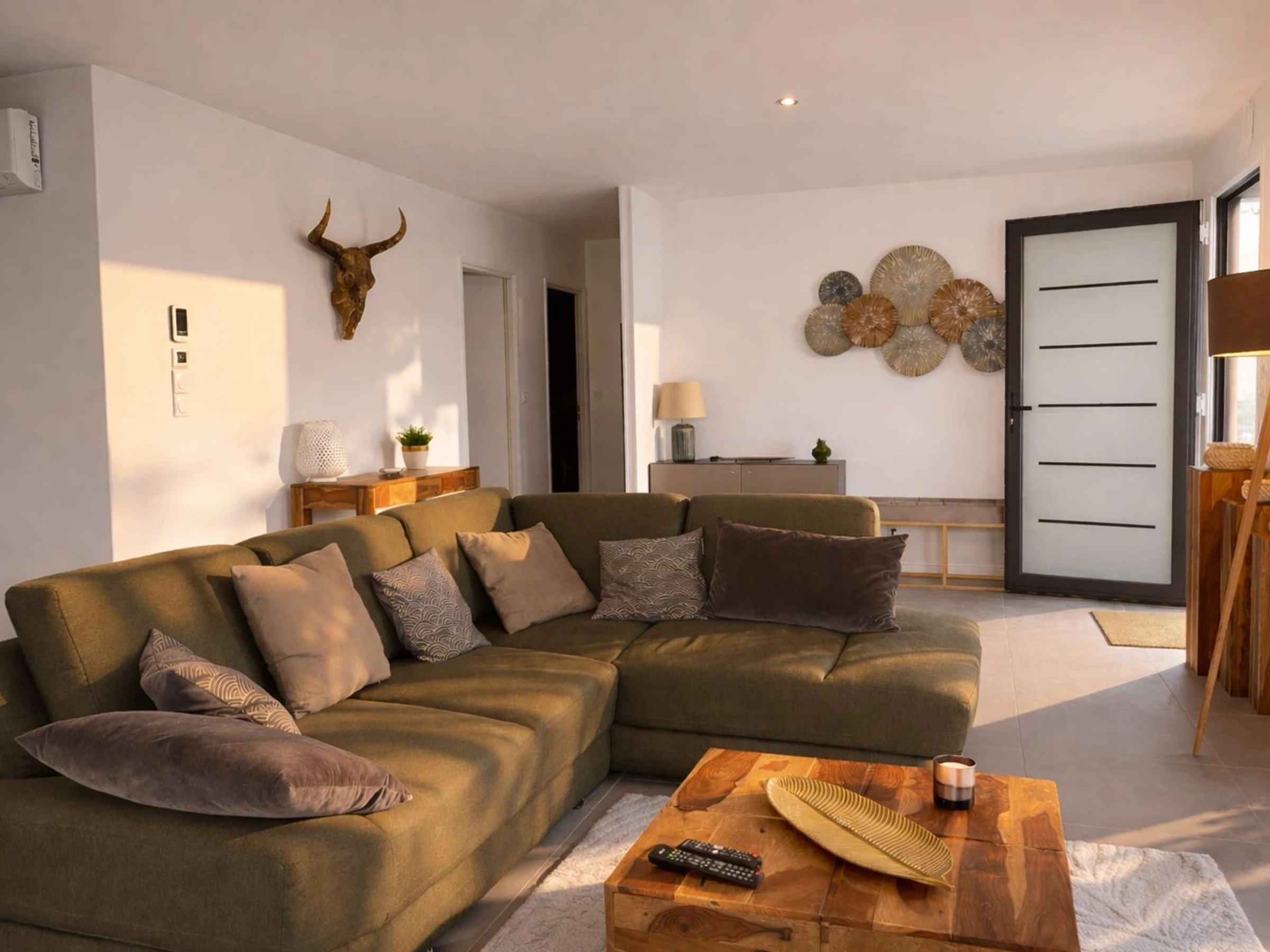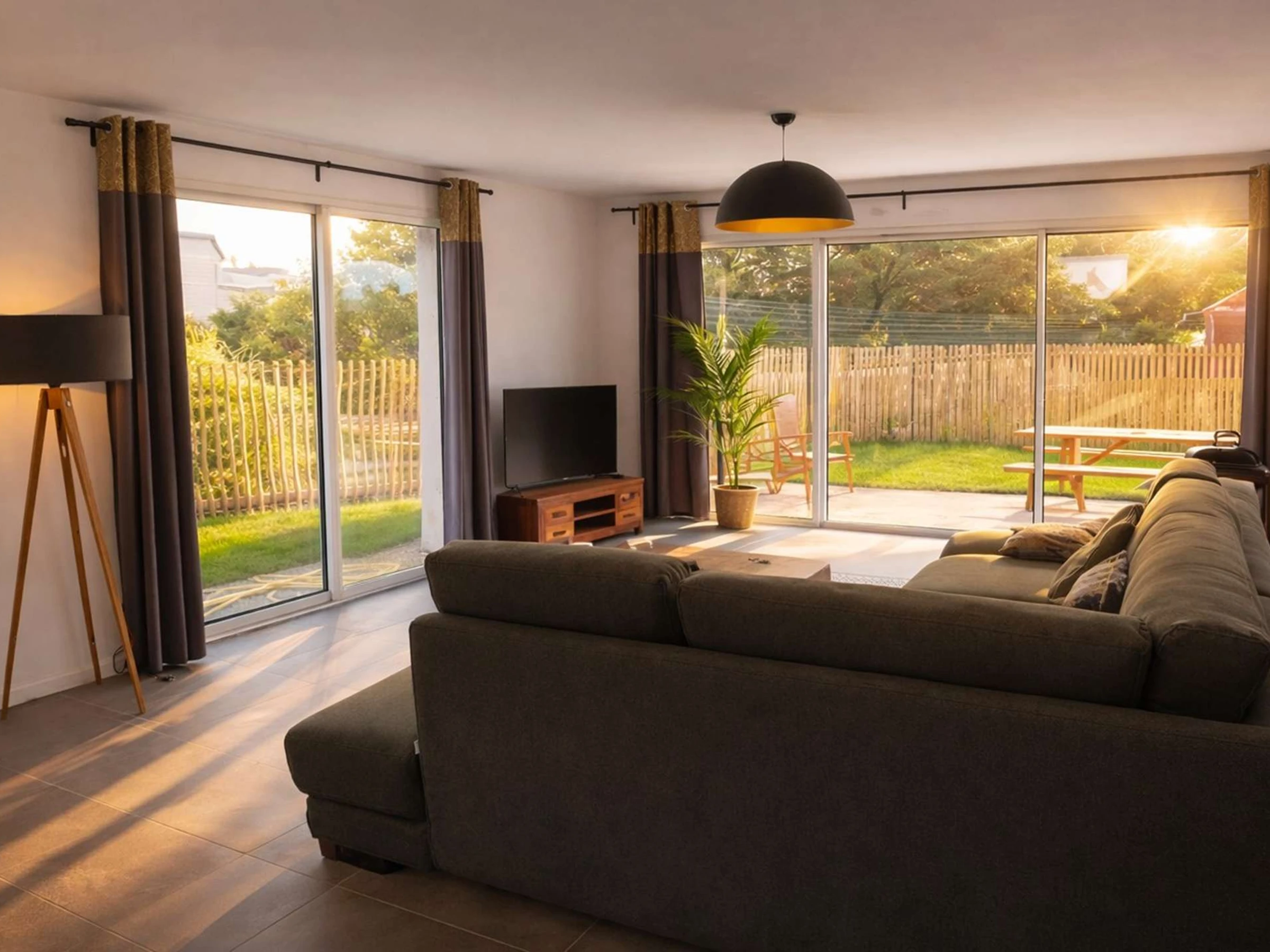Plaque de cuisson à induction, réfrigérateur-congélateur, four, four micro-ondes, lave-vaisselle, lave-linge, cafetière classique et dosette, bouilloire, grille-pain. Grand Canapé, télévision connectée. Deux lits 160x200 cm. Oreillers et couette pour les lits. Terrasse avec mobilier de jardin, parasol, barbecue Weber.