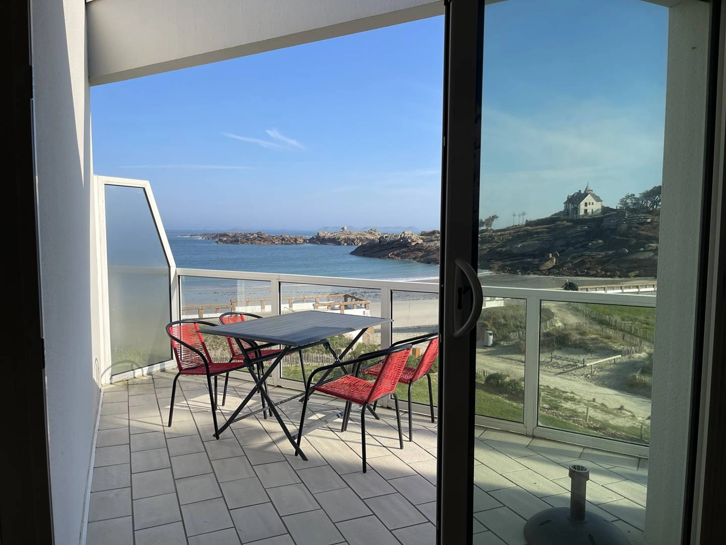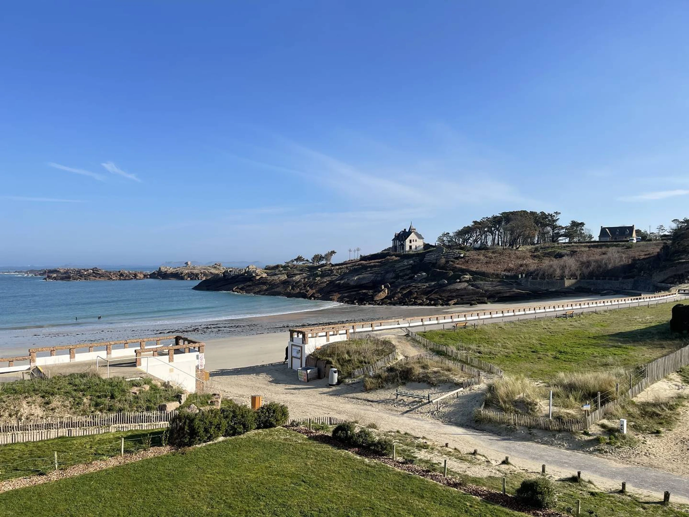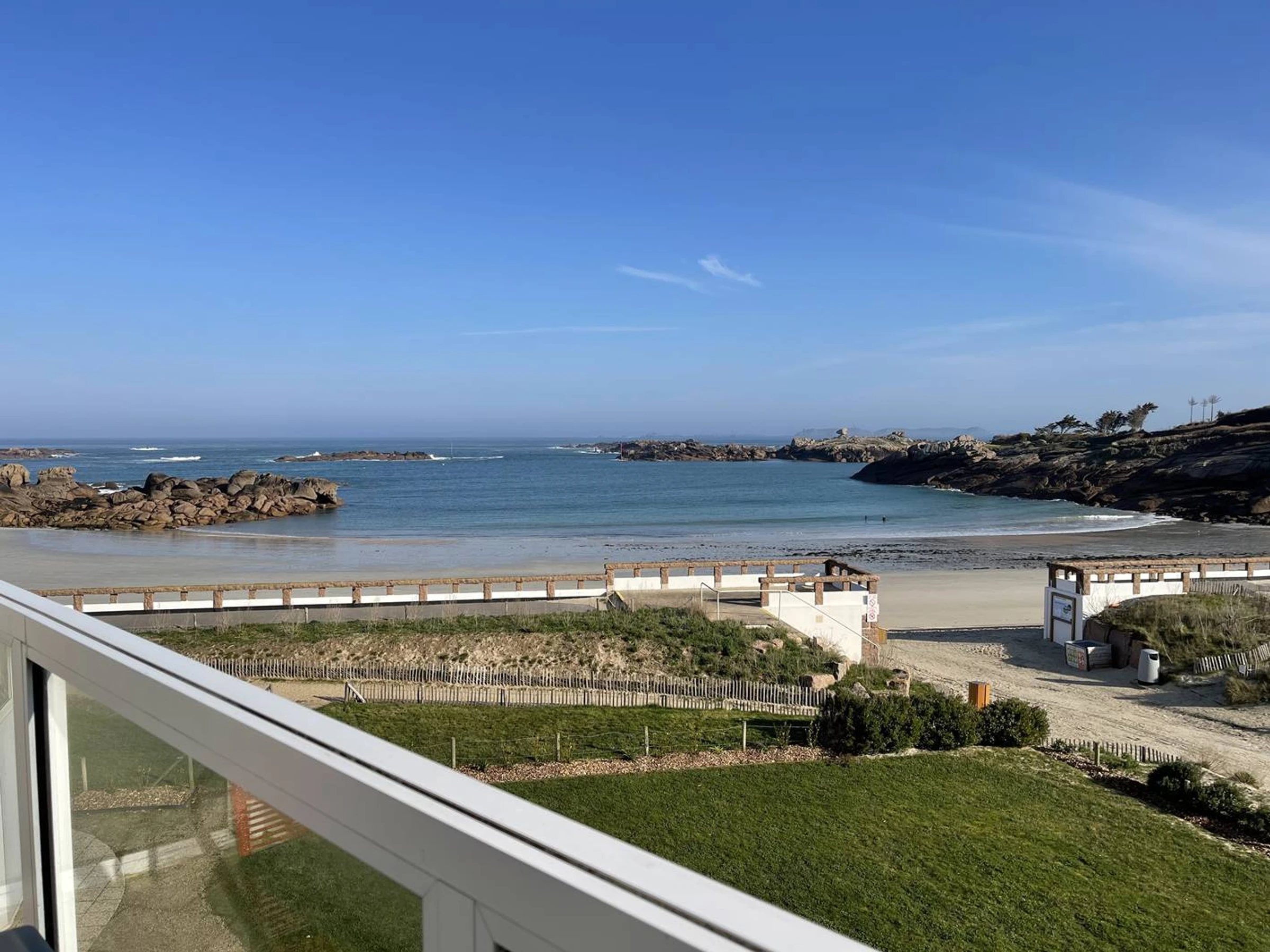 Sea view «panoramic», on the most beautiful sandy beach of the Pink Granite Coast «White Beach». Next to the Nautical Club, change of scenery assured...