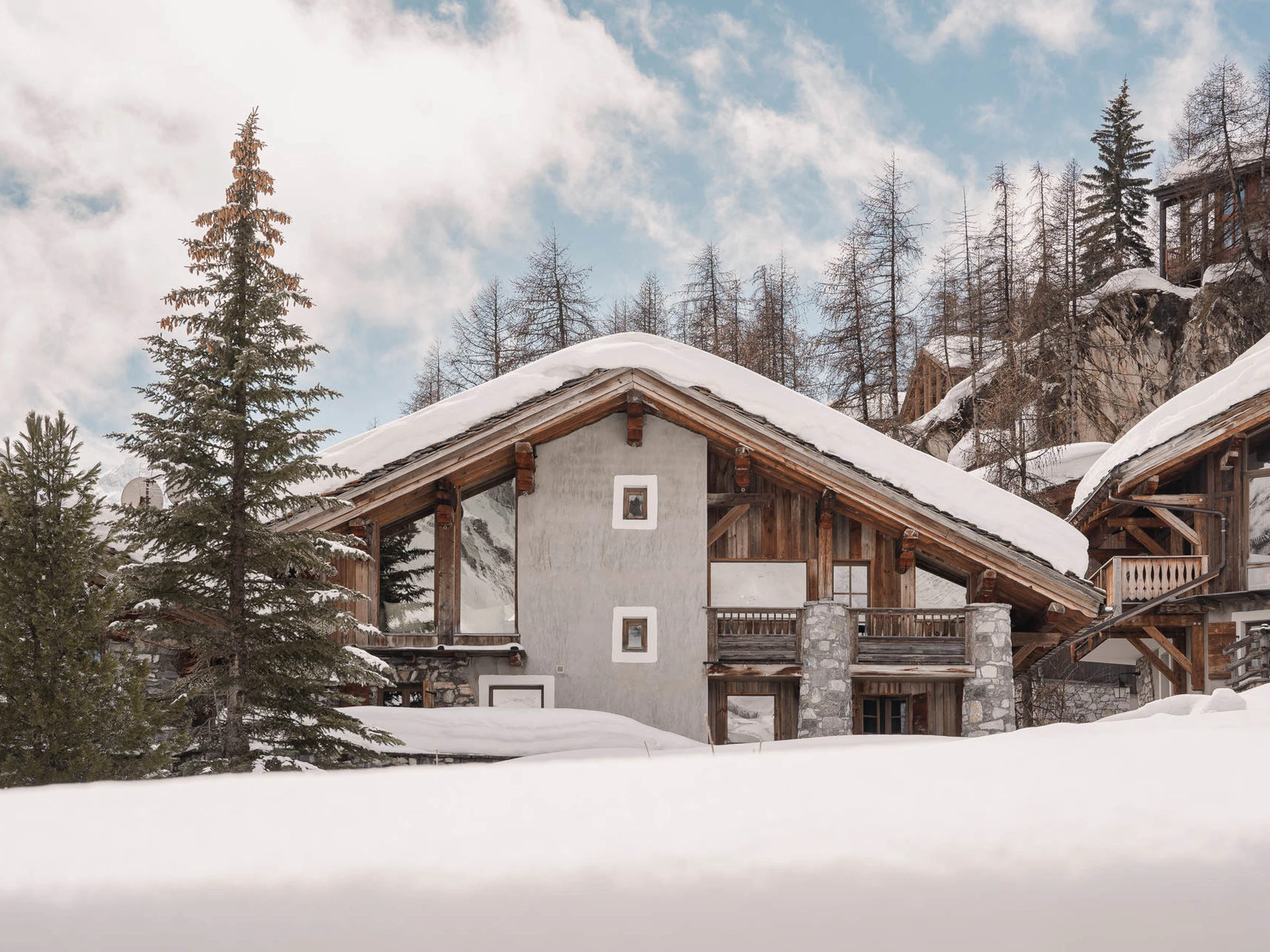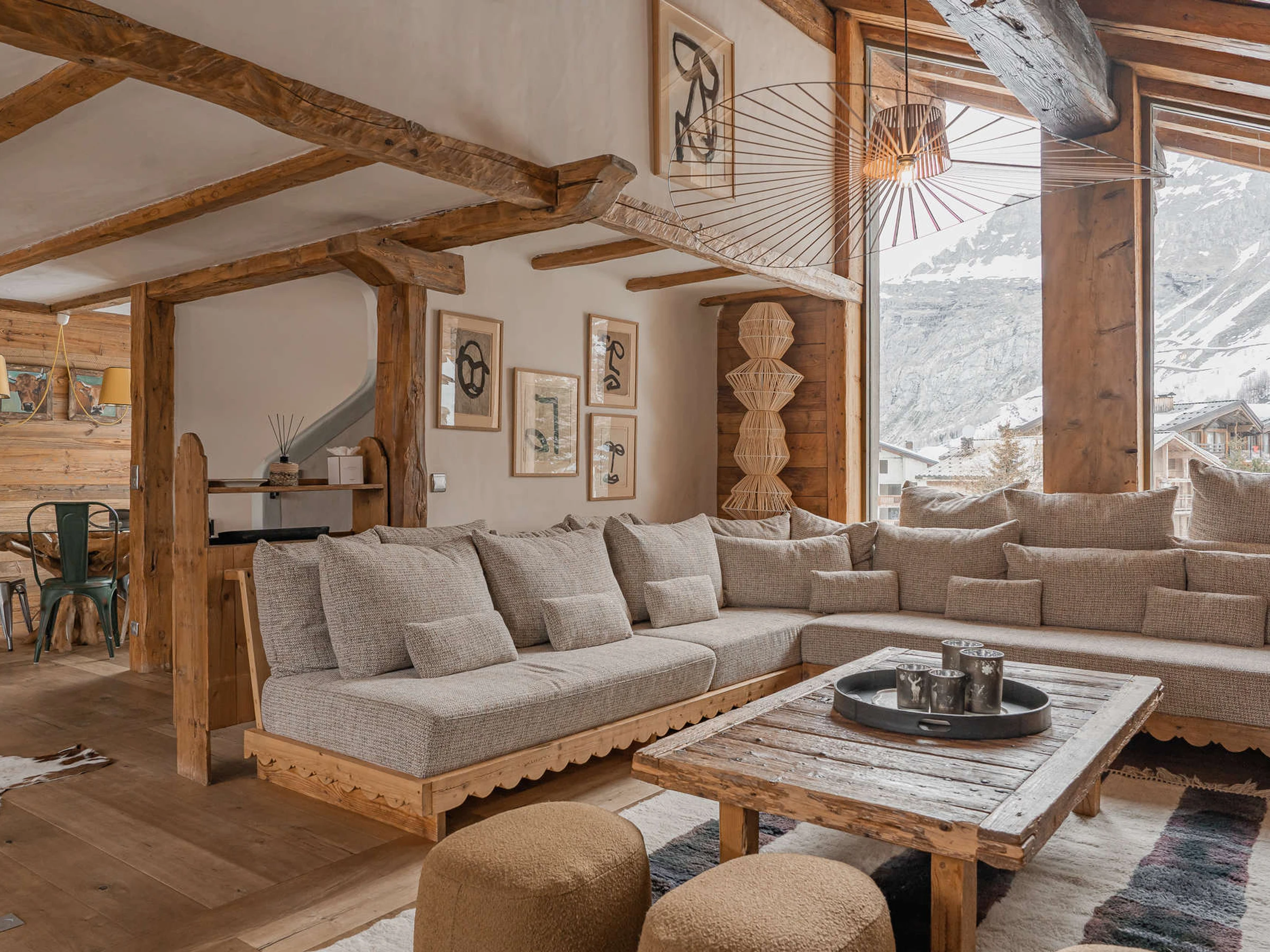 This prestigious chalet, built in traditional Val d'Isère stone and natural wood, enjoys an ideal location and view near the city center and between 350 and 500 meters from the ski slopes.