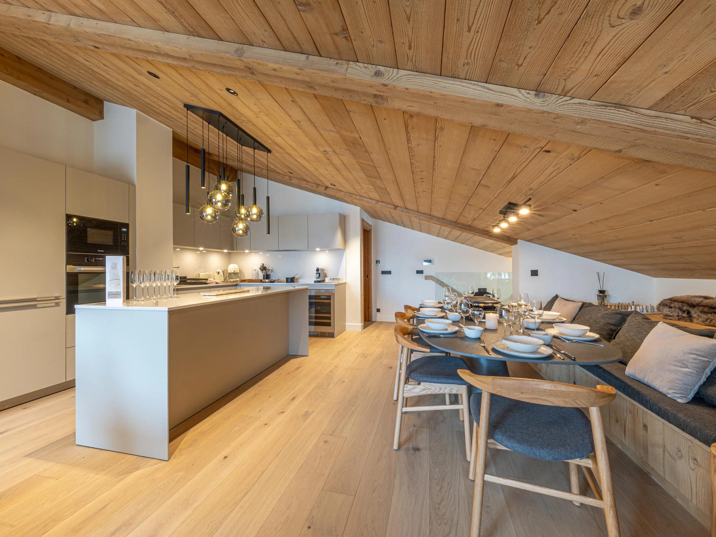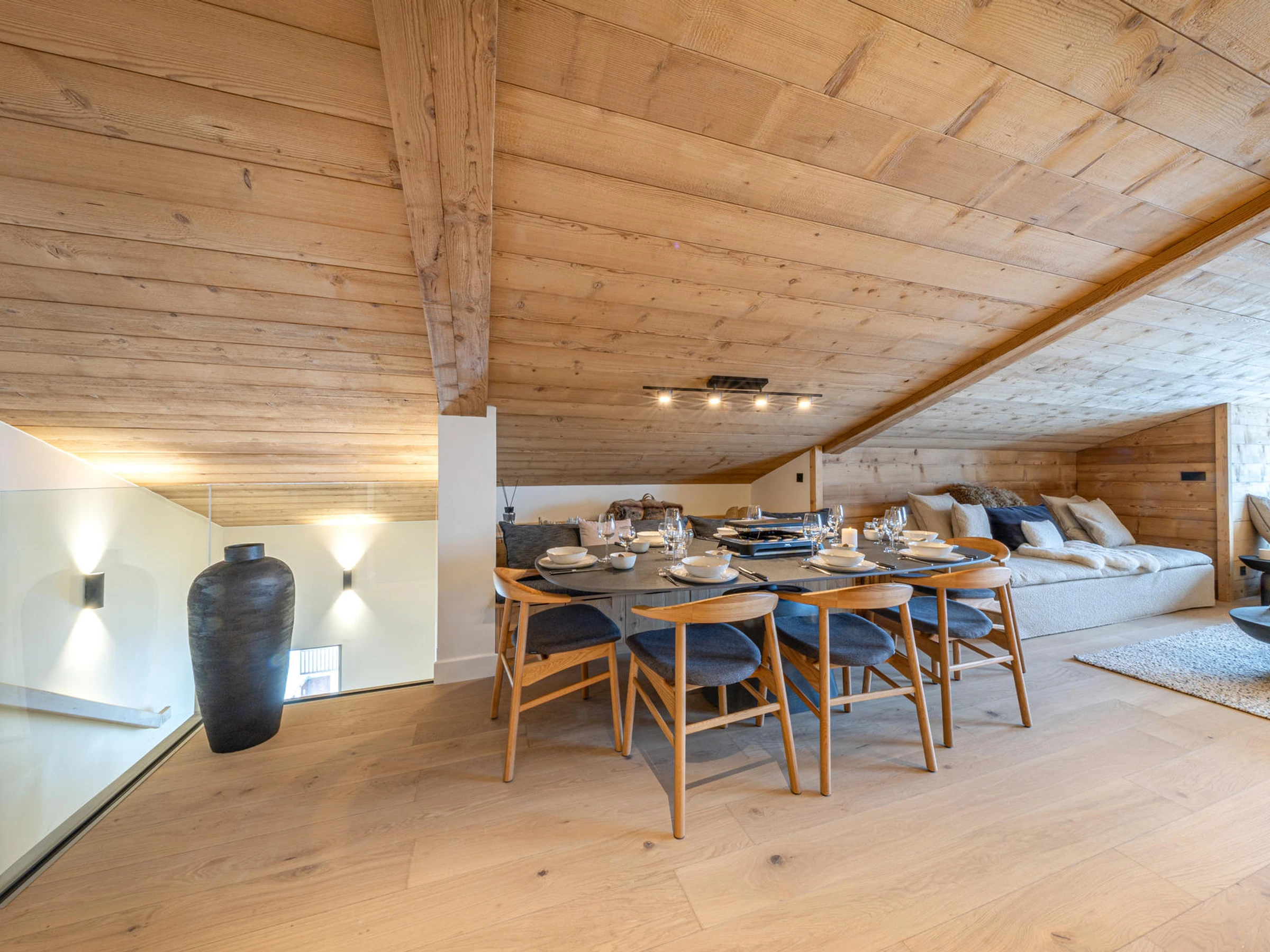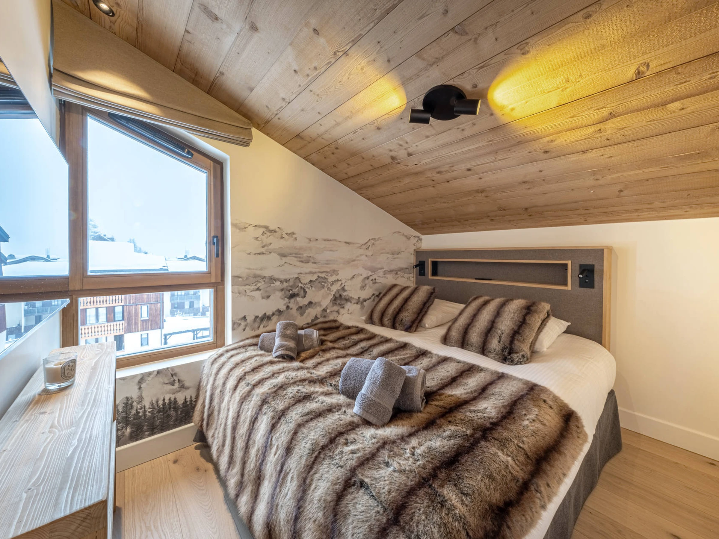 A 10-minute walk from the slopes, superb penthouse with a contemporary and warm chalet atmosphere, comprising 5 rooms on two floors, with a total surface area of 129 m², including 13 m² under the eaves, which can accommodate 8 people.