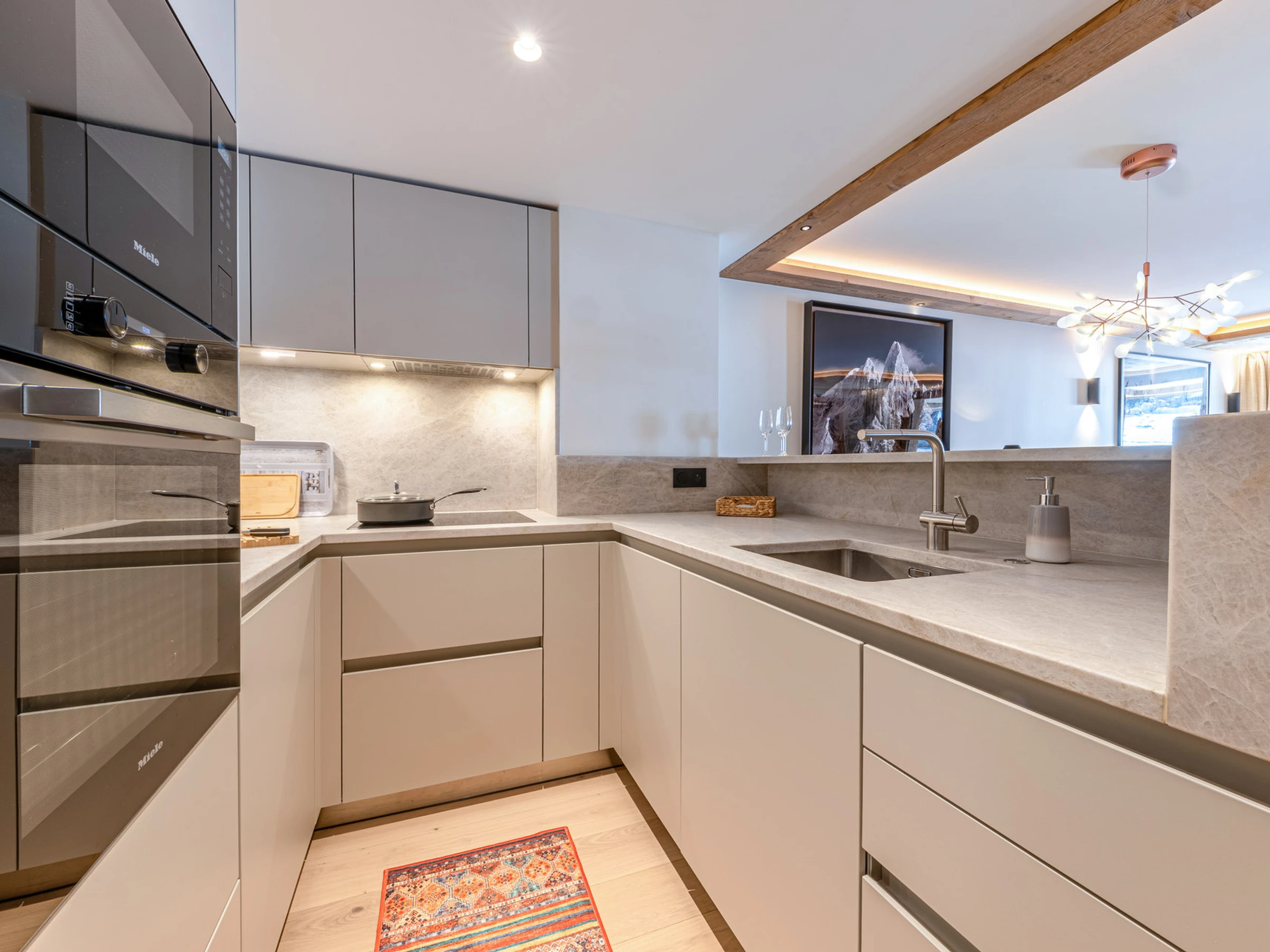 Equipped with a dishwasher, oven, induction hob, extractor hood, microwave, refrigerator with freezer.