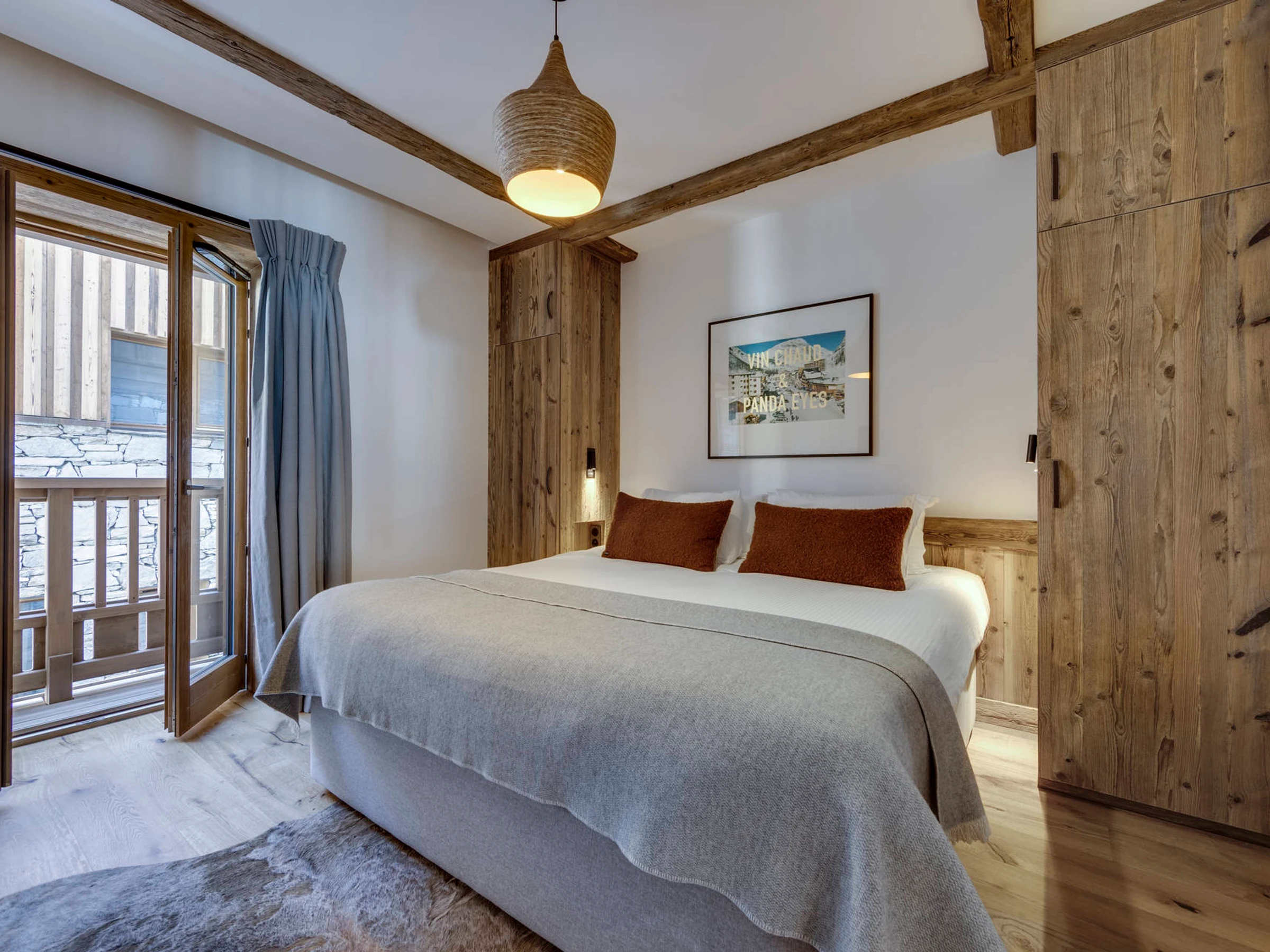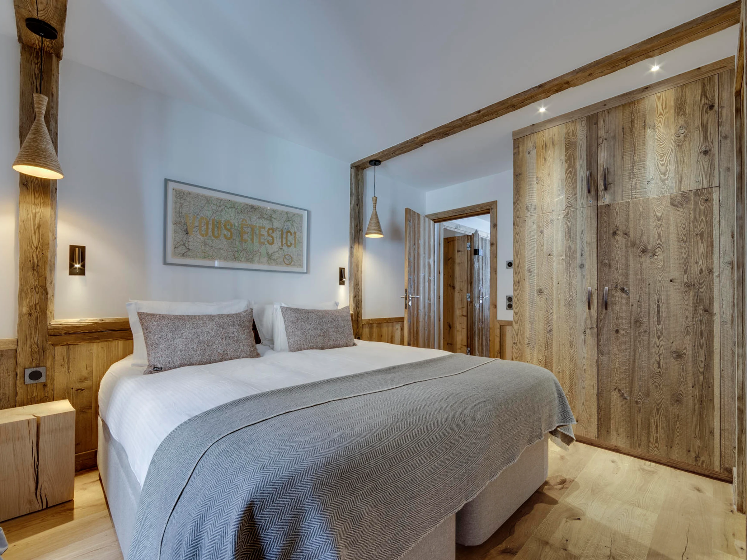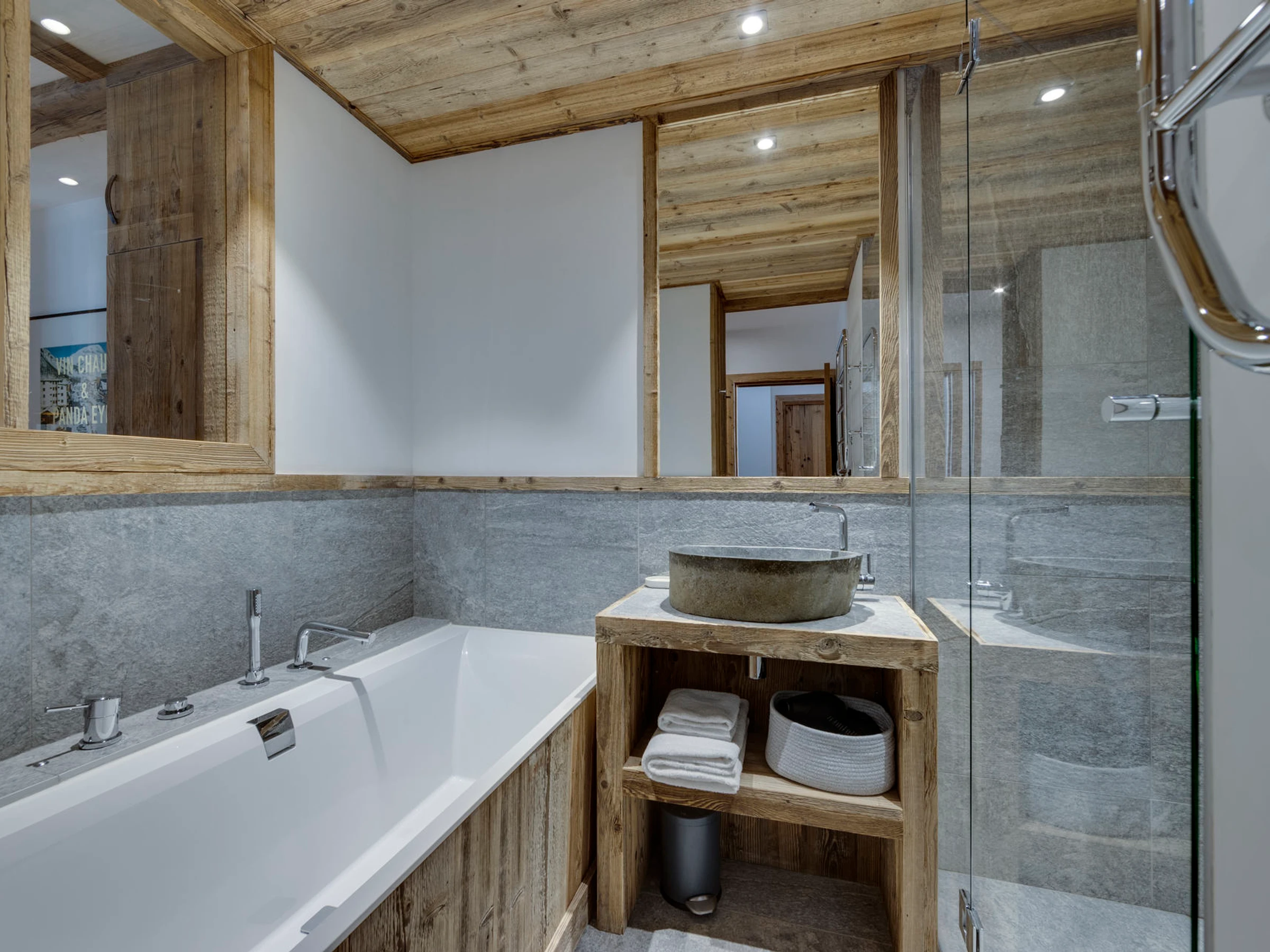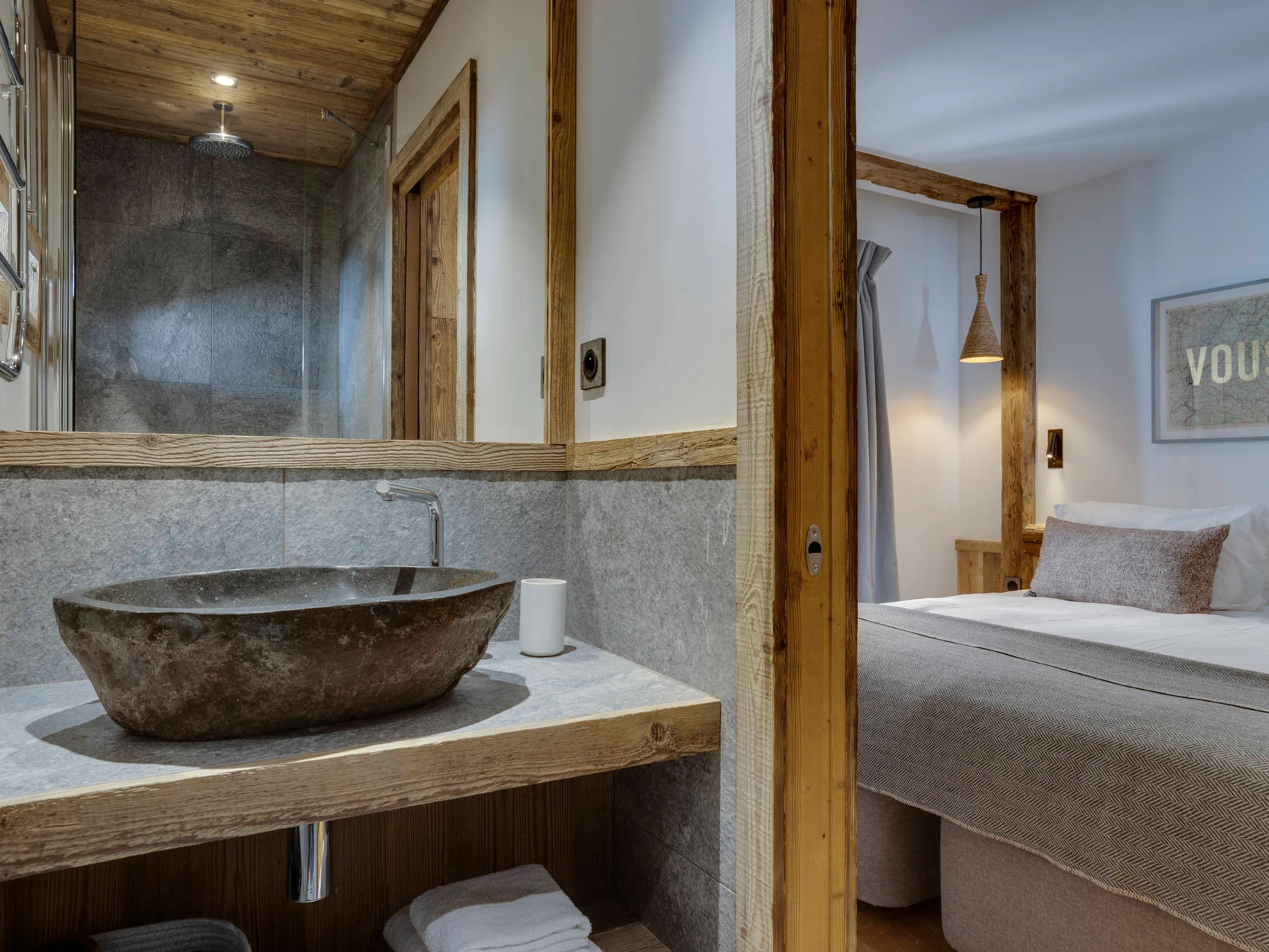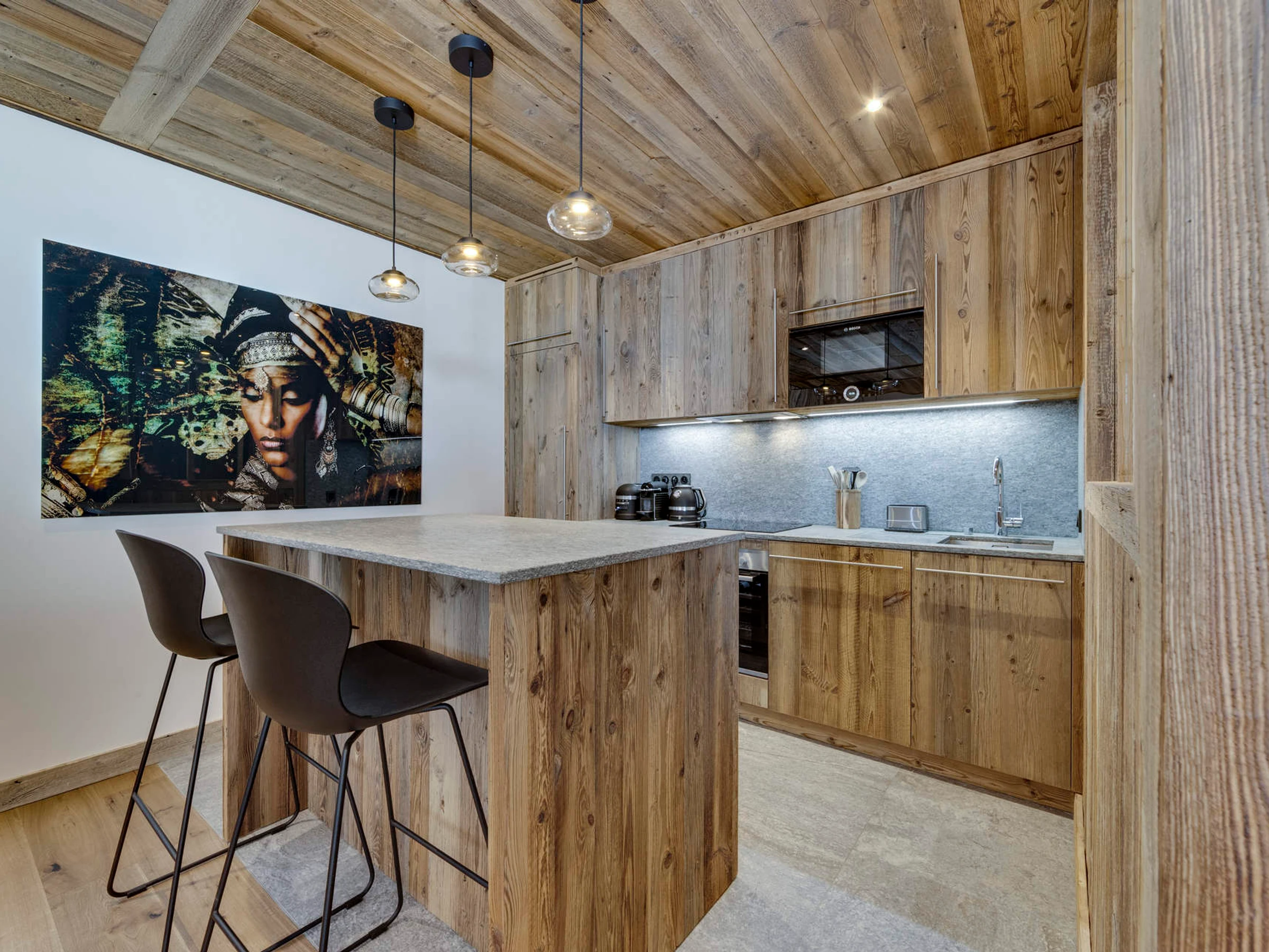 Interior of character combining contemporary decoration with an authentic Savoyard touch and warm architecture made of reclaimed timber and stone.