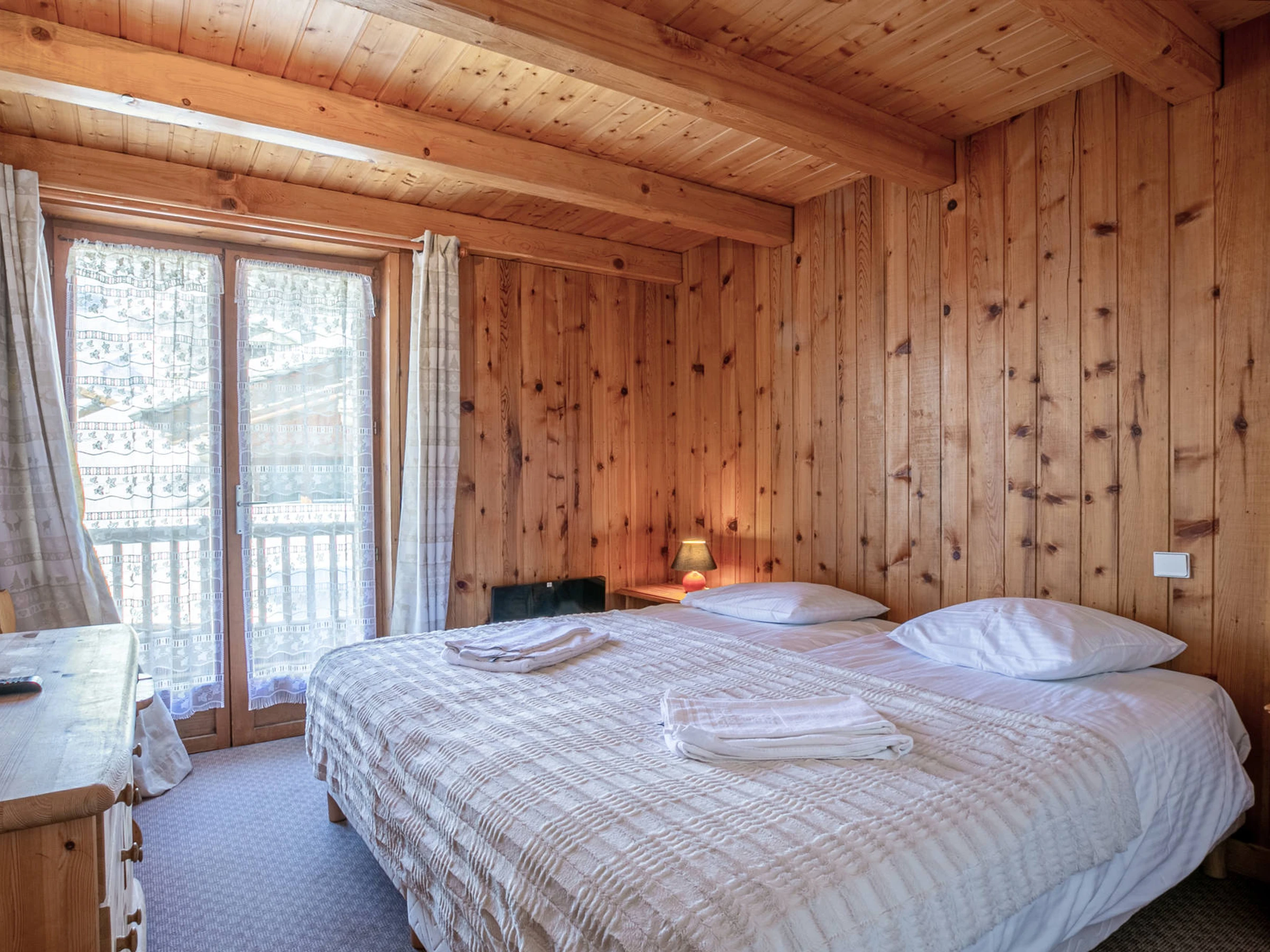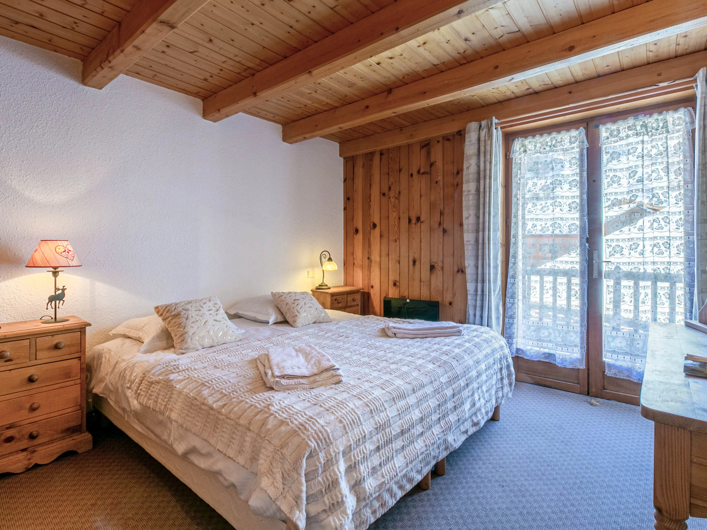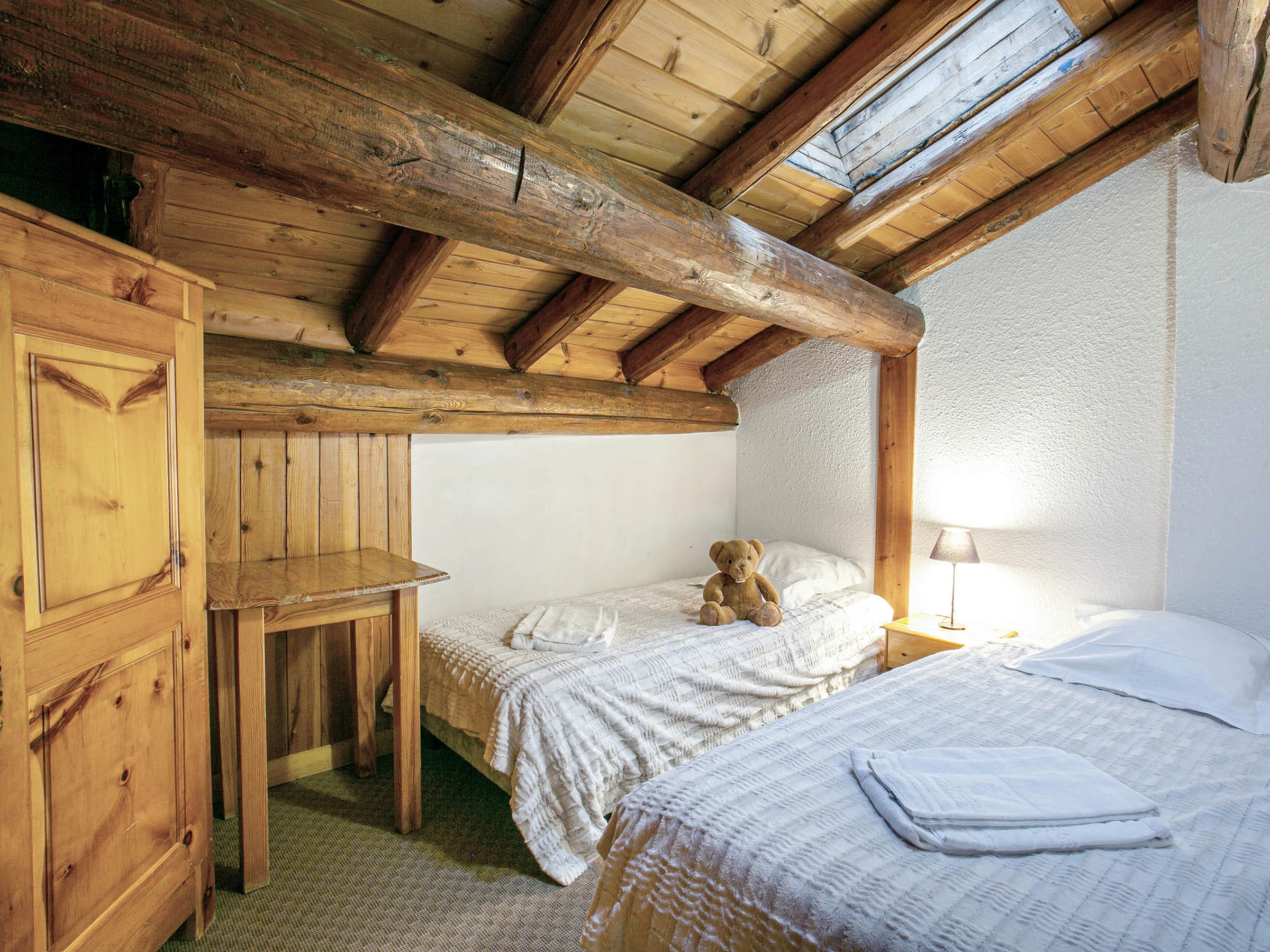Located on the 2nd and last floor of the chalet, with a South facing balcony , beautiful volume under roof and apparent wood beams.