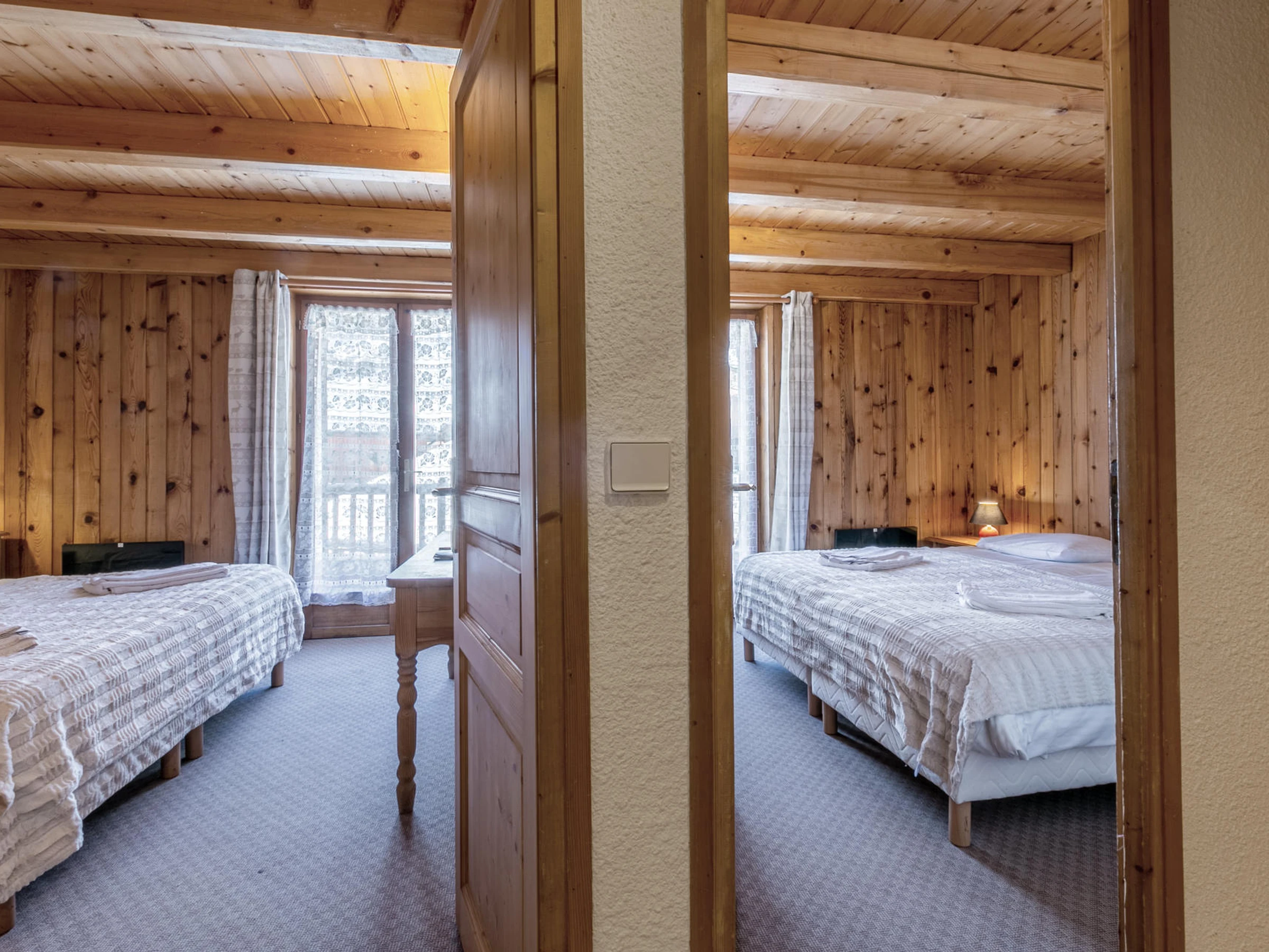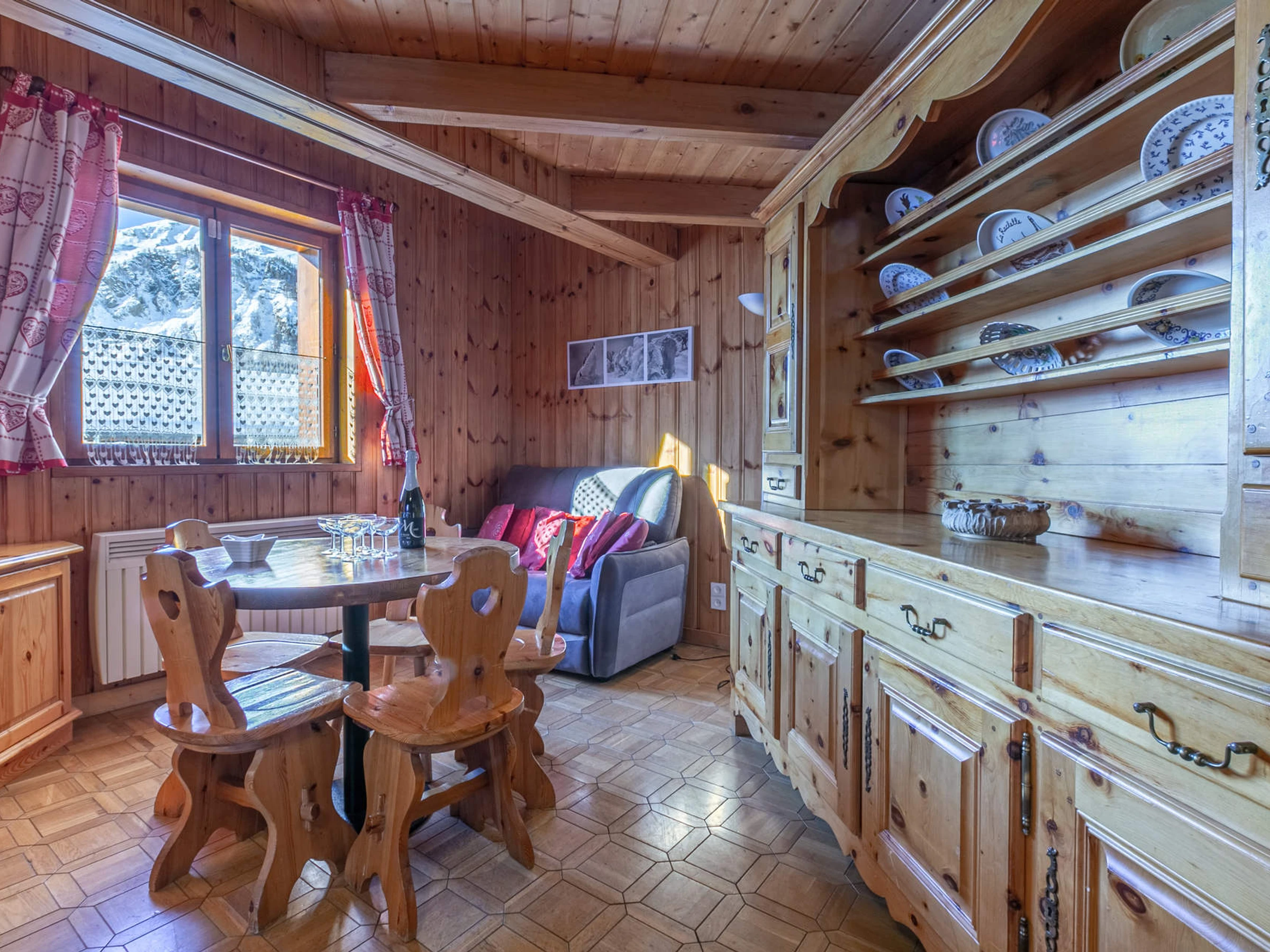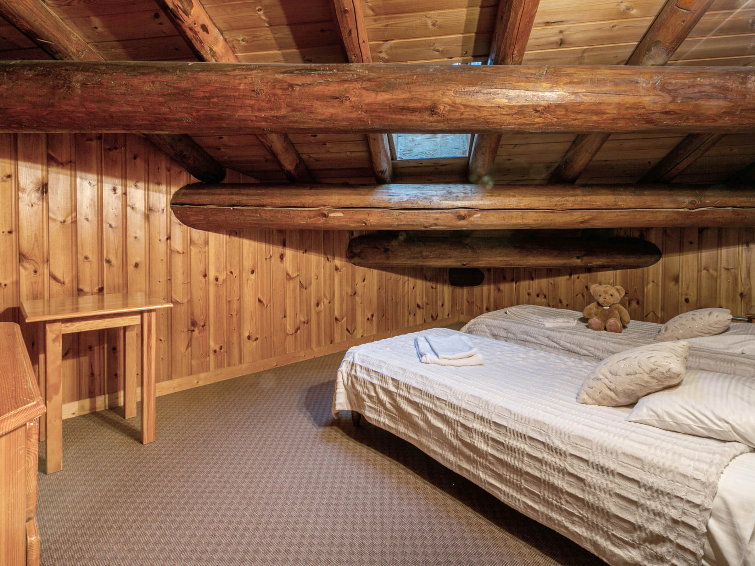 Located on the 2nd and last floor of the chalet, with a South facing balcony , beautiful volume under roof and apparent wood beams.