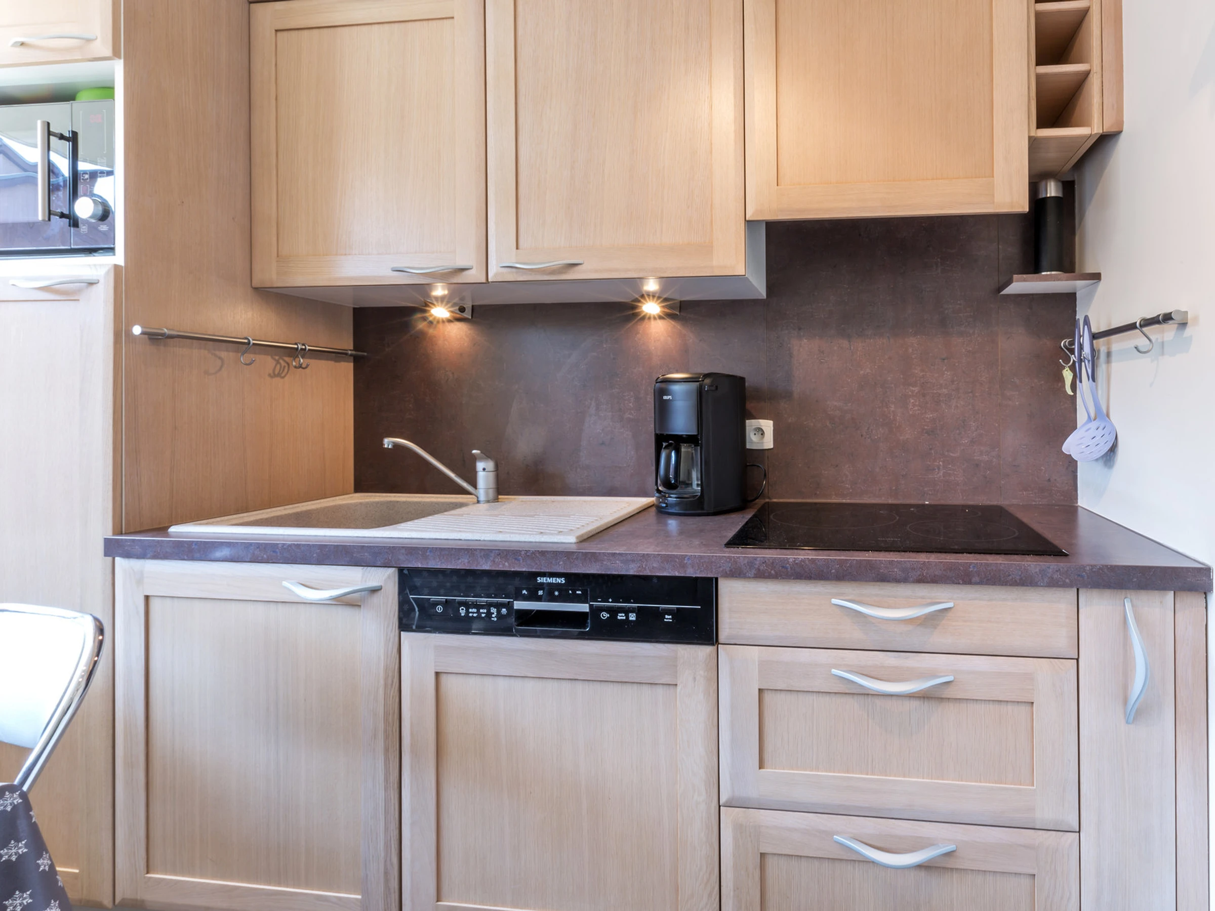 Equipped with a microwave oven with grill, dishwasher, fridge, hood, induction hob