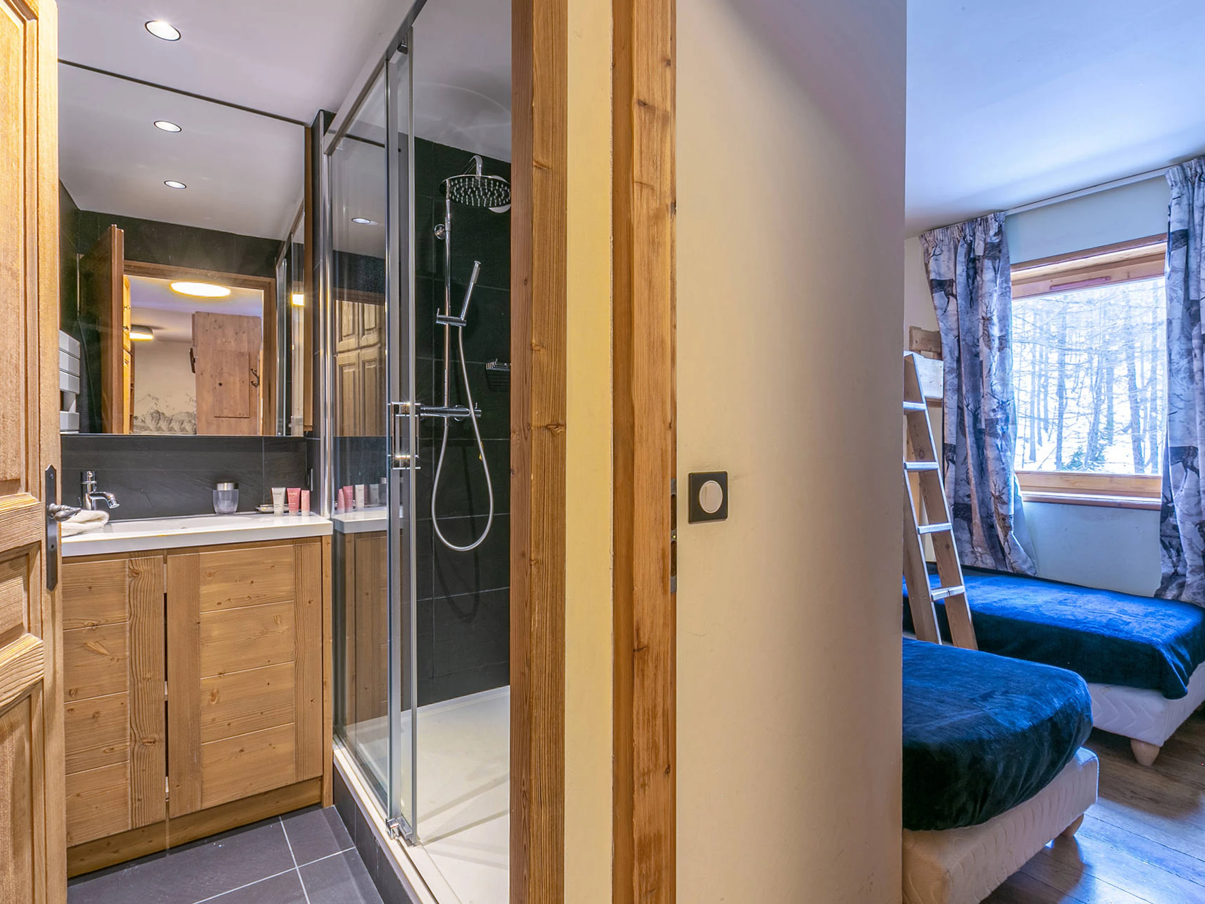 Located on the 1rst floor of the chalet with a large and sunny South/East facing terrace.