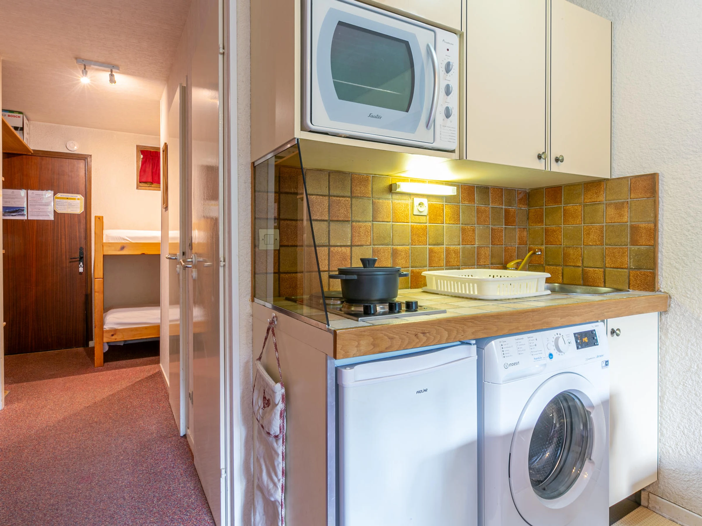 Equipped with oven, washing machine, electric hob and fridge