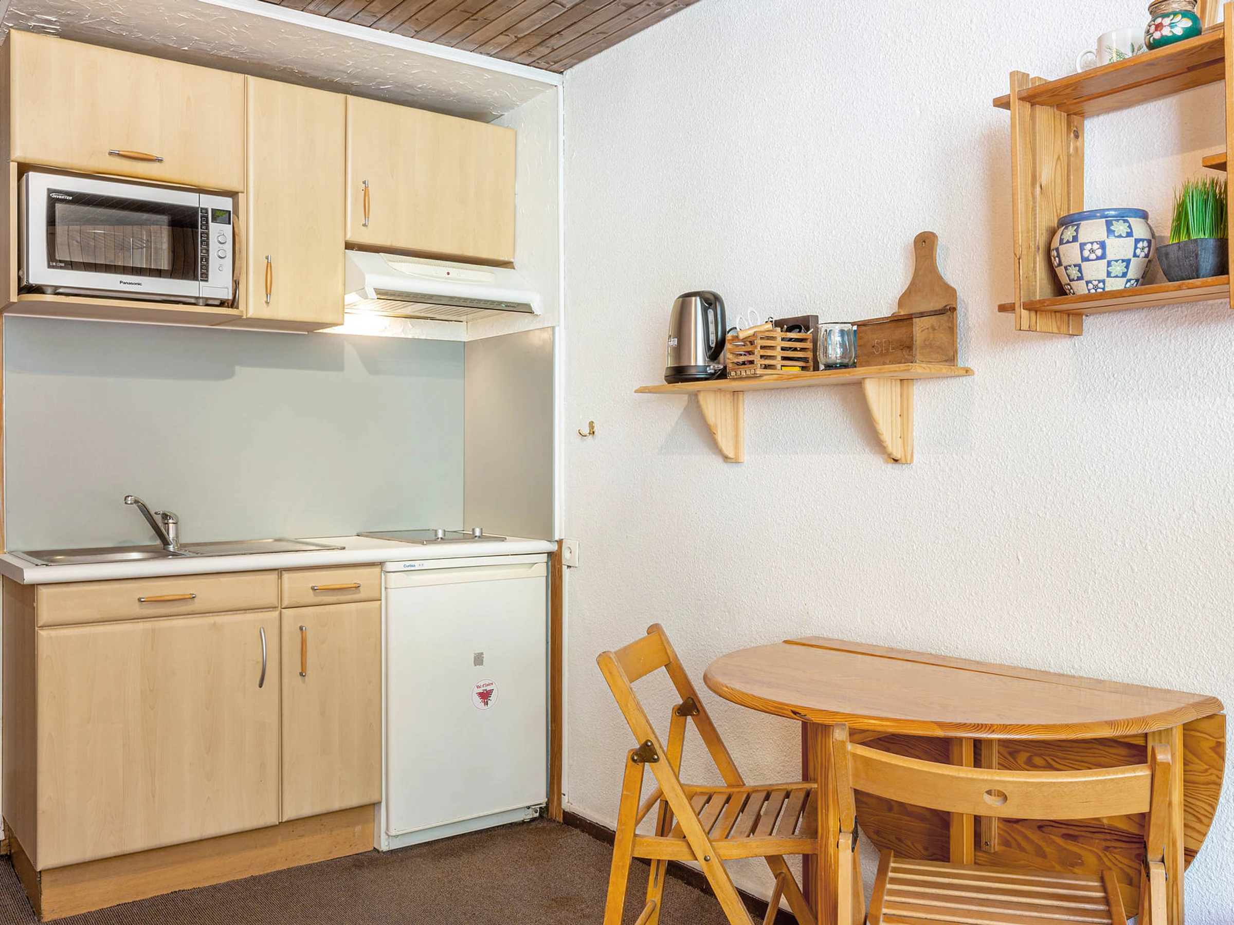 Equipped with microwave oven with grill, hood, ceramic hob, fridge