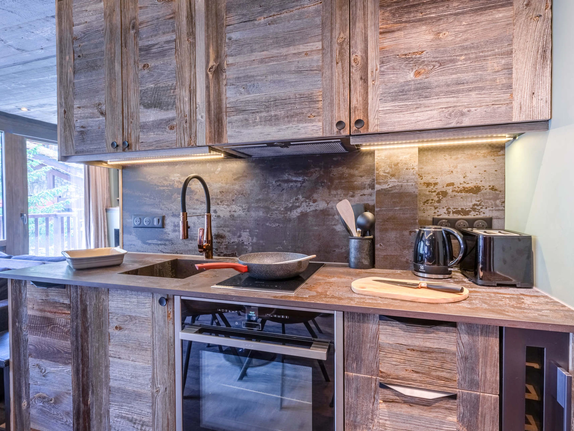 Equipped with dishwasher, oven, microwave oven, hood, induction hob, fridge with freezer, wine cooler