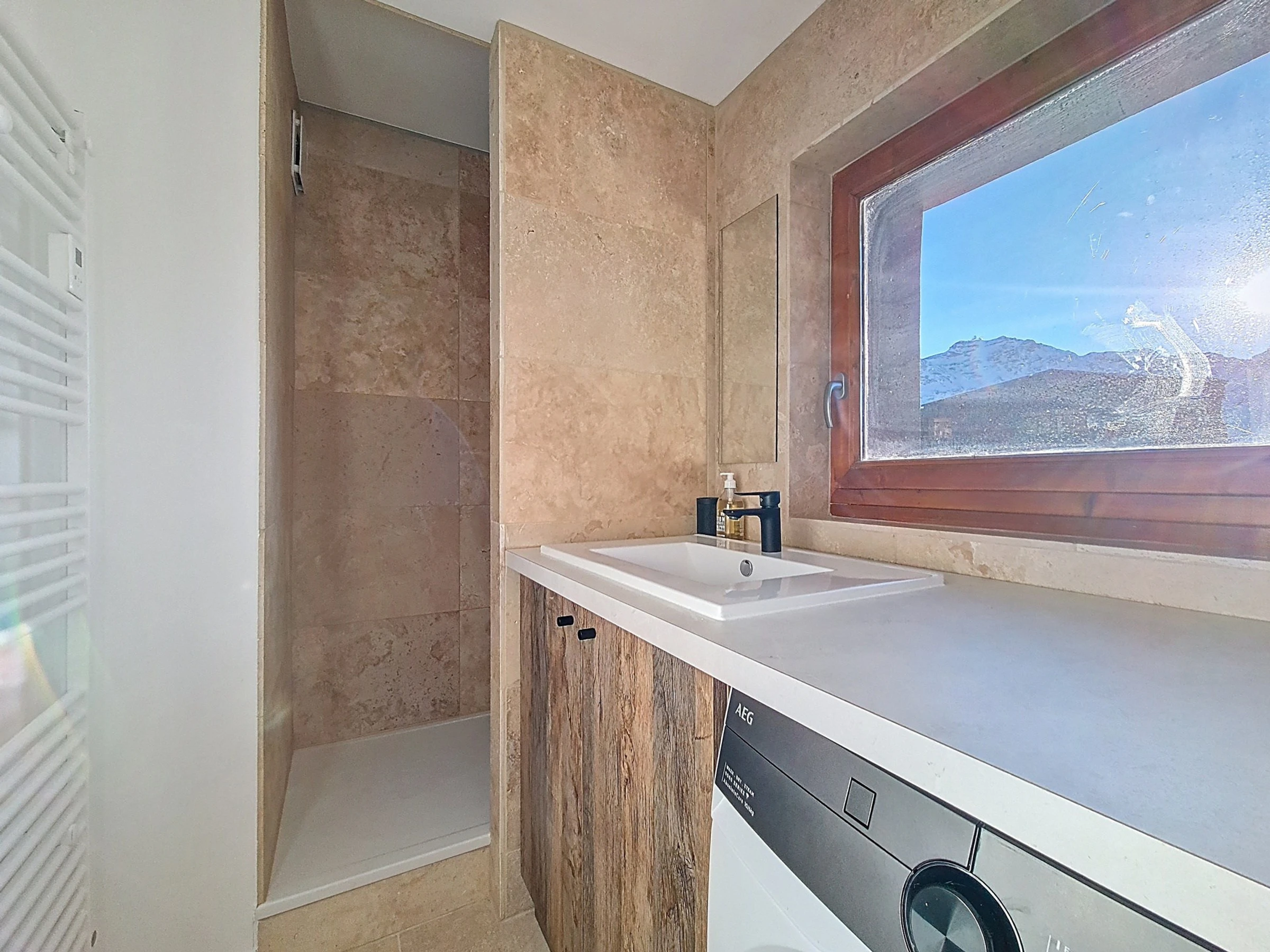 Bathroom with shower and washing machine.
