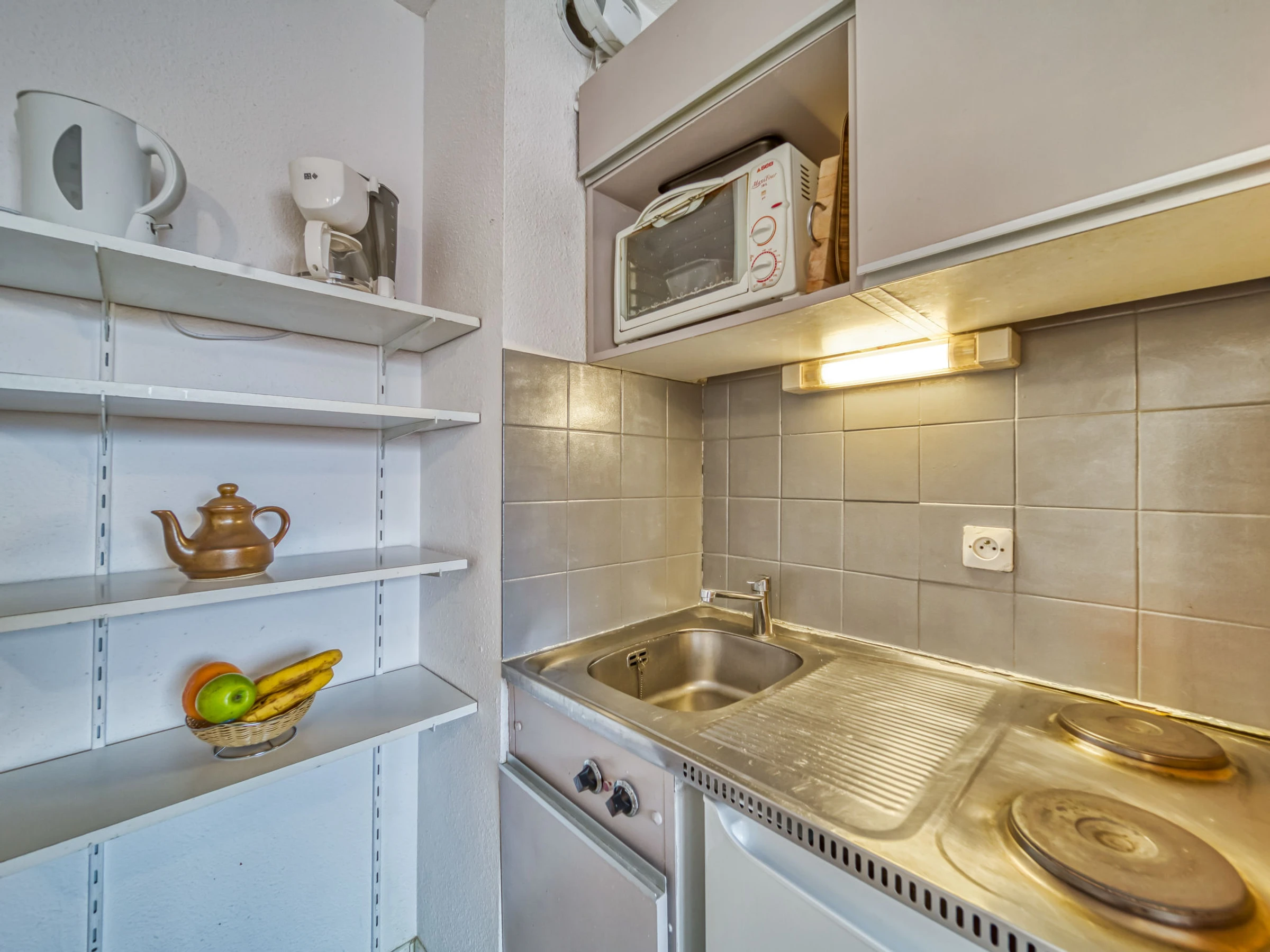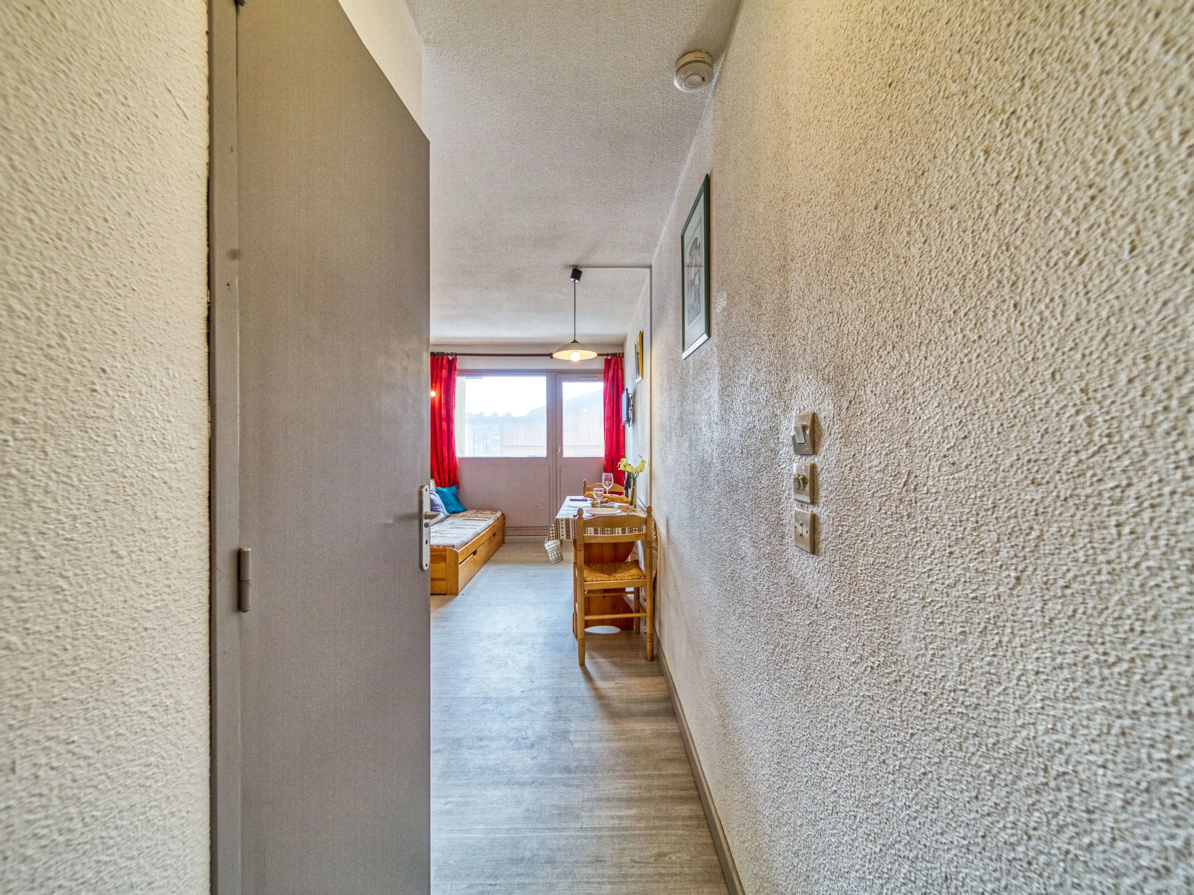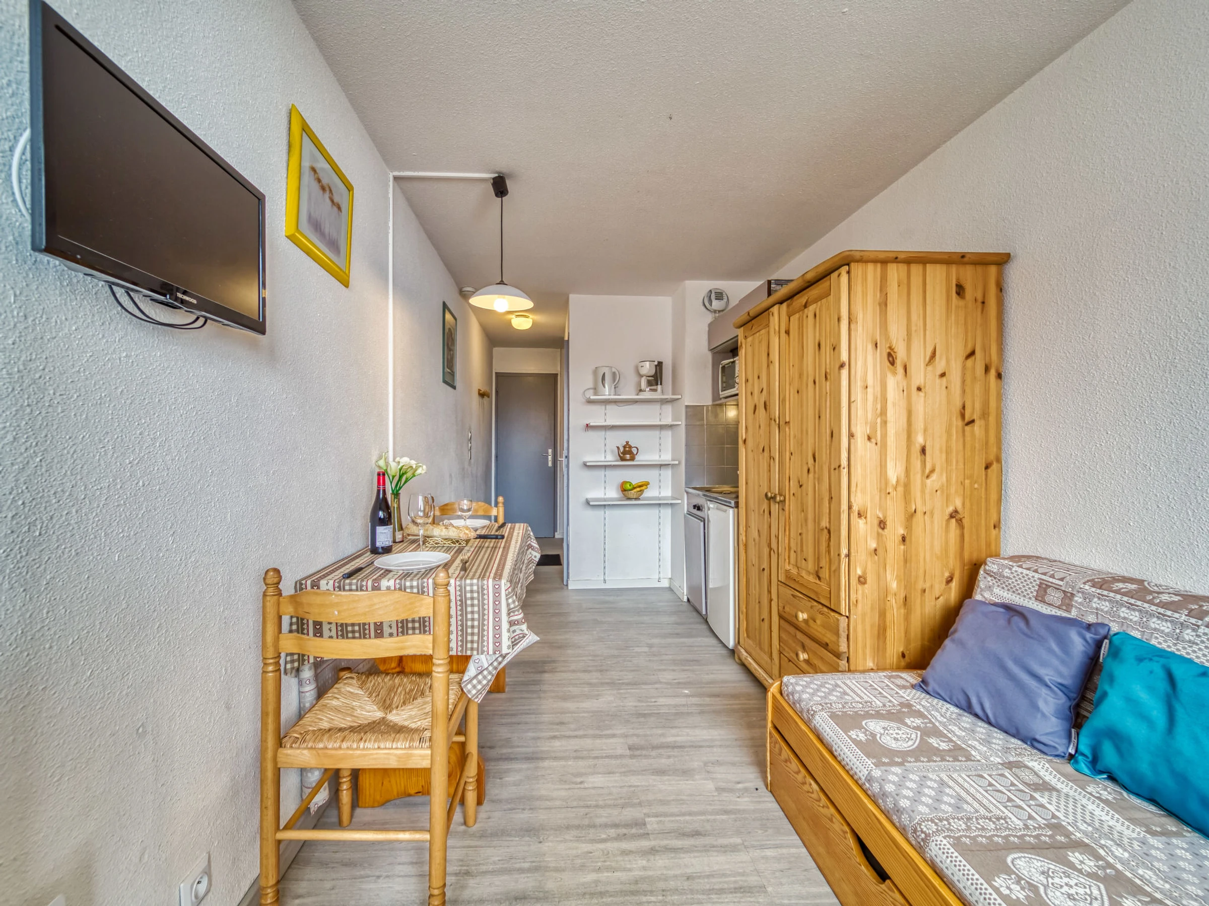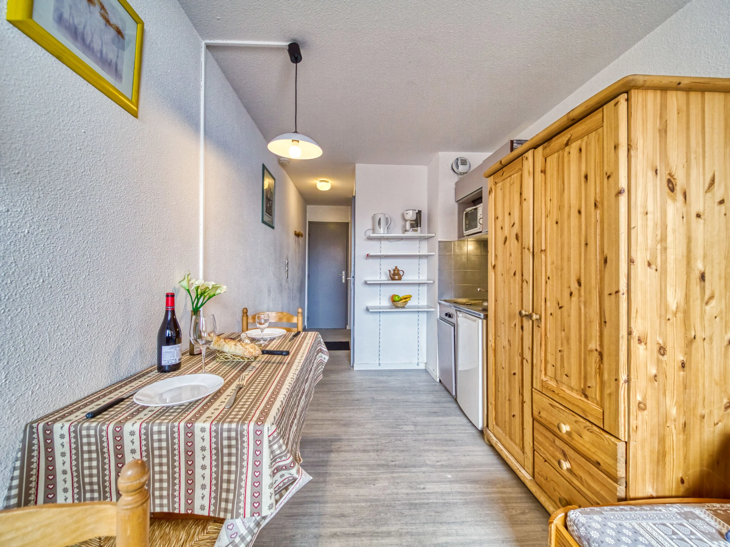 "Vanoise 172", 1-room apartment 15 m2 on 1st floor. Living/dining room with 1 pull-out bed (2 pers. 2 x 80 cm, length 190 cm), TV (flat screen), electric heater. Kitchenette (2 hot plates, oven, electric coffee machine). Shower/WC. Balcony, north facing position. Facilities: Internet (WiFi, extra). Maximum 1 pet/ dog allowed. [hidden]