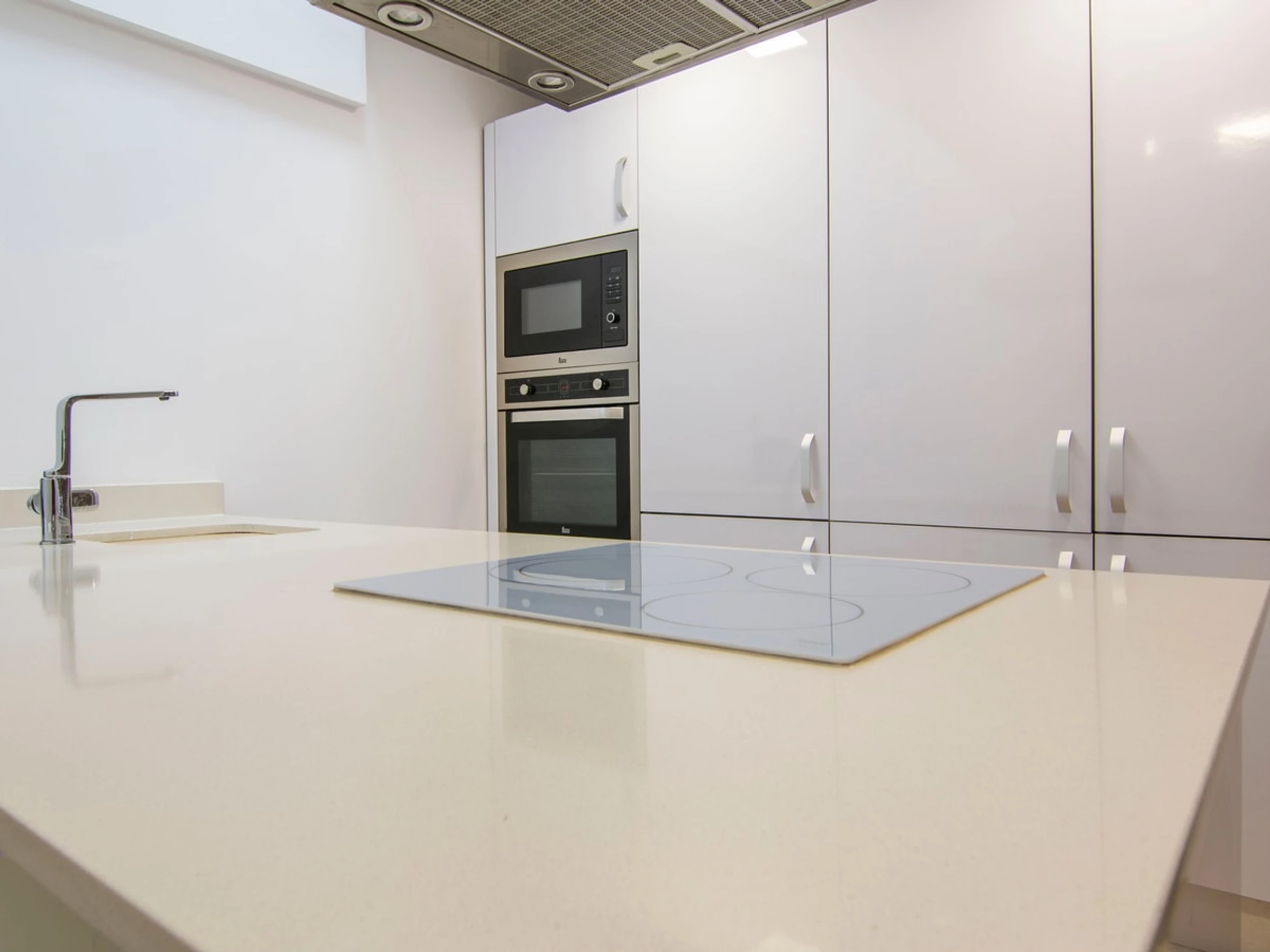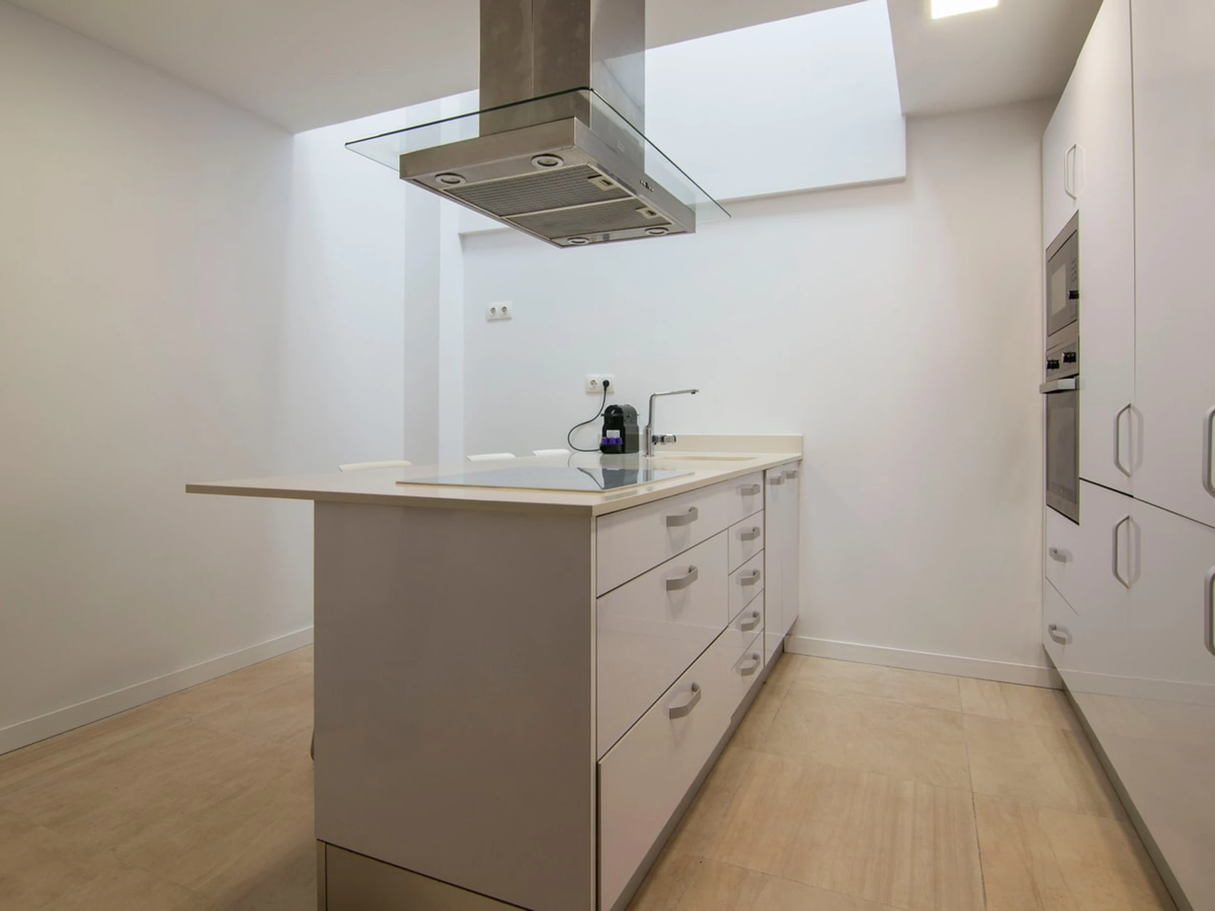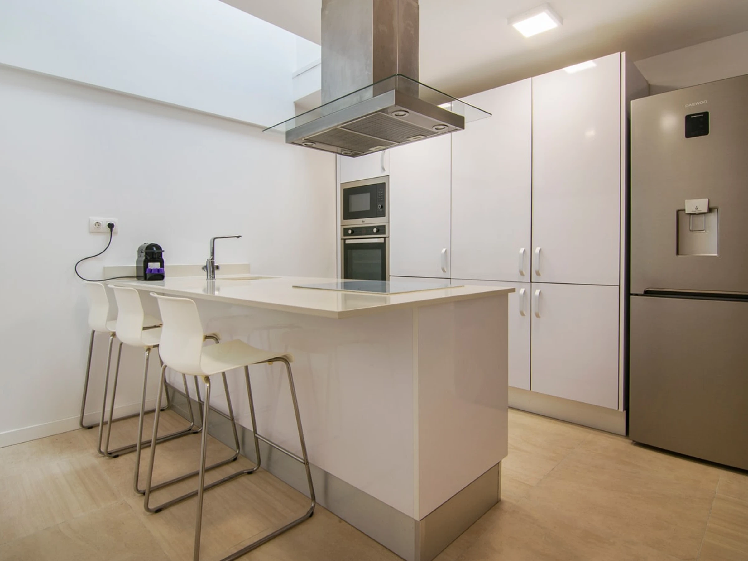The kitchen is fully equipped with a Nespresso machine, oven, microwave, and fridge, allowing guests to easily prepare their meals during their stay.