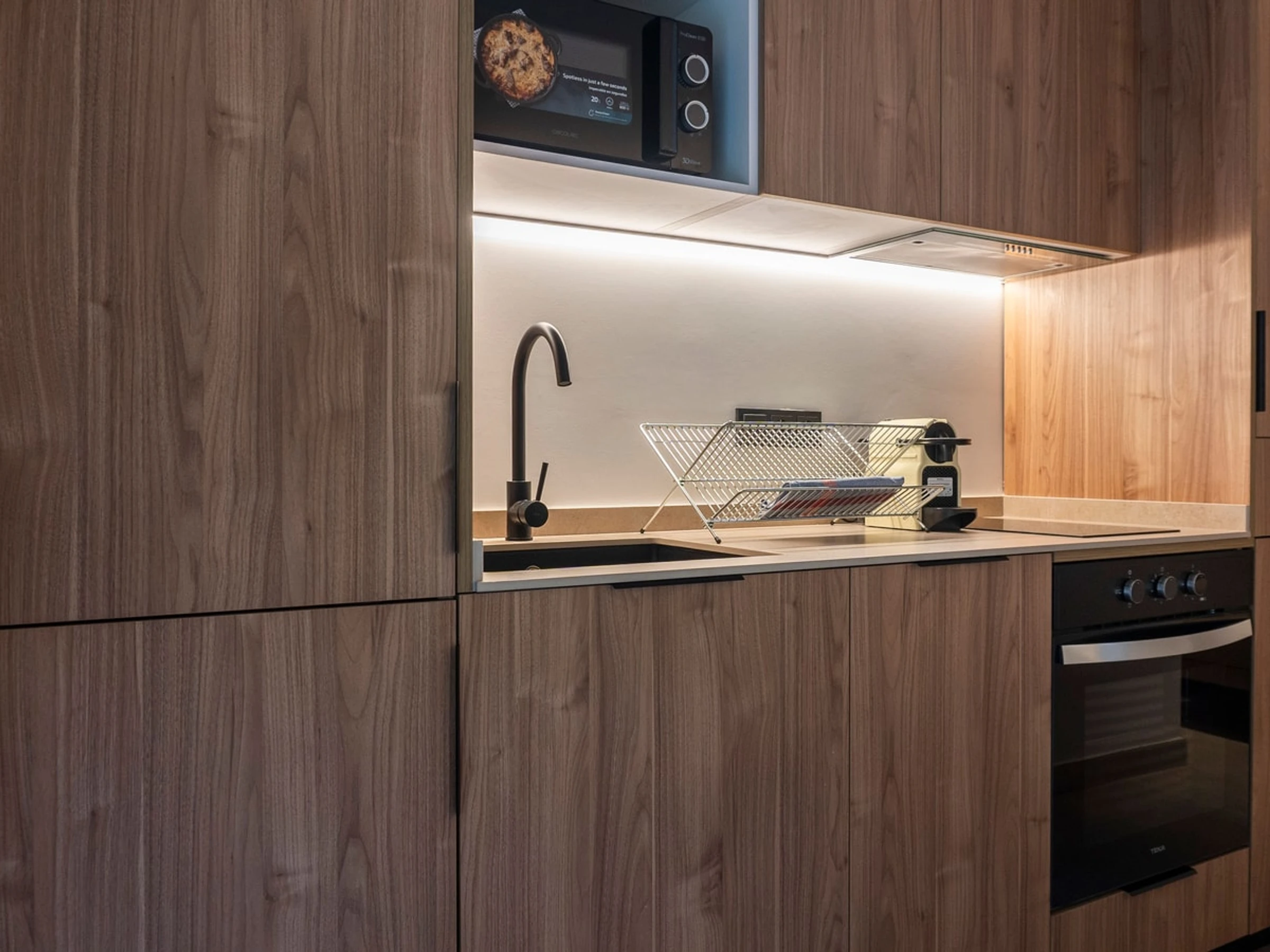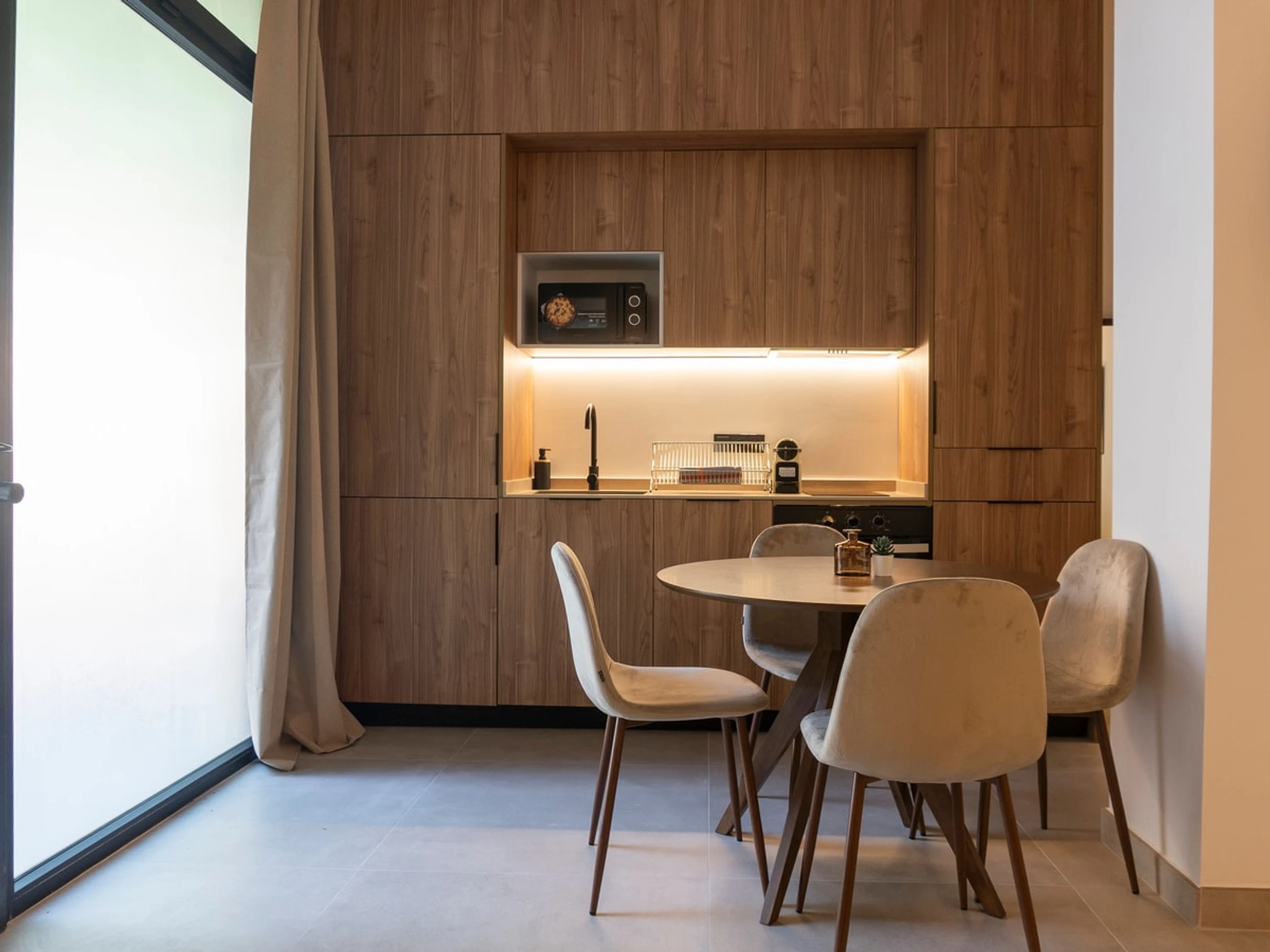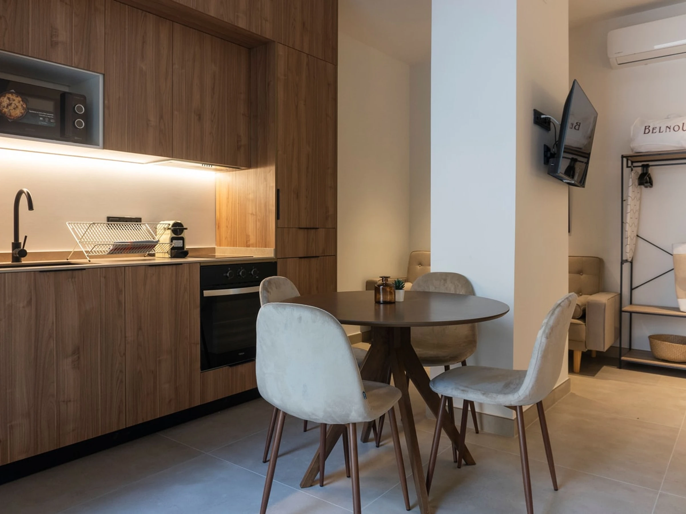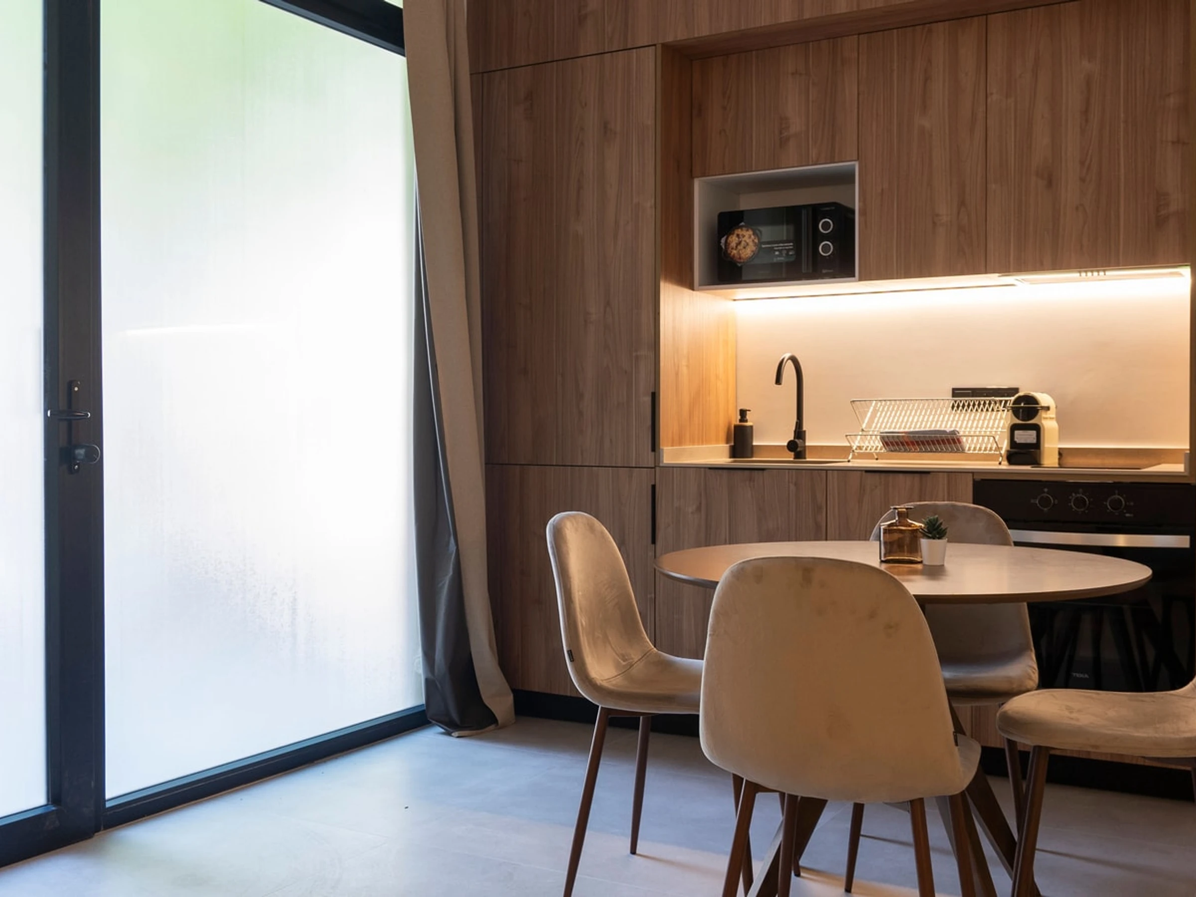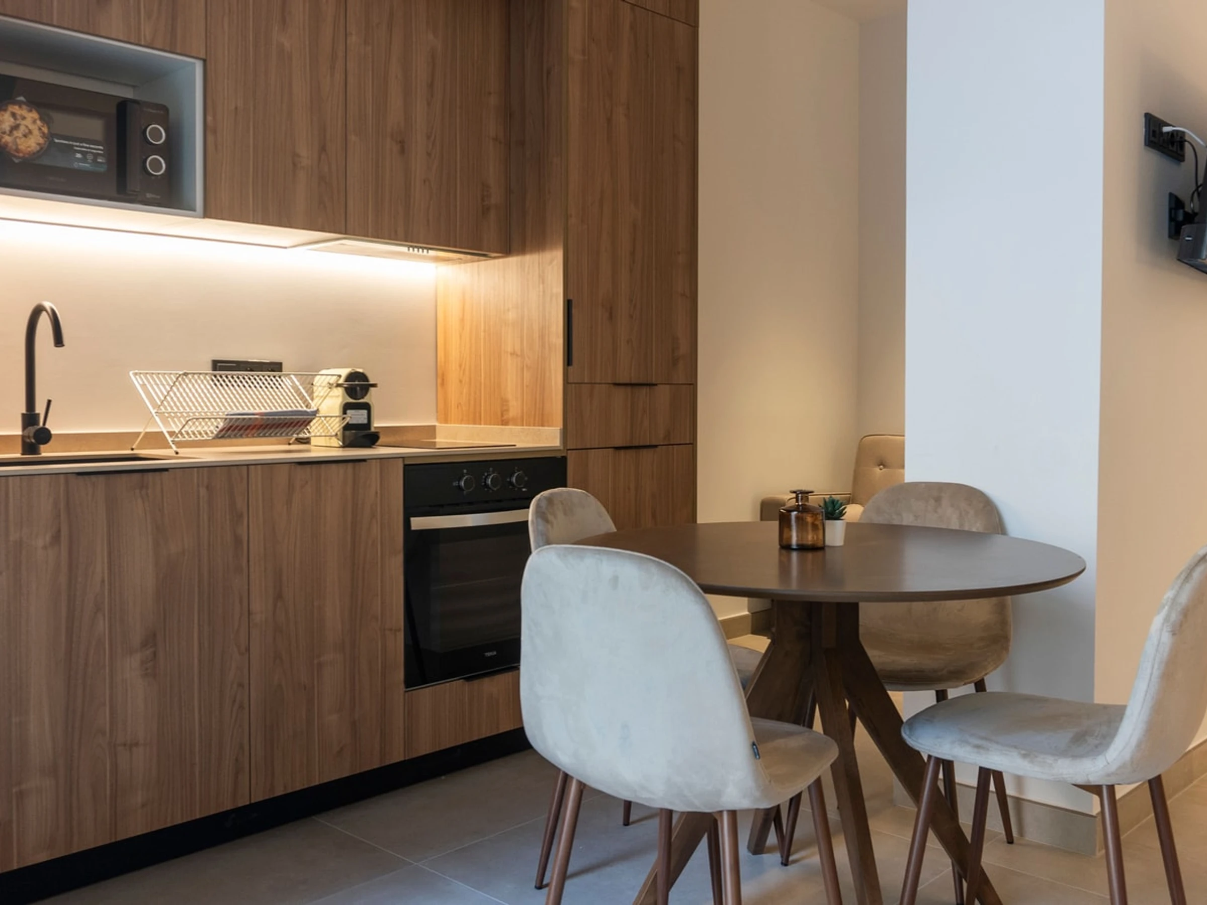 The kitchen is fully equipped with all the appliances you might need, including a Nespresso coffee machine to enjoy your mornings with delicious coffee, a microwave to quickly heat your meals, and an electric kettle to prepare your favorite tea at any time of day.