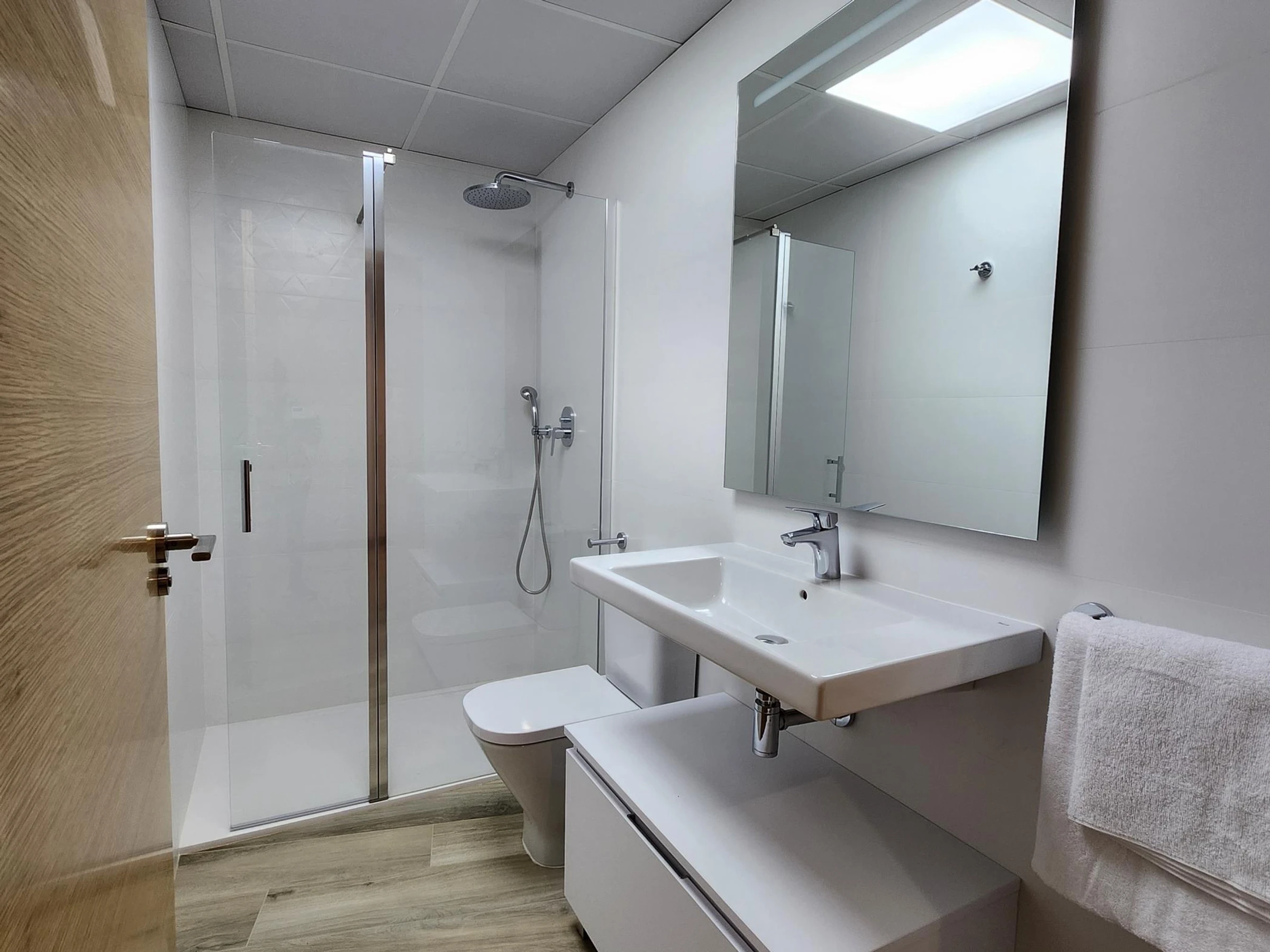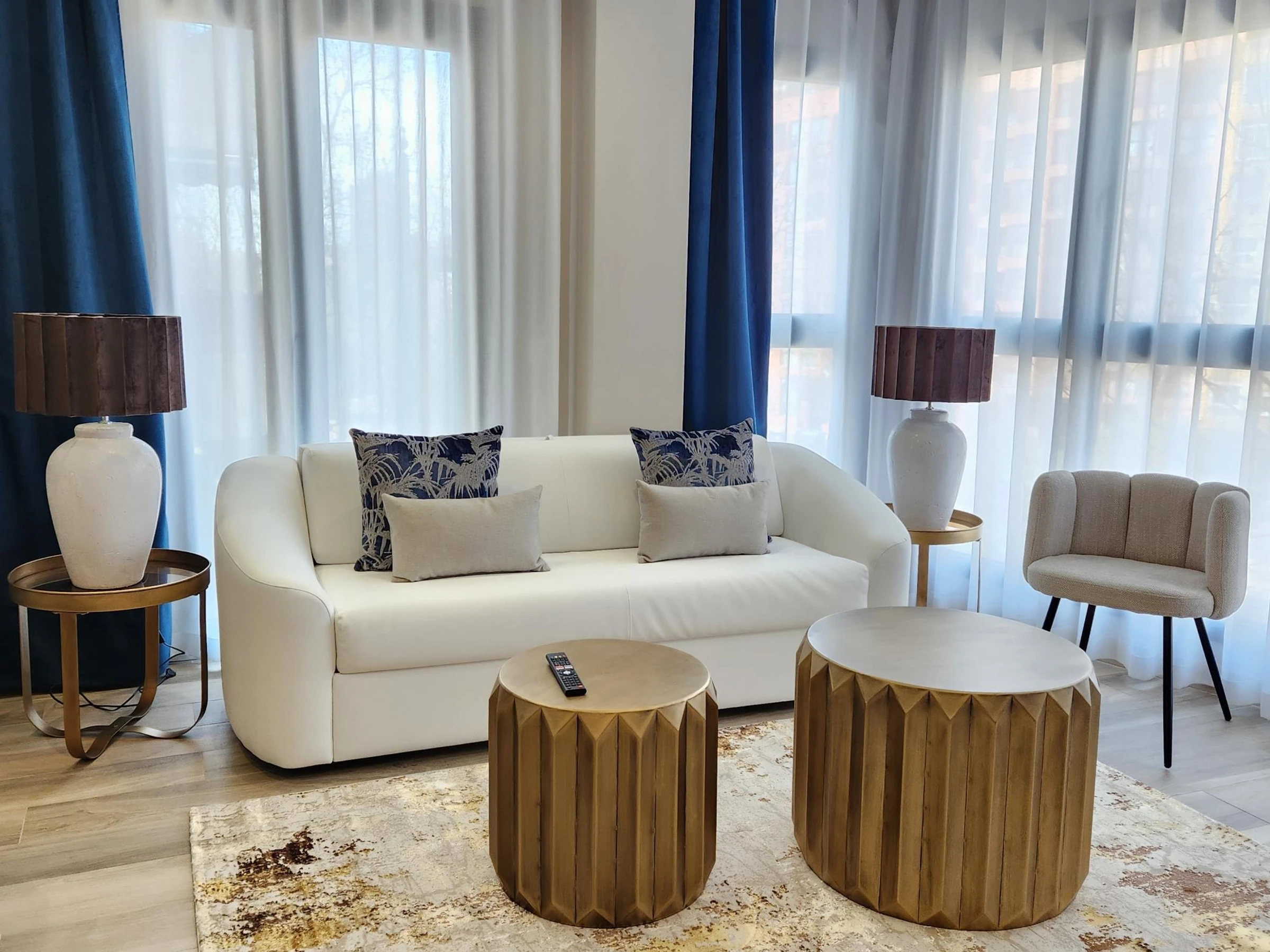 The apartment is situated in a recently constructed building with an elevator. It features a master bedroom with a 150x190 cm bed, a second bedroom with two single beds, a full bathroom with a shower, a fully equipped kitchen, and a spacious living room with a 140x200 cm double sofa bed. High-quality furnishings, natural light, and carefully selected décor create a modern and welcoming atmosphere.
