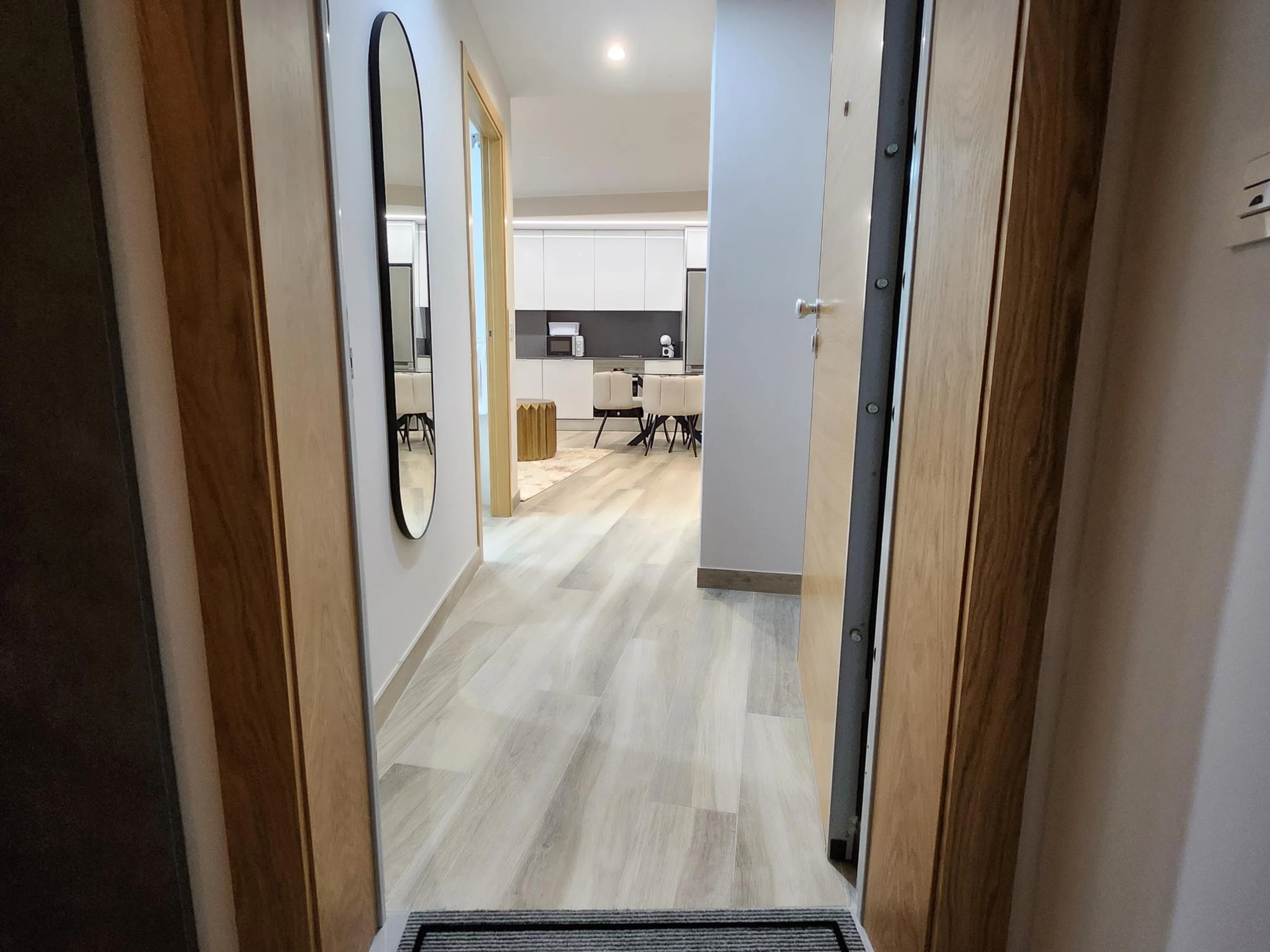The apartment is located in a recently built building with an elevator and is designed for comfort and functionality. It features an open-plan master bedroom with a double bed, a full bathroom with a shower, a fully equipped kitchen, and a spacious living room with a double sofa bed. High-quality furnishings and tasteful décor create a welcoming and modern atmosphere.