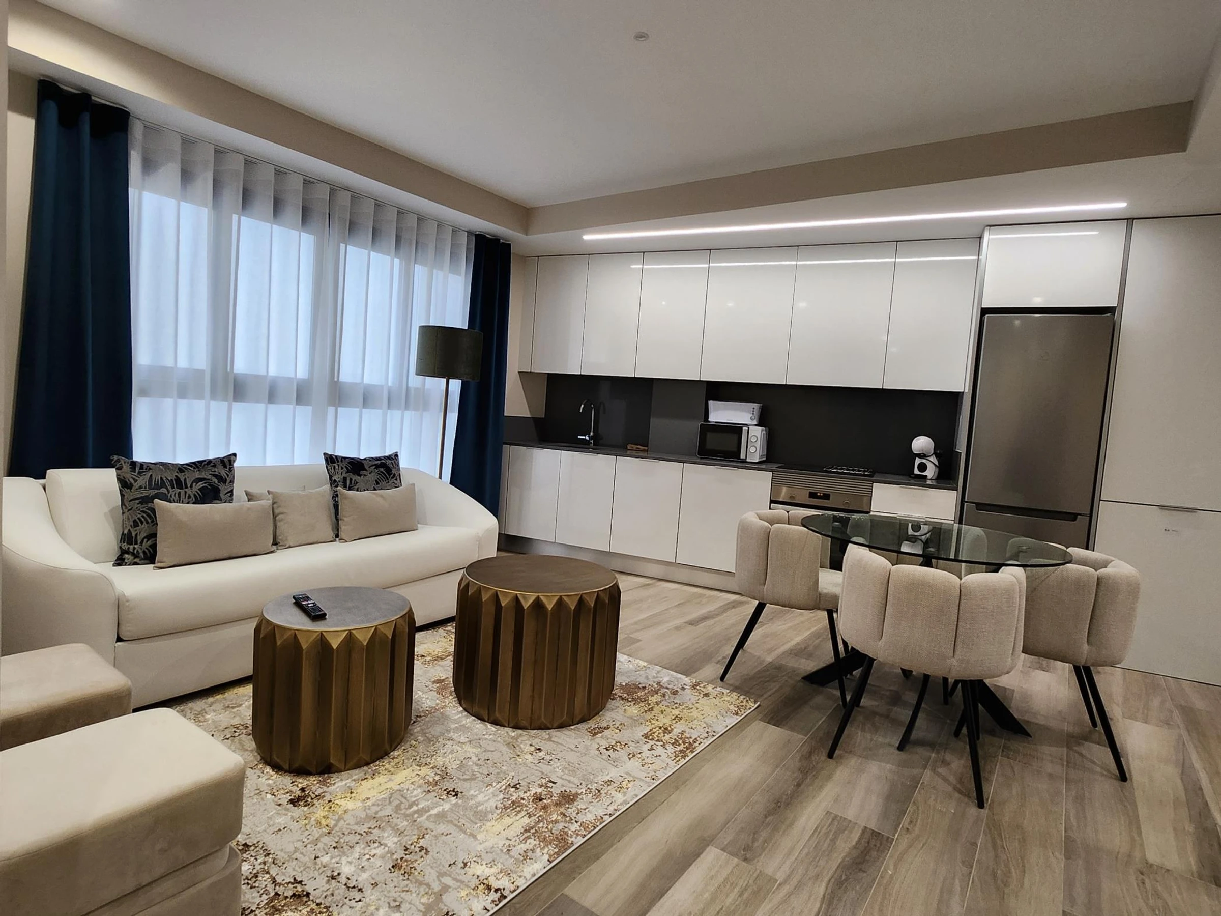 The apartment is located in a recently built building with an elevator and is designed for comfort and functionality. It features an open-plan master bedroom with a double bed, a full bathroom with a shower, a fully equipped kitchen, and a spacious living room with a double sofa bed. High-quality furnishings and tasteful décor create a welcoming and modern atmosphere.