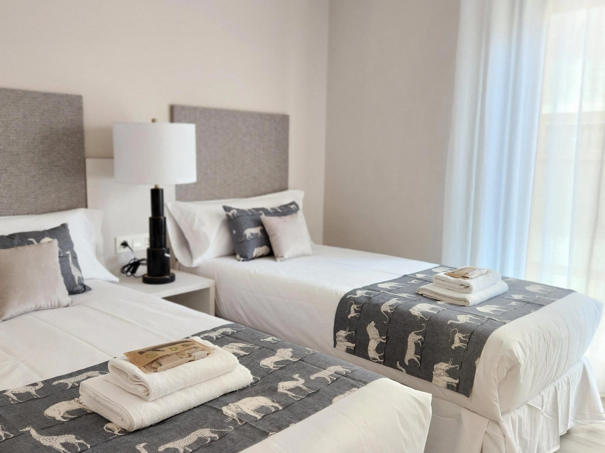 The apartment is situated in a recently constructed building with an elevator. It features a master bedroom with a 150x190 cm bed, a second bedroom with two single beds, a full bathroom with a shower, a fully equipped kitchen, and a spacious living room with a 140x200 cm double sofa bed. High-quality furnishings, natural light, and carefully selected décor create a modern and welcoming atmosphere.