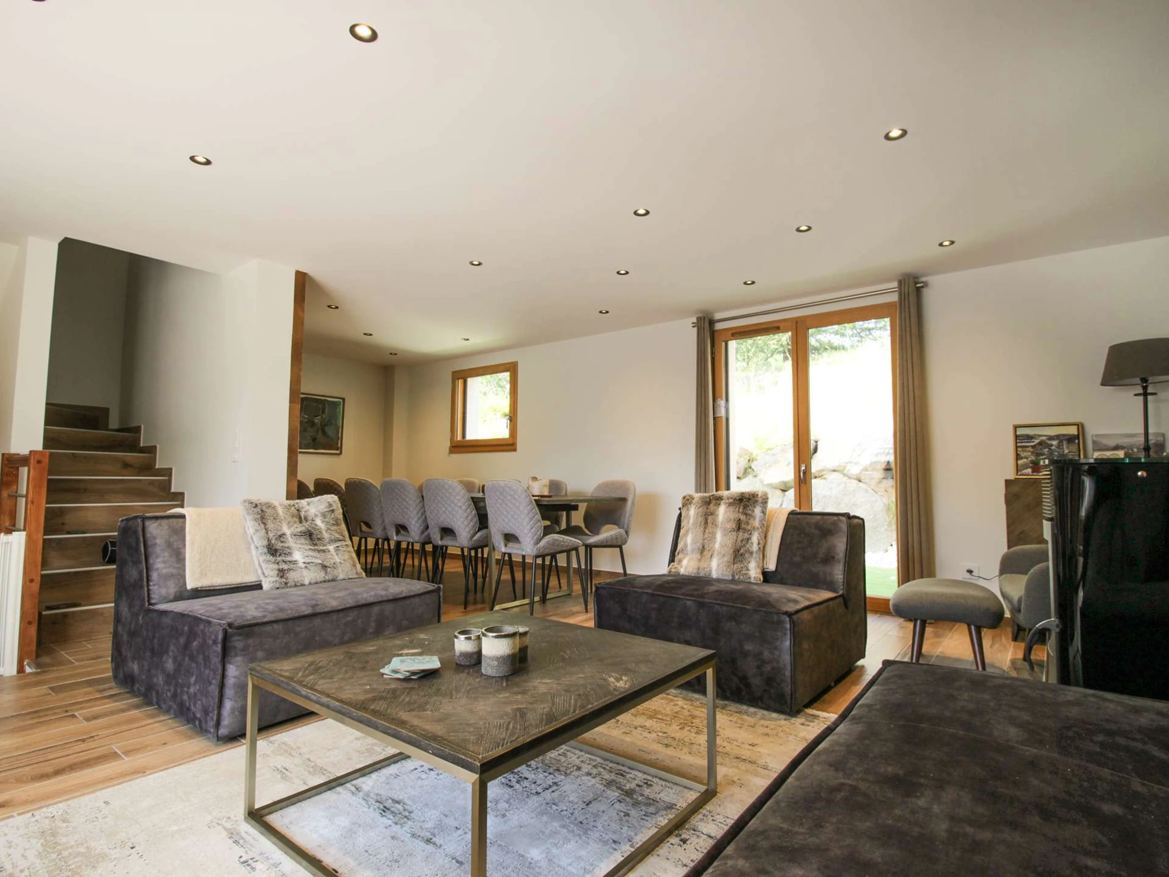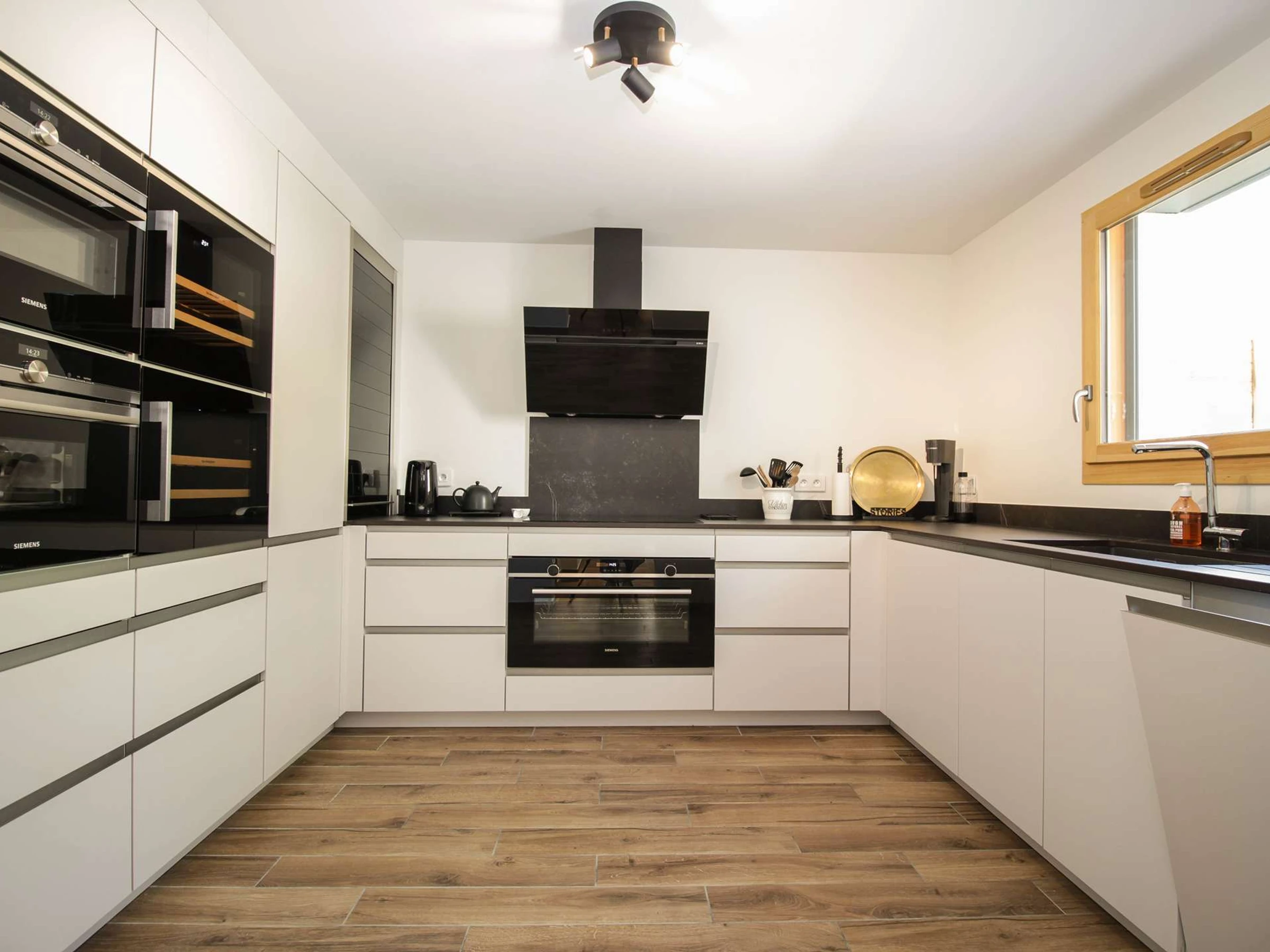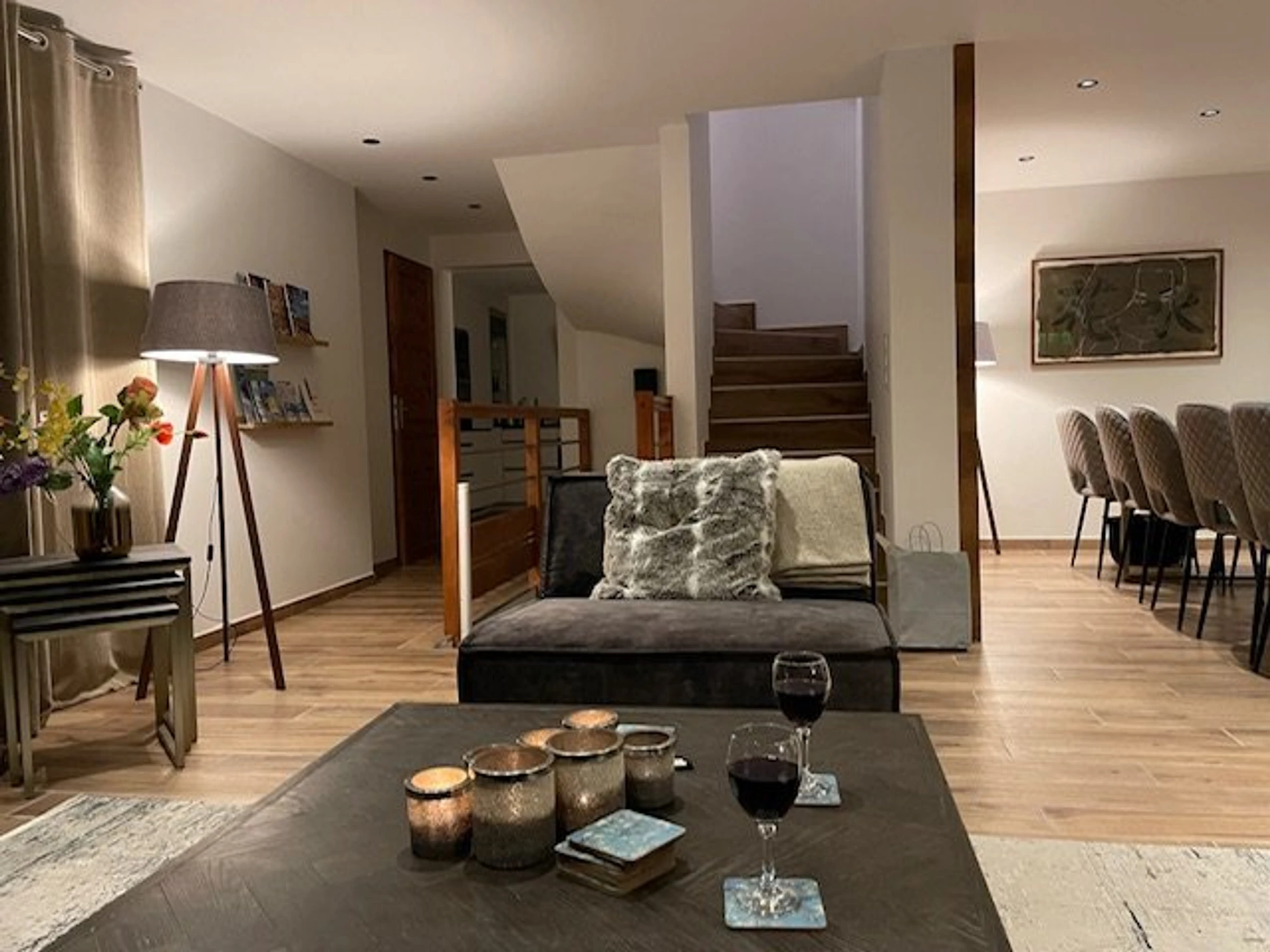 A large living room with a lounge area (no television, but one TV in each bedroom), a pellet stove, a dining area, and a beautiful, fully equipped kitchen: refrigerator/freezer, dishwasher, induction hob, oven, and microwave.