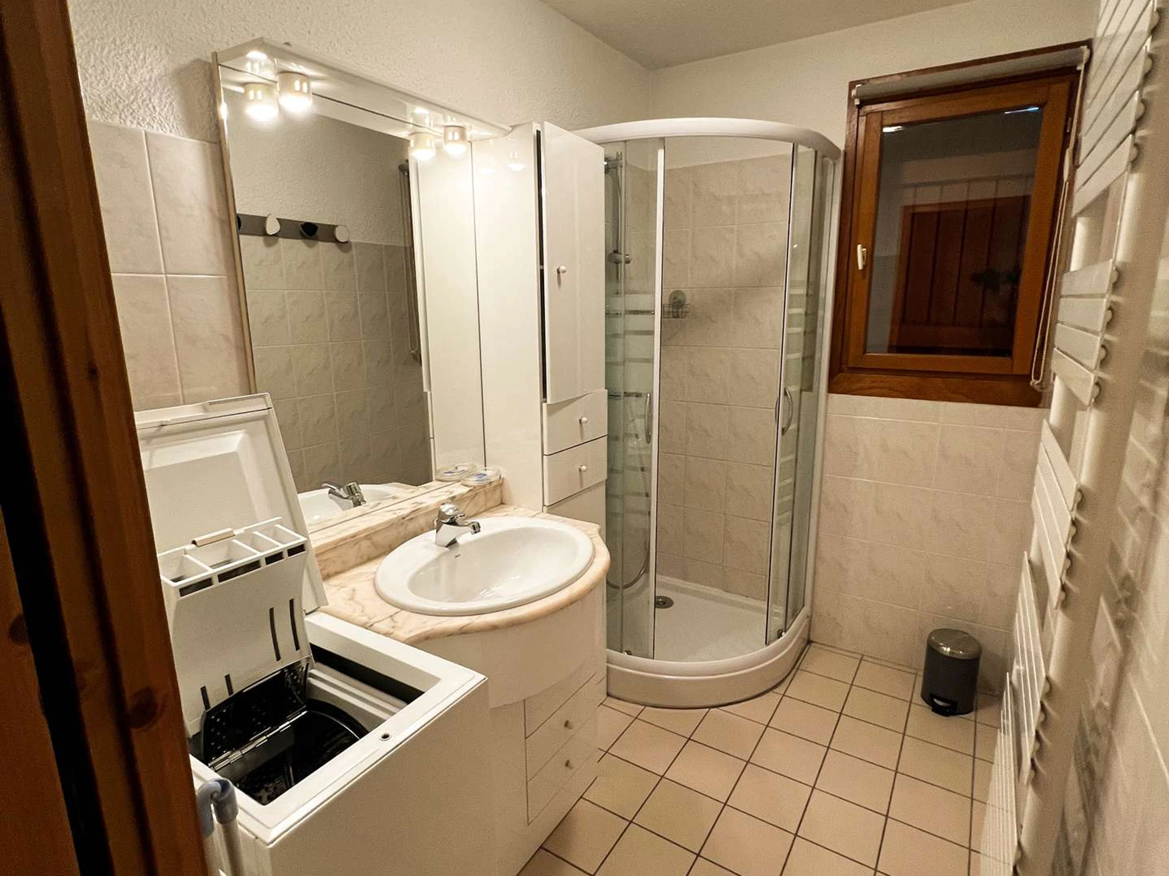 Bathroom: sink, shower, hairdryer, washing machine