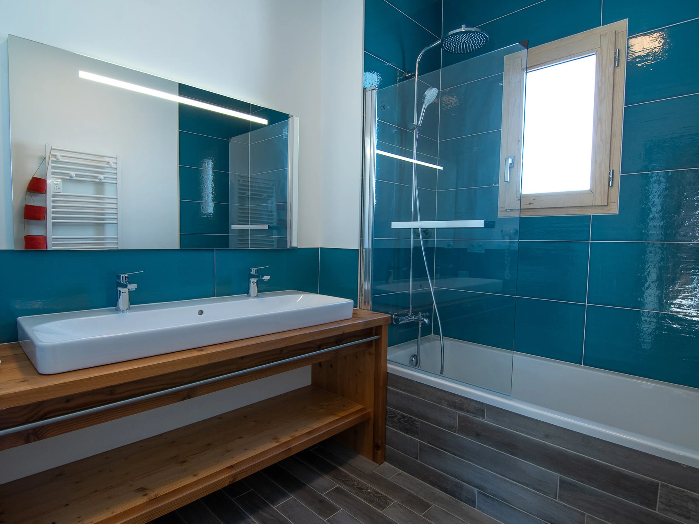 Bathroom 2 (Level +1): double sink, bath and hairdryer.