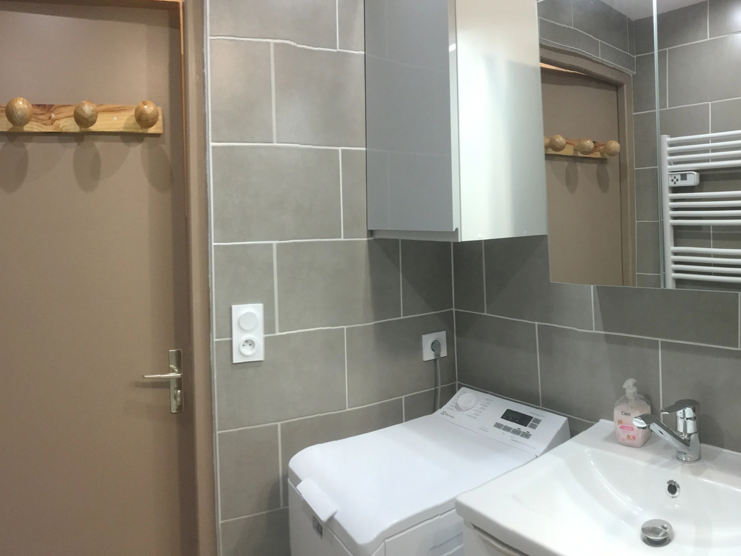 Bathroom: sink, shower, washing machine, hairdryer and WC.
