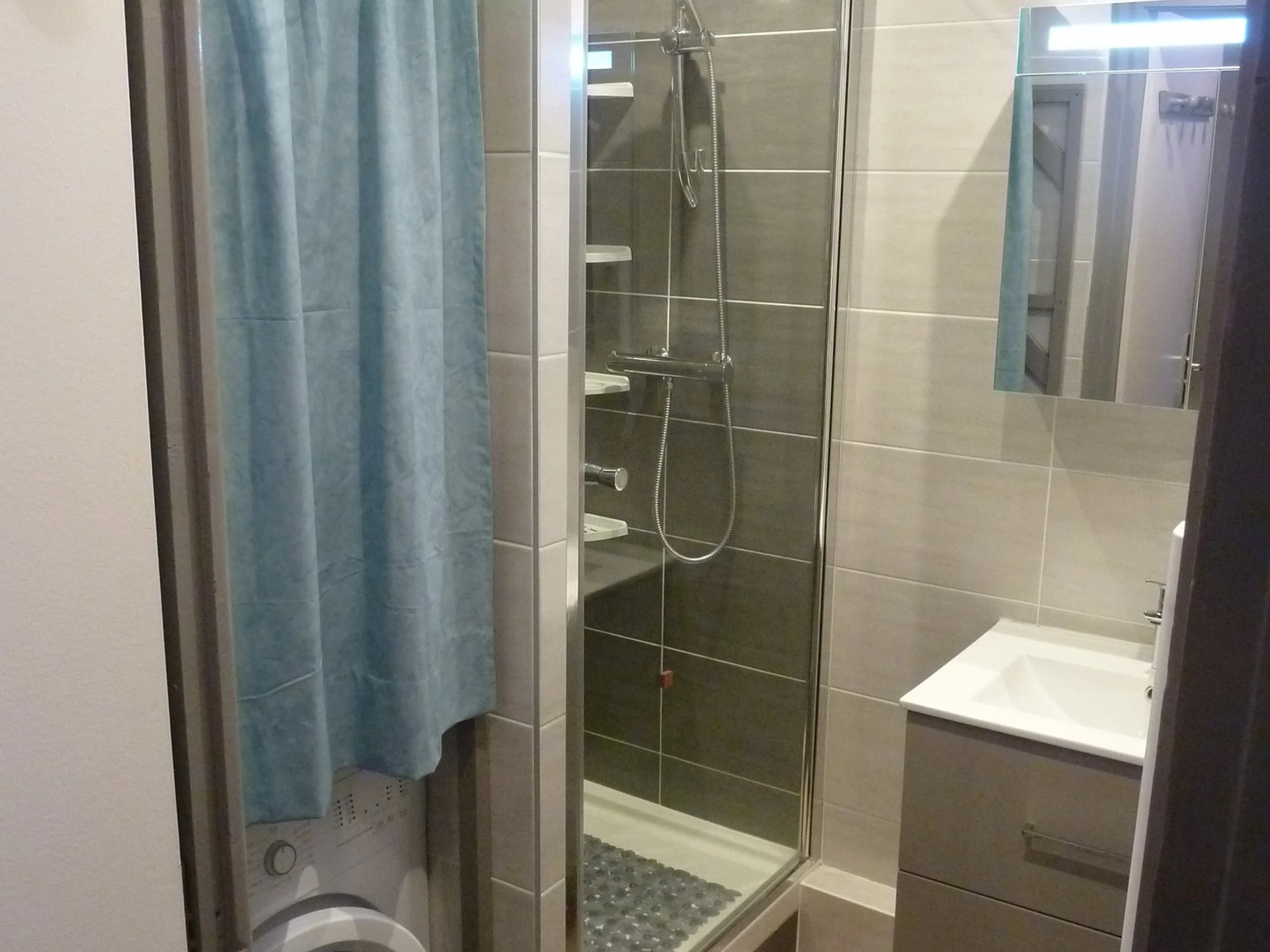 Bathroom: sink, shower, washing machine and hairdryer. Separate WC.
