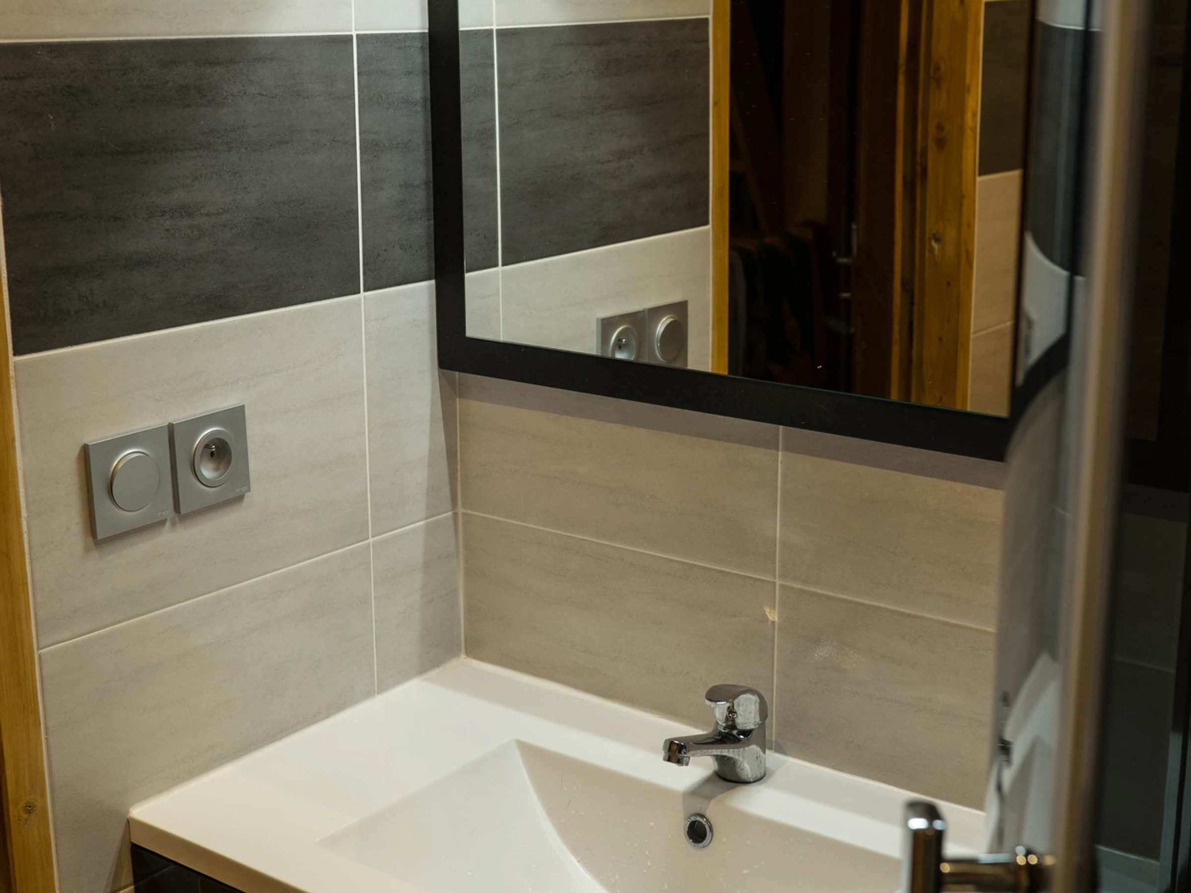 Salle d'eau 1 (Niv +1) : lavabo, douche, lave-linge et sèche-cheveux.