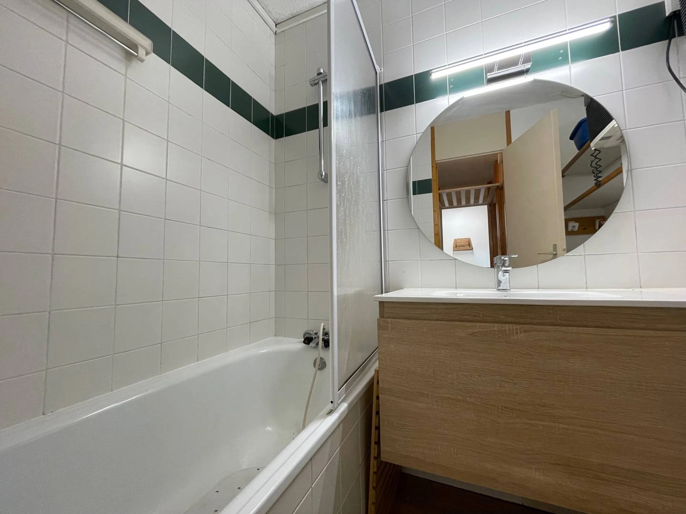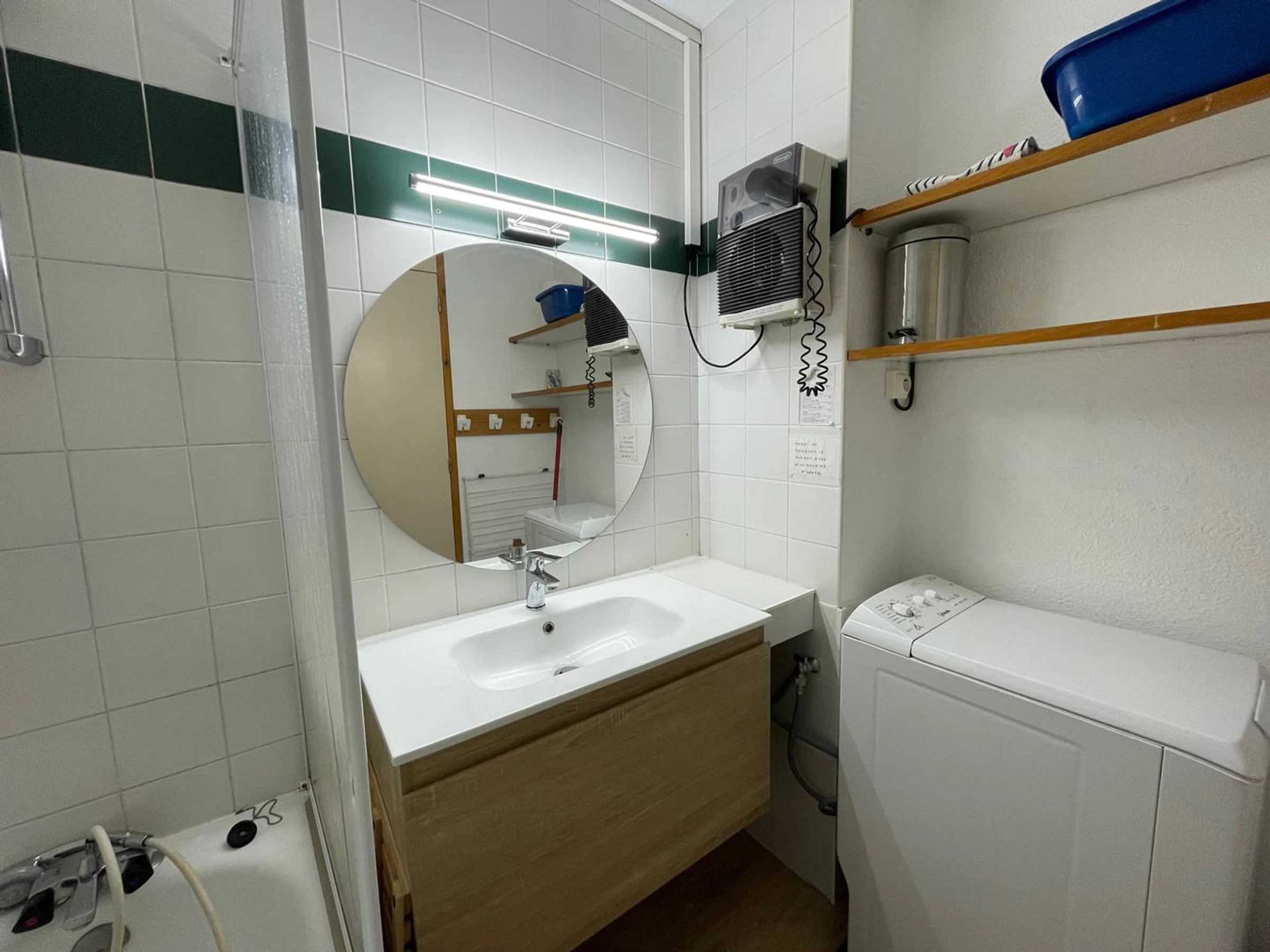 Bathroom with bath and washing machine, separate toilet, terrace overlooking slopes.