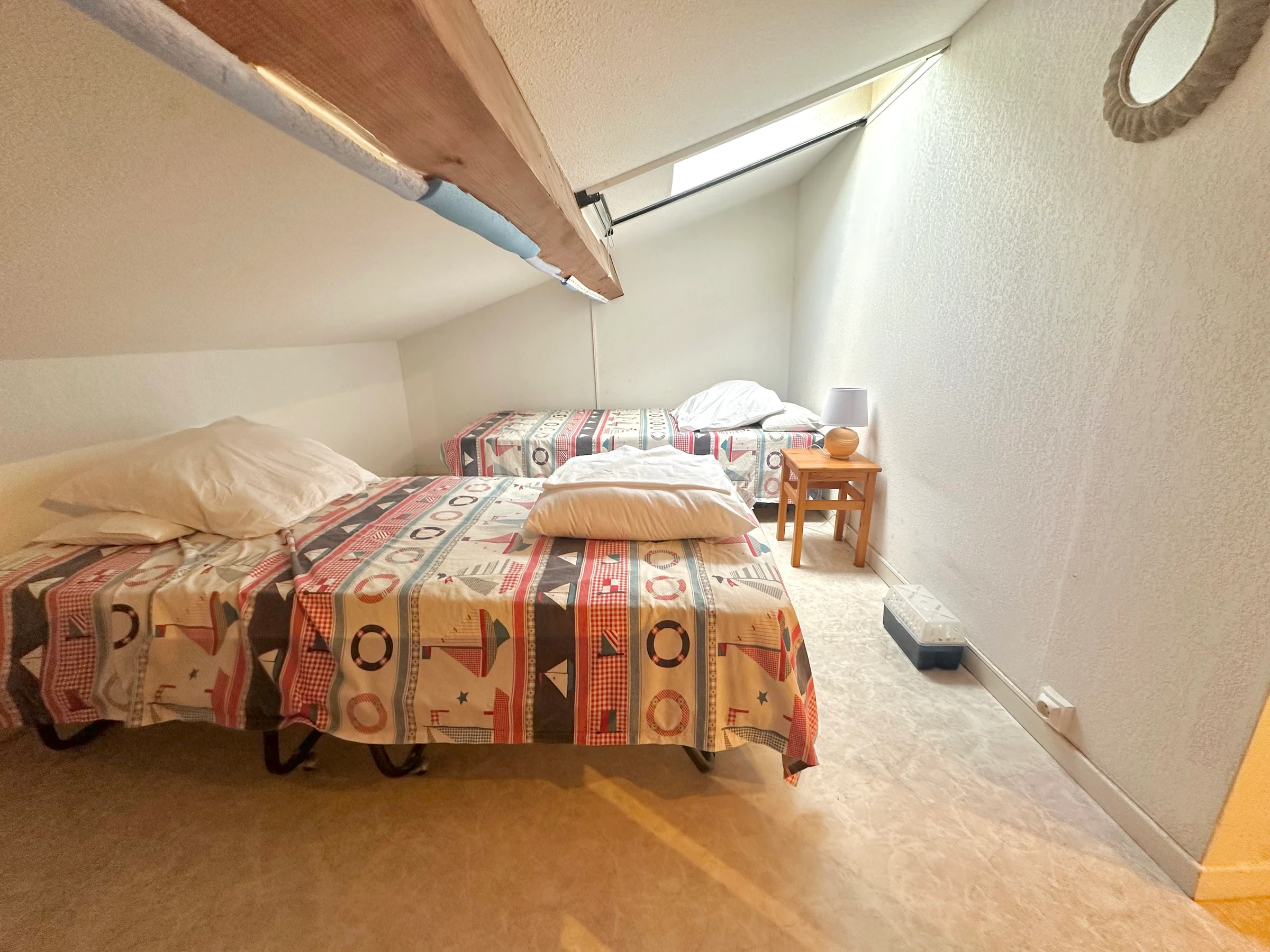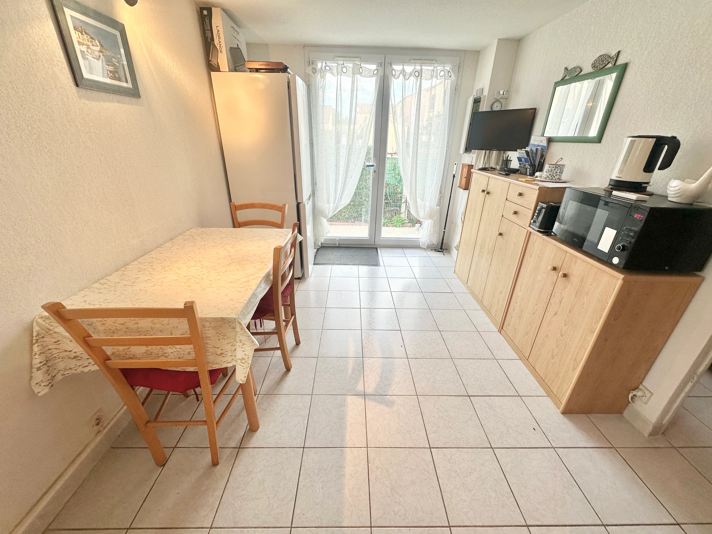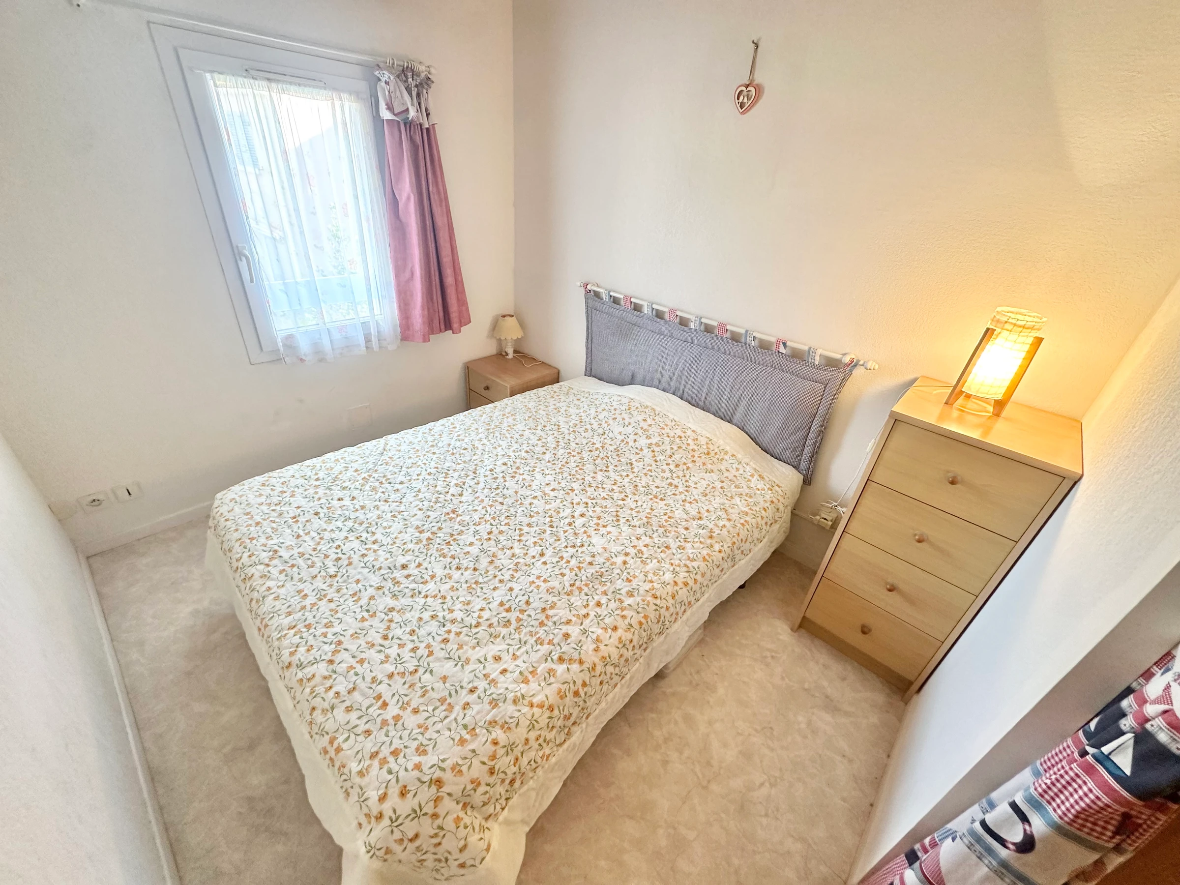 In a secure residence near the beach, in the Les Mouettes area, a corner bungalow comprising a living room, a bedroom with a sofa bed and TV, a fully equipped kitchenette, a shower room, and a separate toilet.