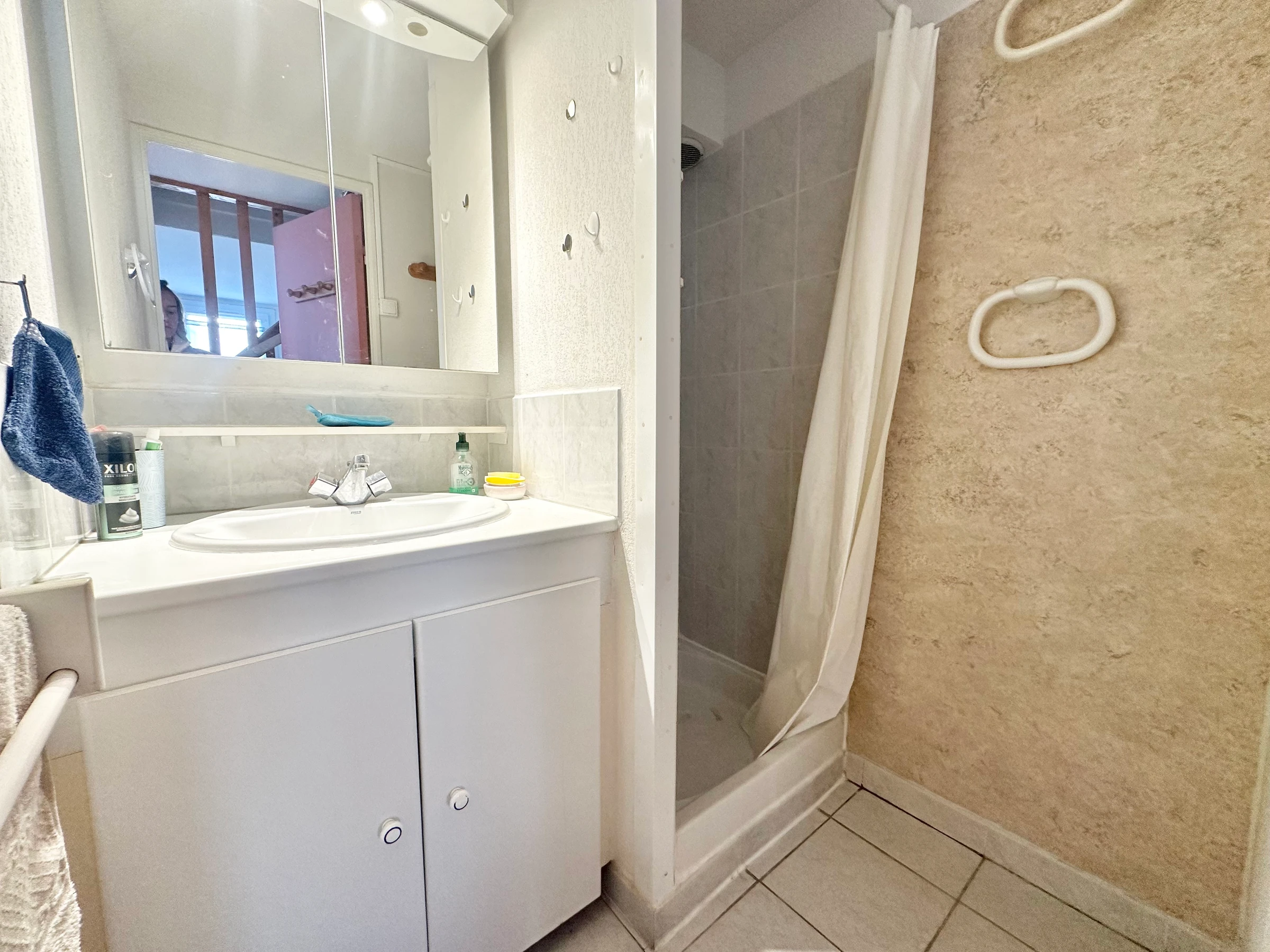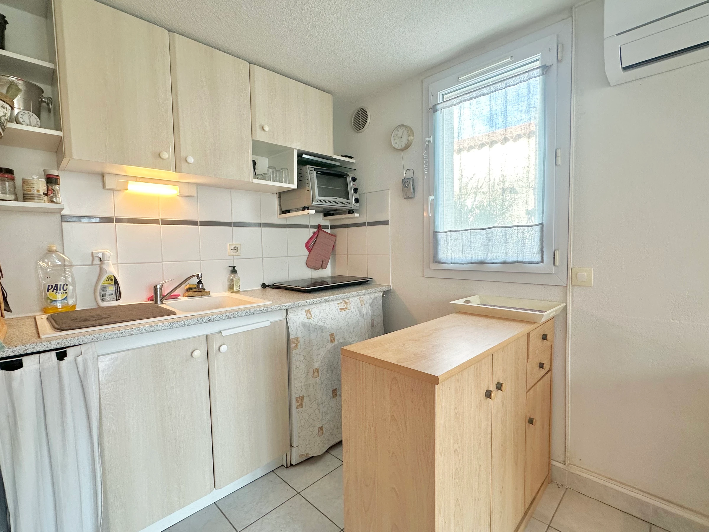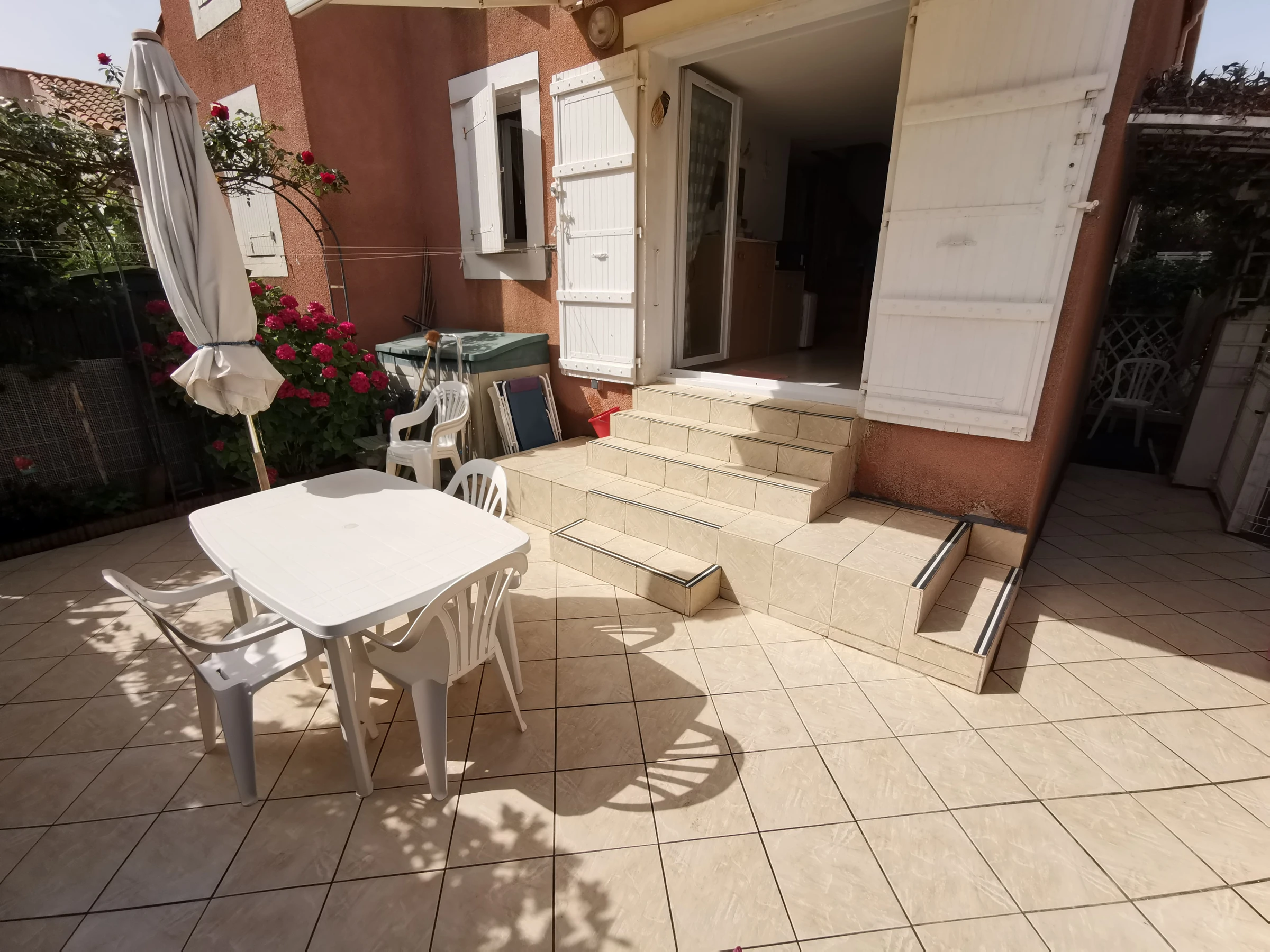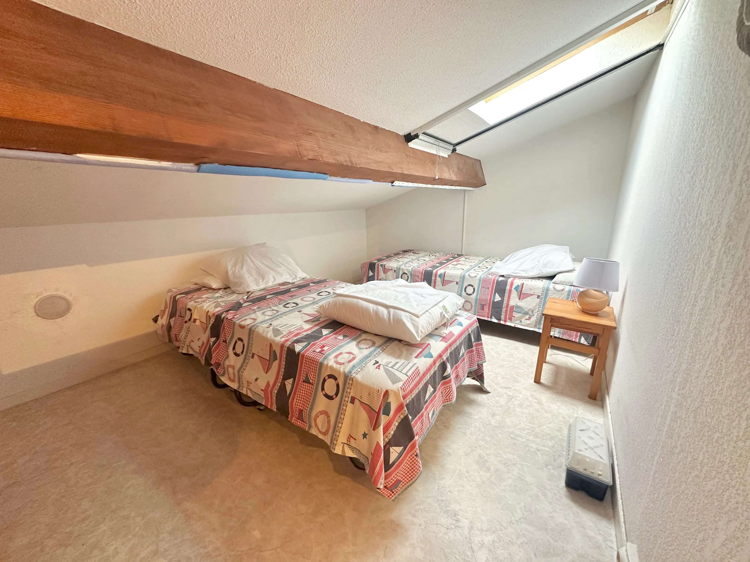 In a secure residence near the beach, in the Les Mouettes area, a corner bungalow comprising a living room, a bedroom with a sofa bed and TV, a fully equipped kitchenette, a shower room, and a separate toilet.