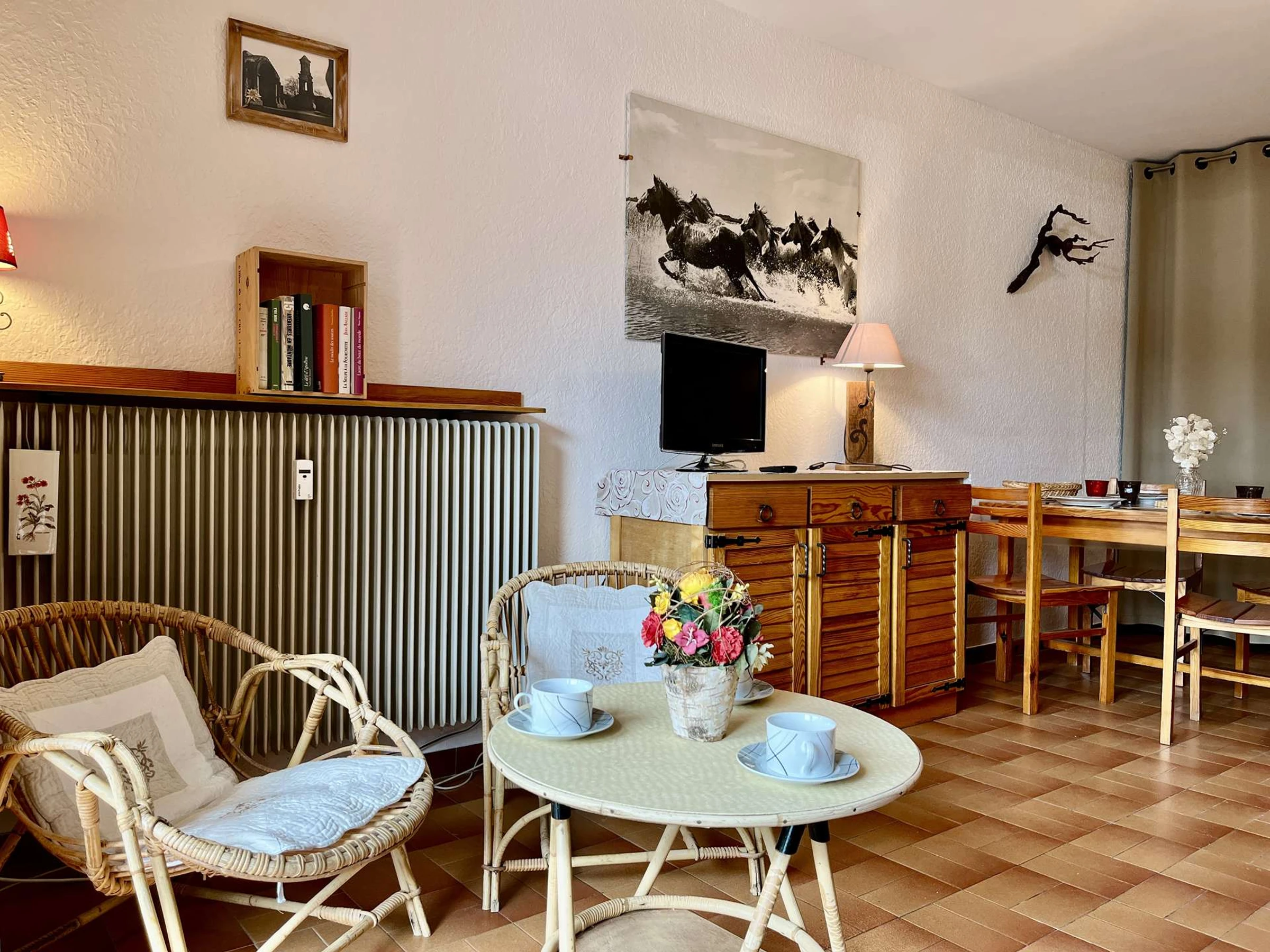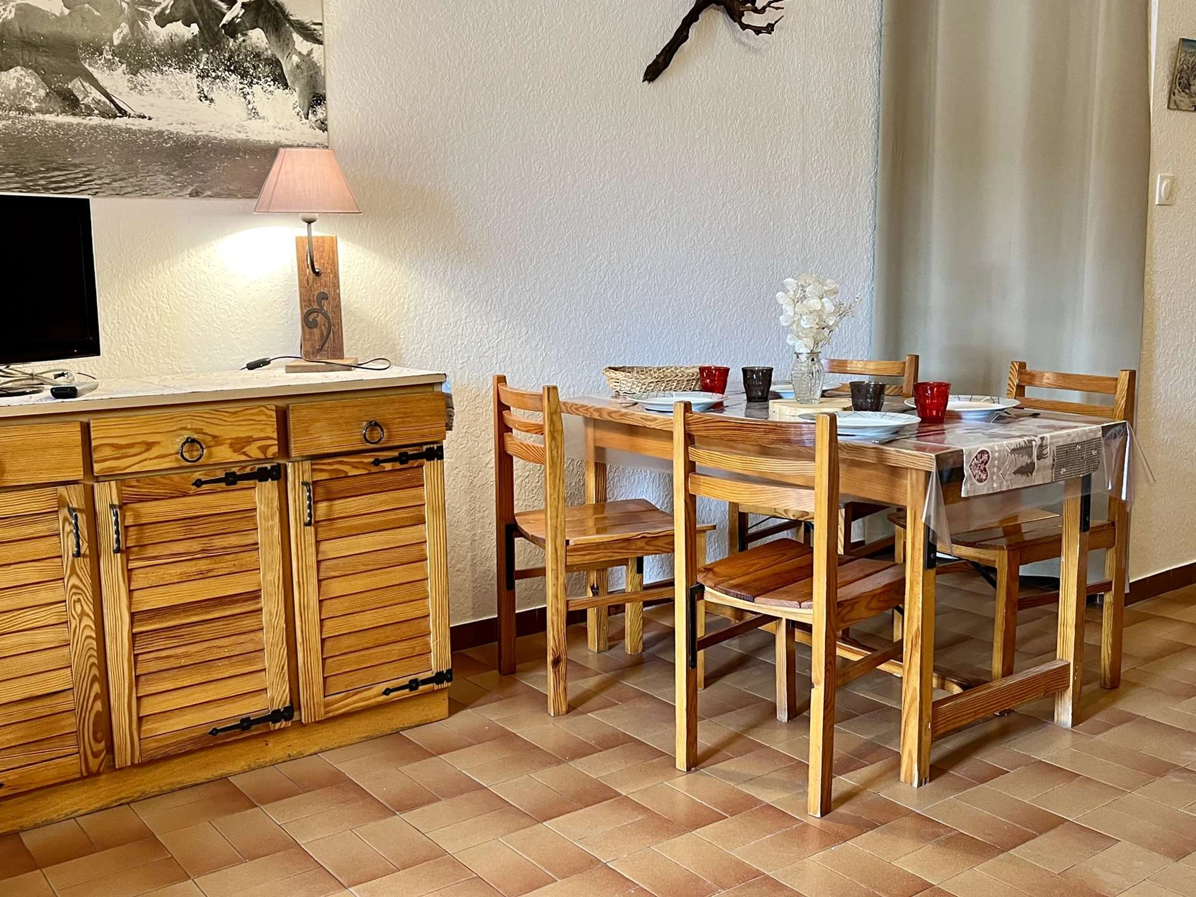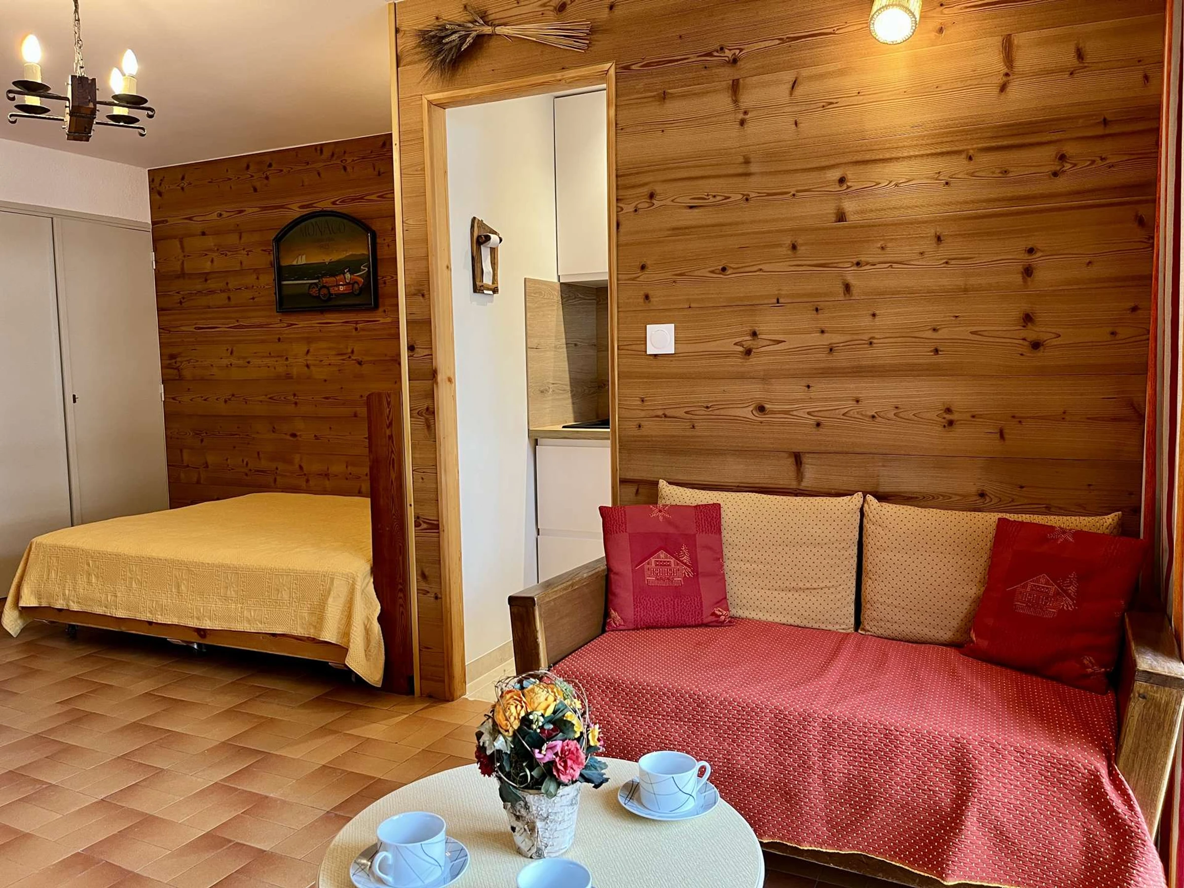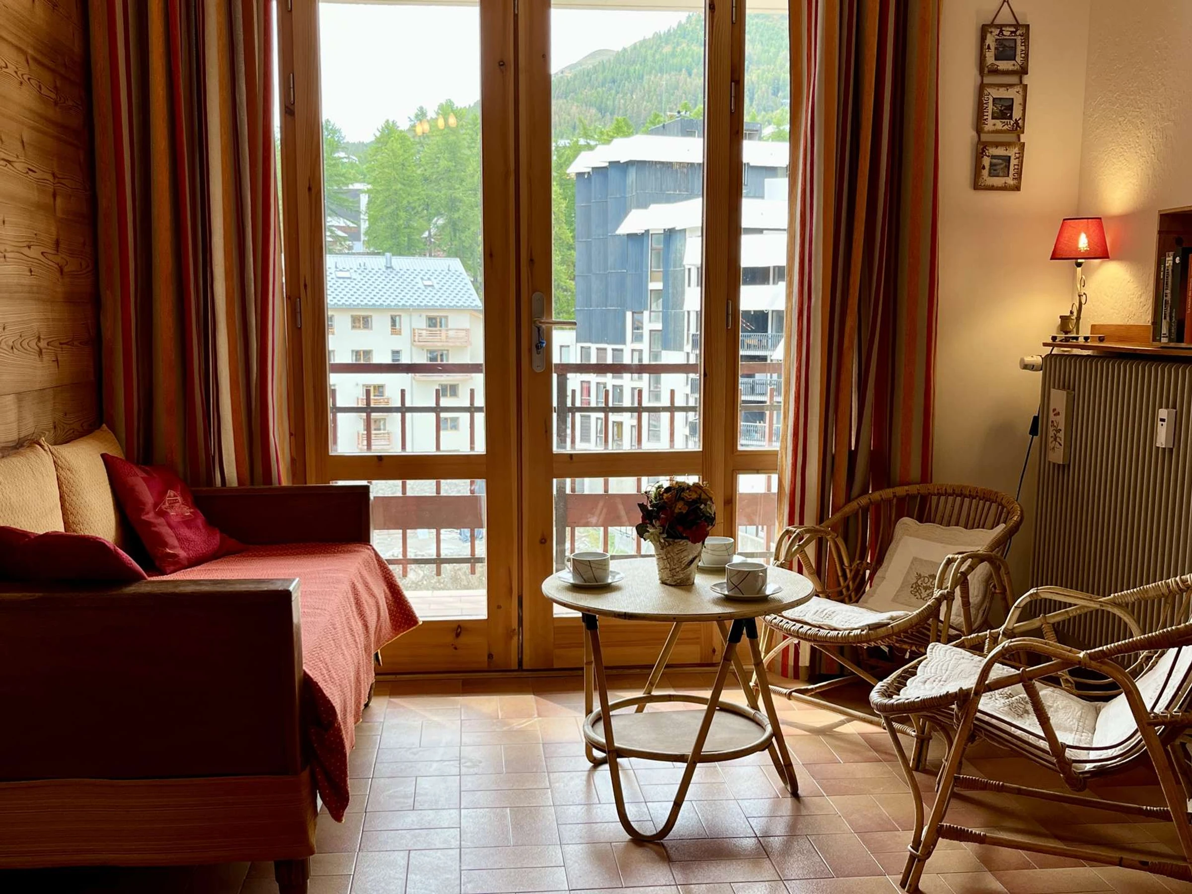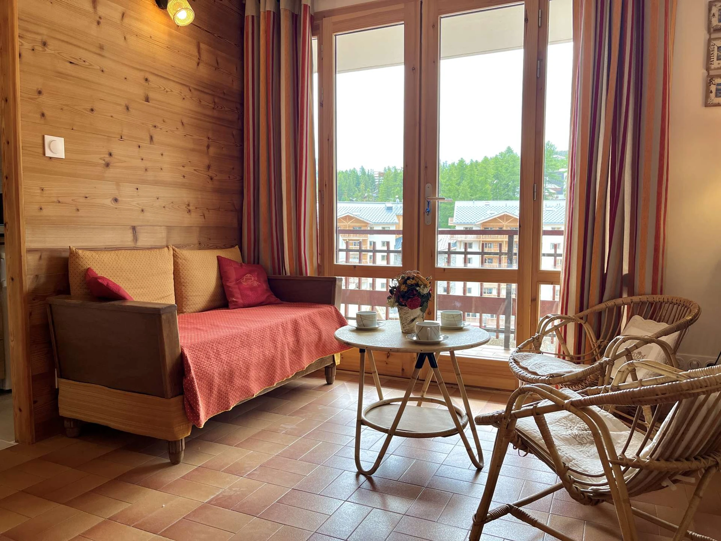 The accommodation: This beautiful mountain studio with a south-facing balcony and lovely views features a fully equipped kitchen area and a living room with a double bed, as well as a sleeping alcove with two single bunk beds (separated from the living room by a curtain). It has a bathroom with a shower and a separate toilet.