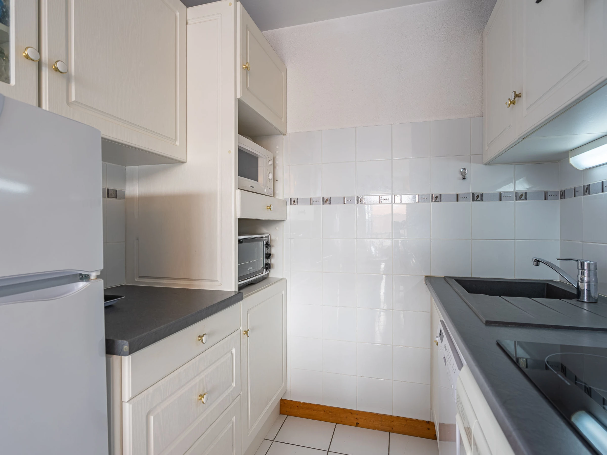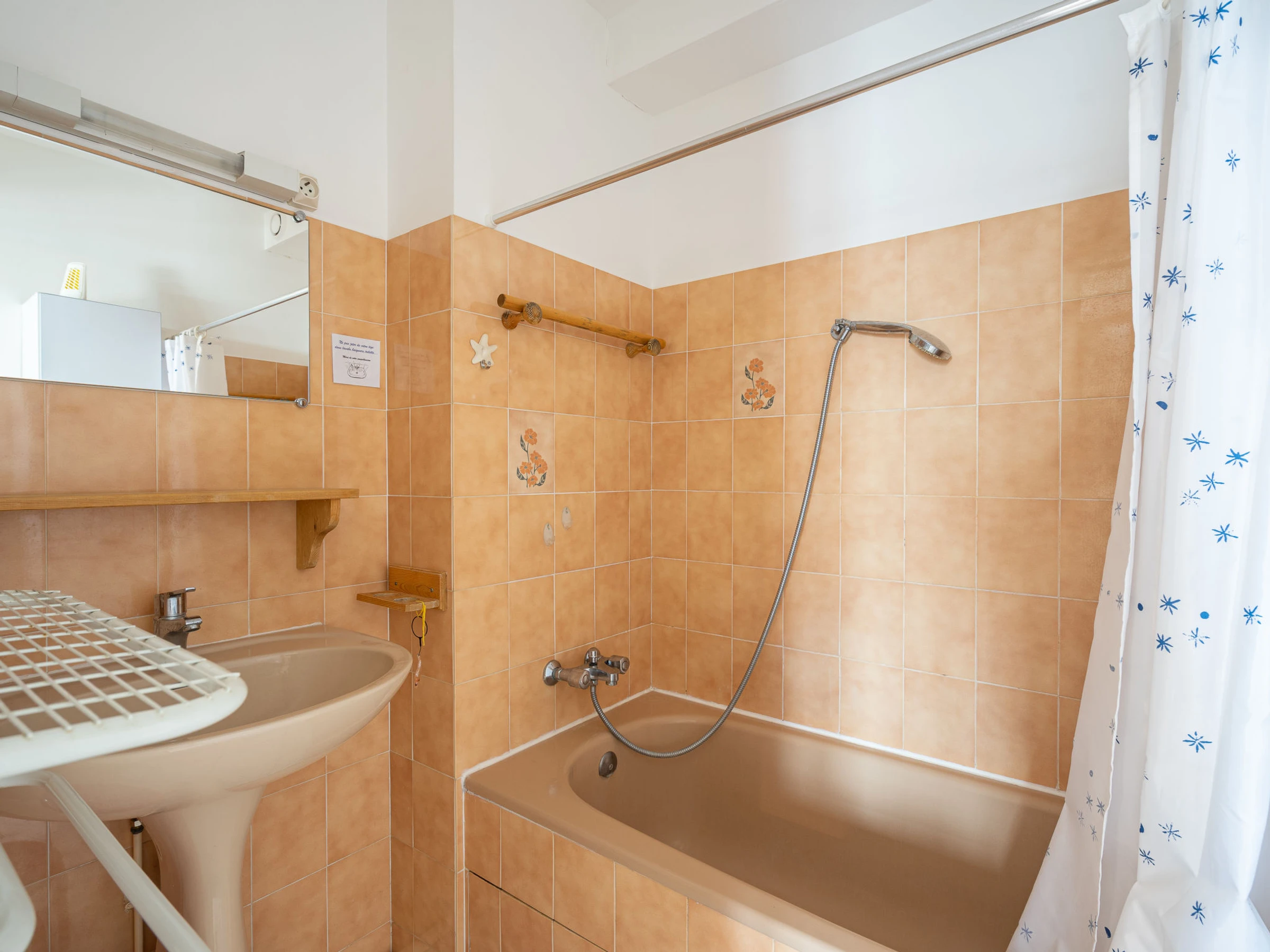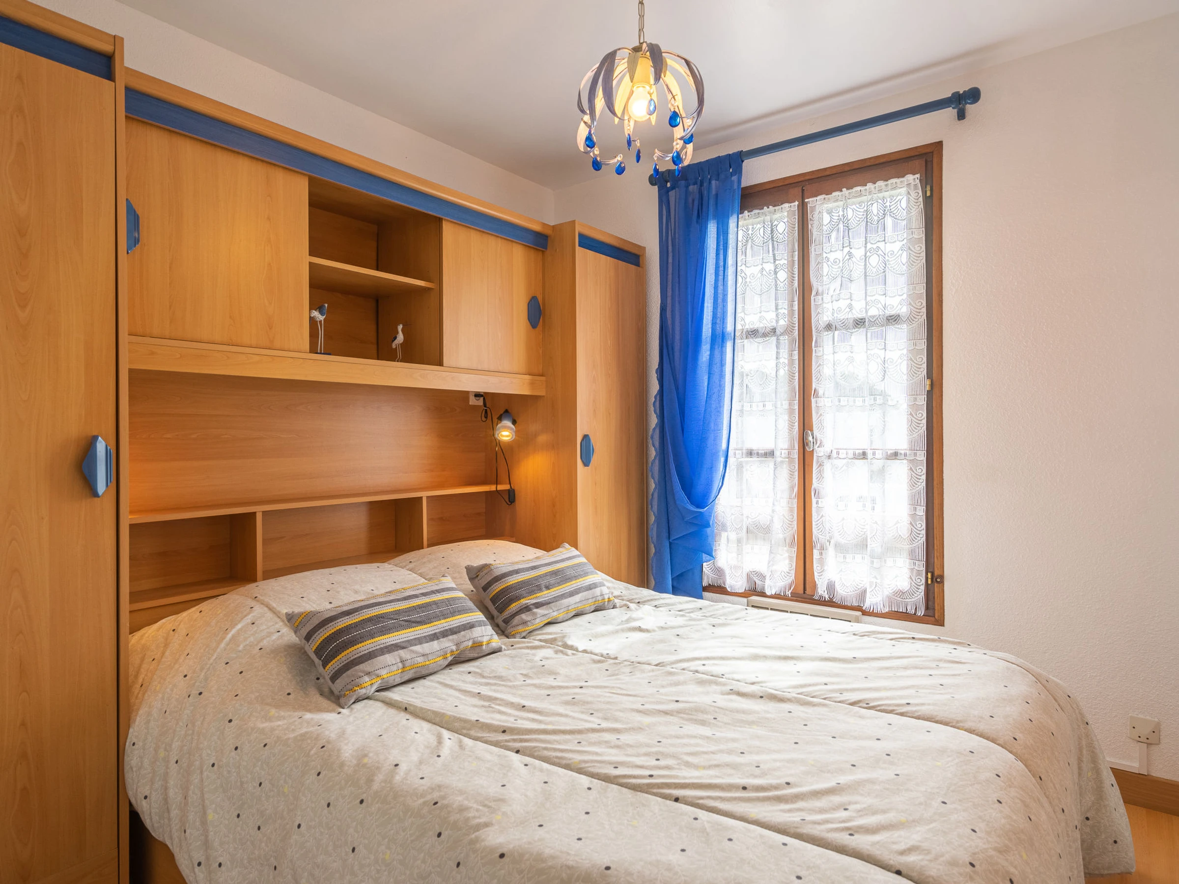 2-room apartment 33 m2 on 1st floor. Living/dining room with 1 double sofabed (1 x 140 cm, length 190 cm), TV (flat screen). Exit to the balcony. 1 room with 1 french bed (1 x 140 cm, length 190 cm). Kitchenette (mini-oven, dishwasher, 3 induction hot plates, microwave, freezer). Bathroom, sep. WC. Electric heating. Small balcony 6 m2, south-west facing position. Terrace furniture. Facilities: washing machine. Internet (WiFi, extra). Reserved parking space n 31. Please note: smoke alarm.